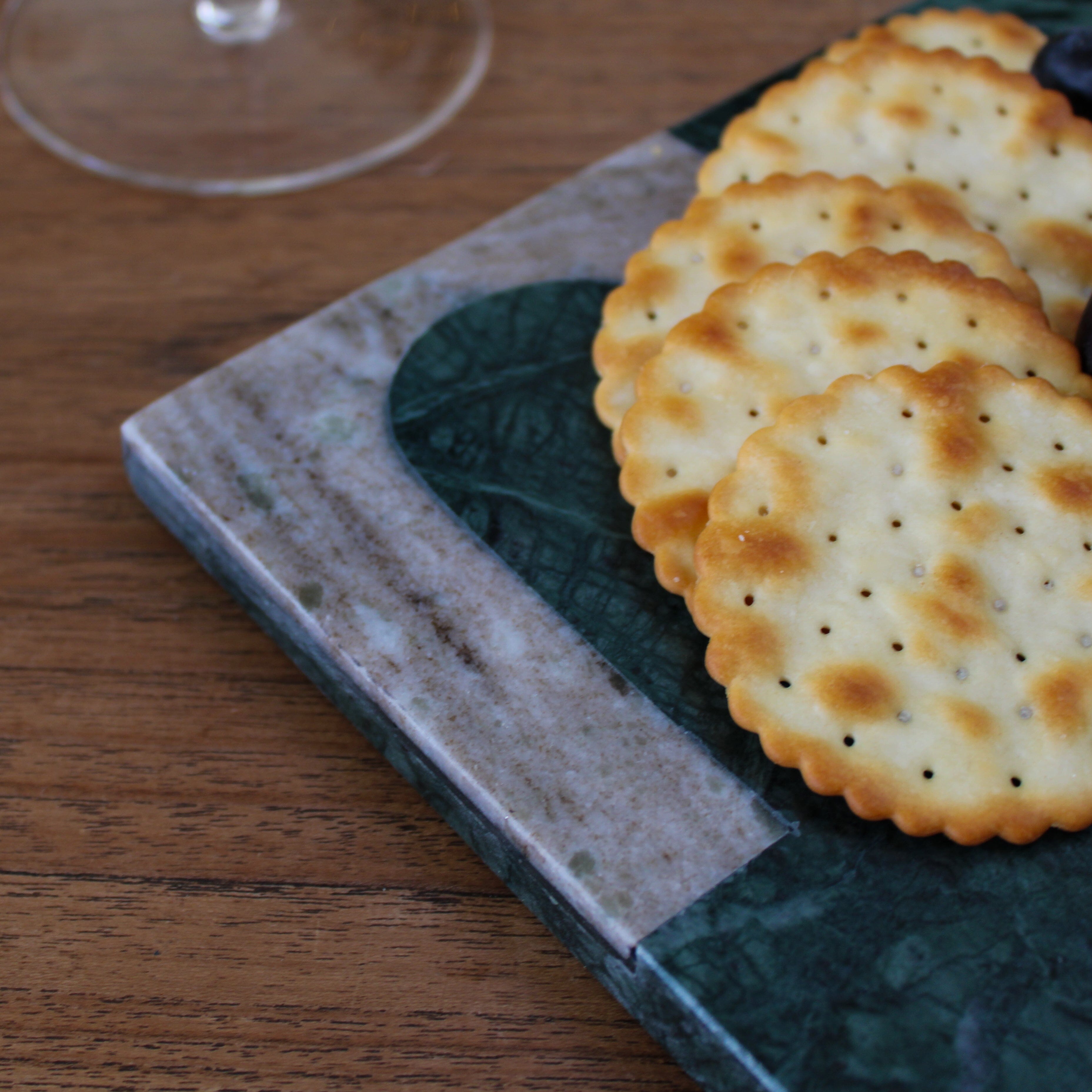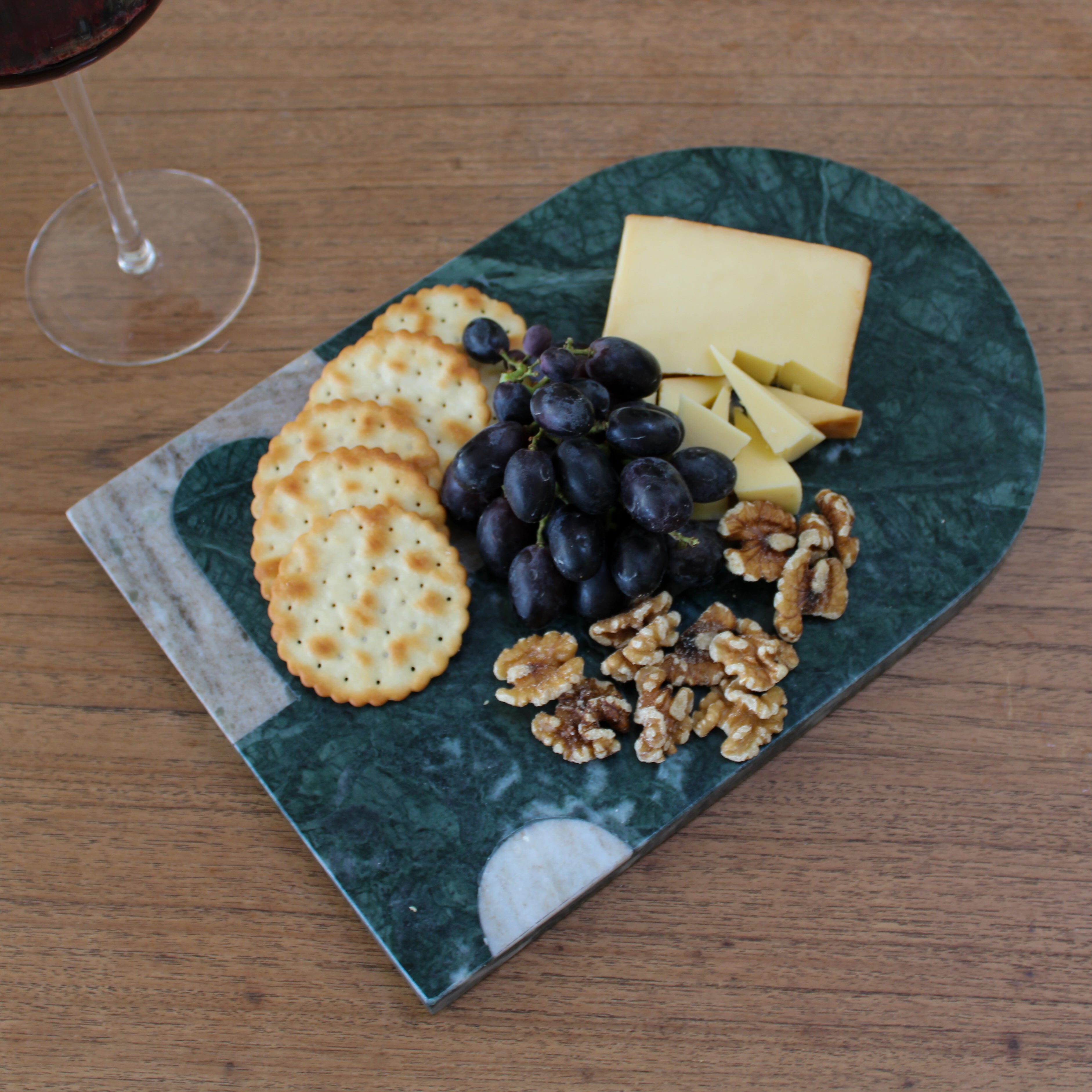 Elegantly crafted from natural marble, this green and white chopping board is a stylish addition to any kitchen. With its distinctive geometric pattern and attractive arched edge, it’s perfect for presenting food or serving a cheese board in a sophisticated and tasteful fashion. Enjoy the unique beauty of each piece and show it off on your kitchen counter as a stylish addition to your culinary endeavours.