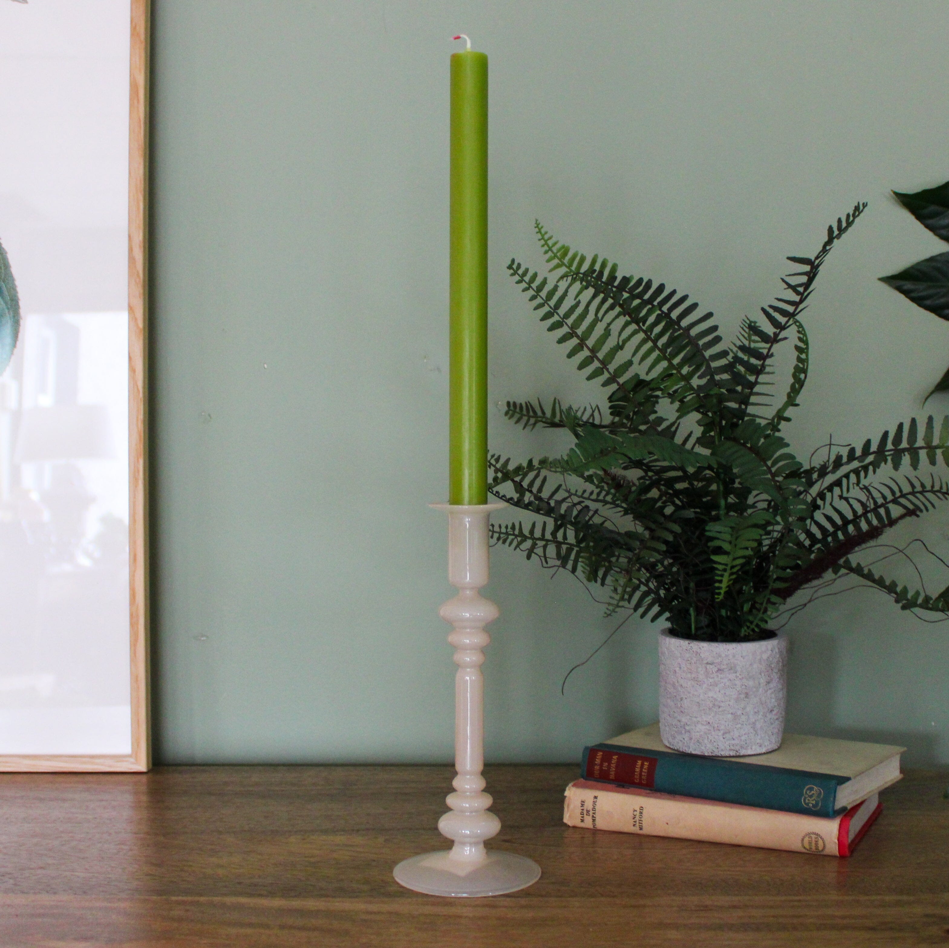 This elegant and minimalist glass candlestick adds an ethereal touch to any room. Its lightness and subtle beige hue make it a versatile choice with a brightly coloured candle or something more tonal. Search our True Grace dinner candle range for your own unique pairing with this beautiful glass candle holder.