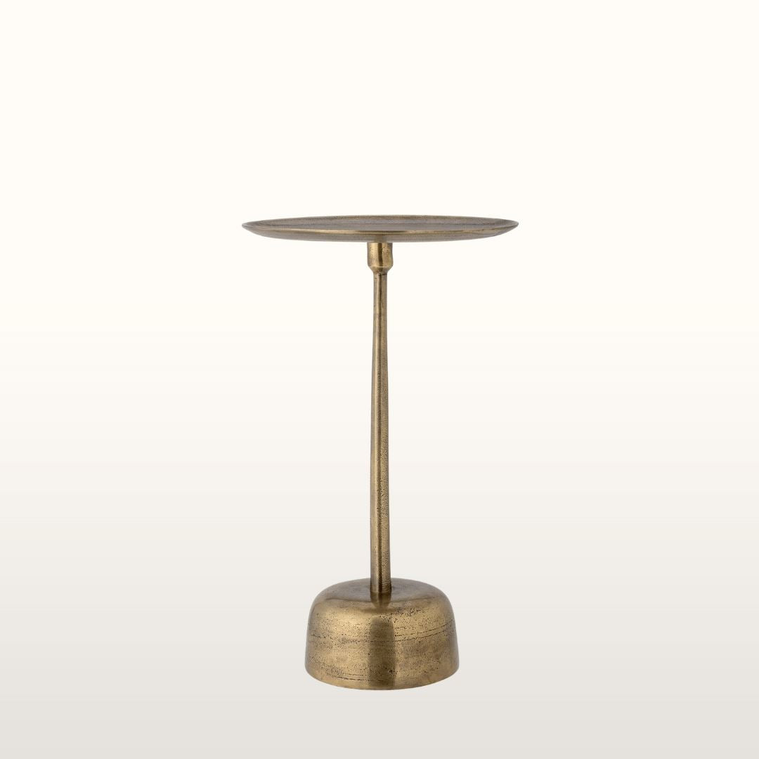 This rather fine brass metal side table is just the thing to perch next to your armchair or sofa for that extra resting place. It's a very neat little table with a small 30cm diameter table top and a solid base that will slot into any small space making it possible to pull out for extra guests when required. This table has a pleasing dappled finish and is straightforward to put together.