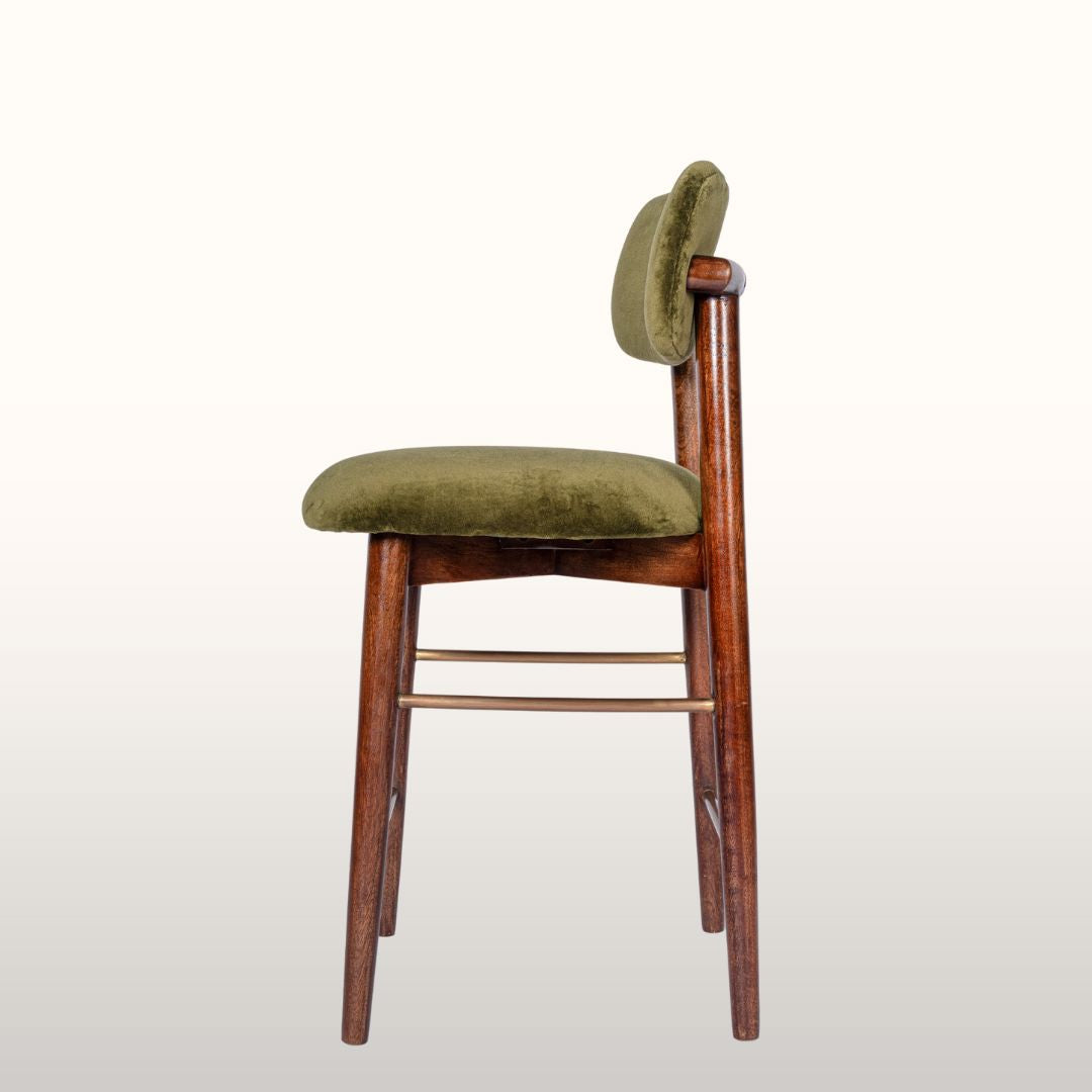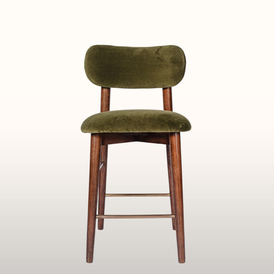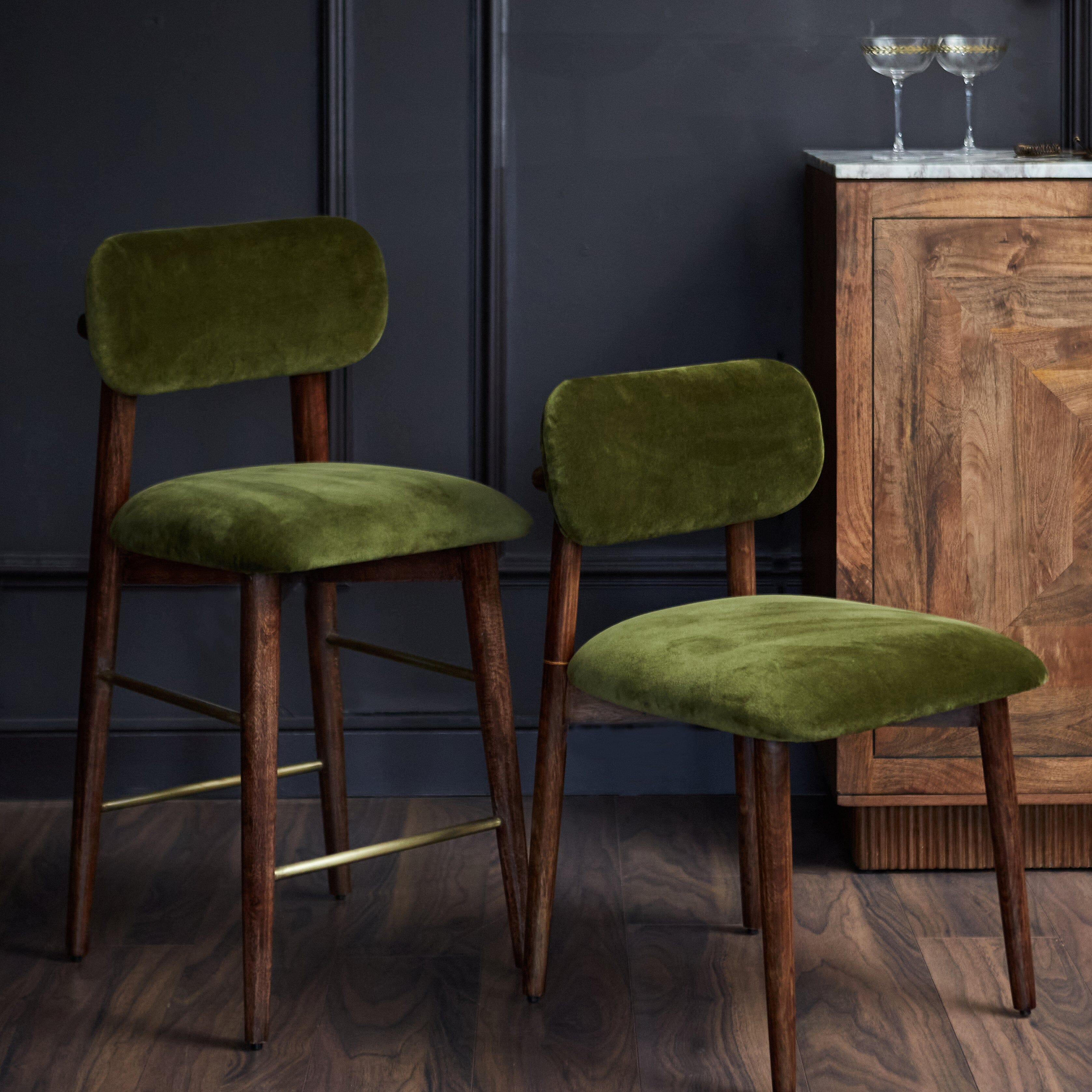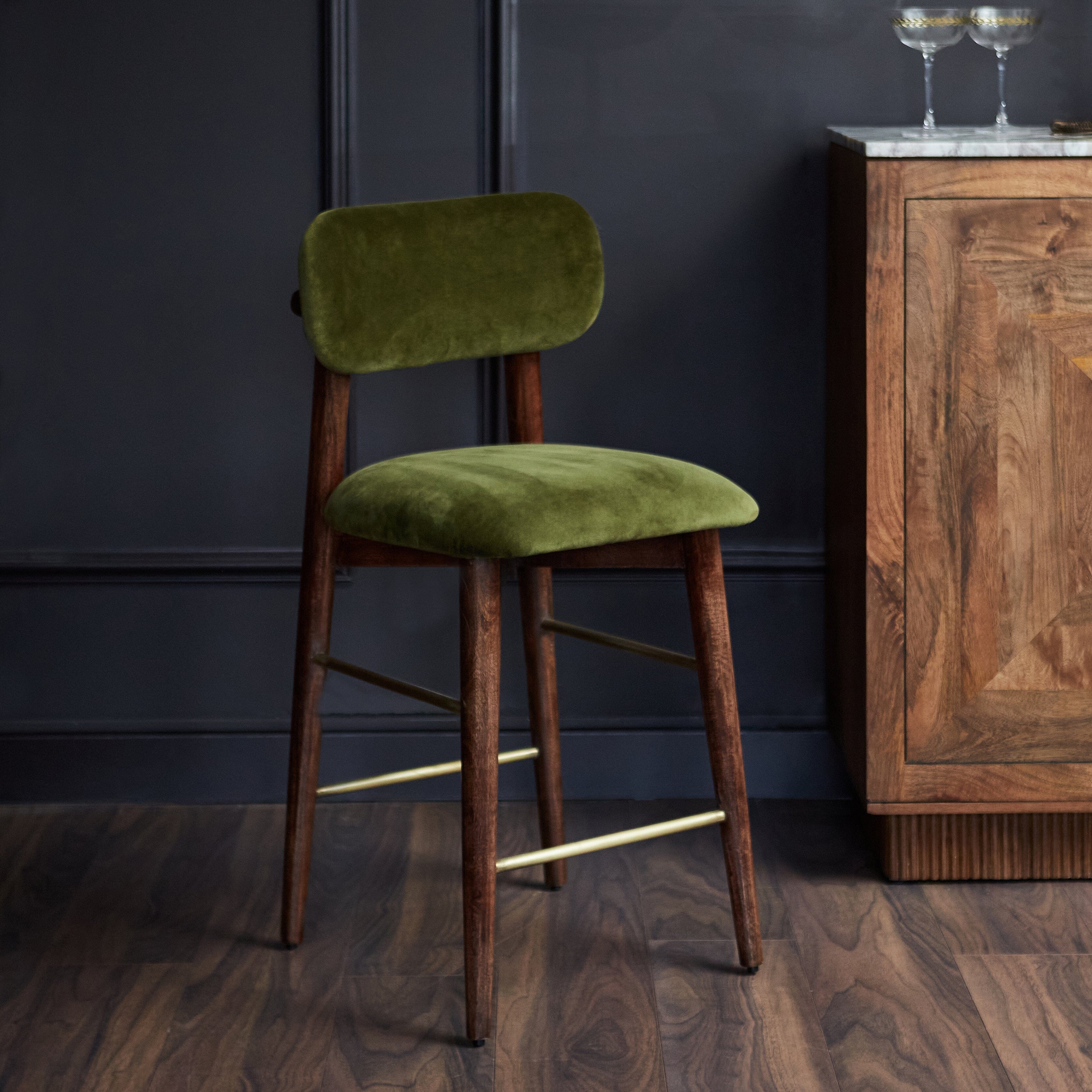 Designed by us here in Dublin, this is a really chic counter stool in a versatile green velvet.  This counter stool has a soft padded seat and back rest to make sitting at the kitchen island for a long lazy afternoon an absolute pleasure.  The green velvet upholstery is mounted on a mid brown mango wood frame with elegant brass cross bars.  A stylish cross bar behind the back rest gives a superbly elegant appearance and completes the look.  These are counter stools are to be enjoyed and admired and we think you will love and cherish them for many many years into the future.