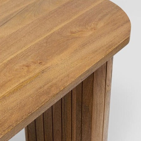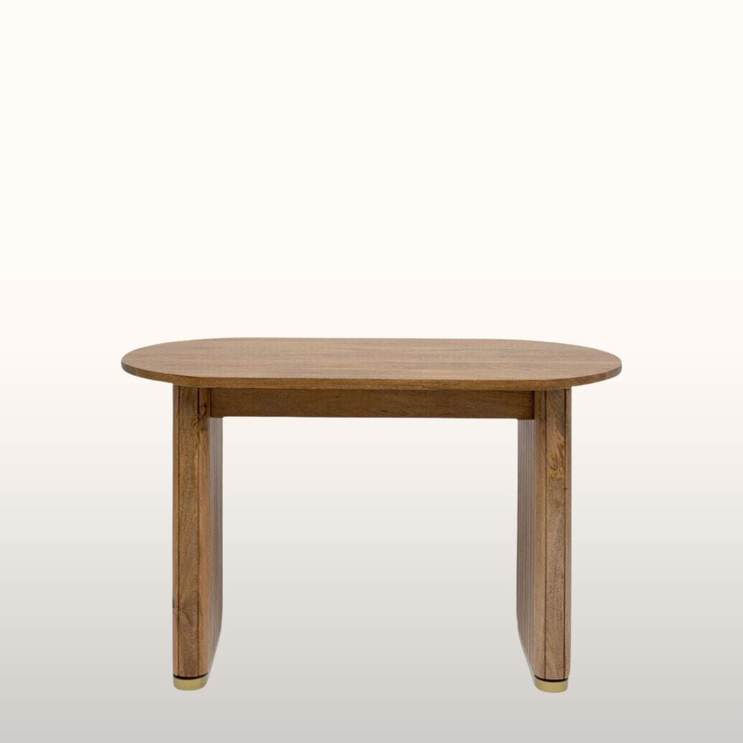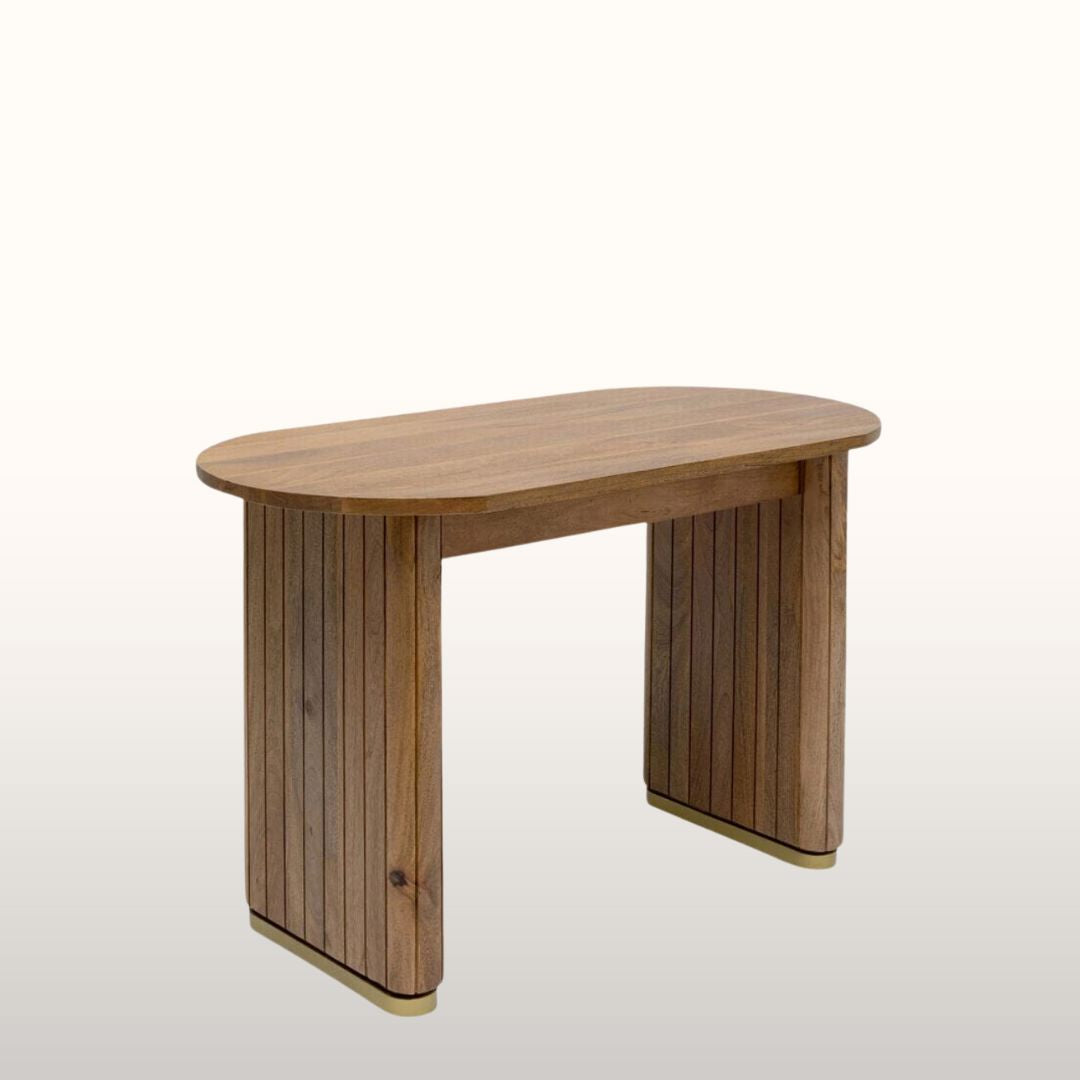 This Curved Reeded Natural Wood Desk is an exquisite addition to any home office. Meticulously crafted from mango wood with a neutral tone, its sleek and minimalist design is complemented by curved smooth top and reeded plinth legs, finished with an elegant brass trim. Its neat width is perfect for a comfortable office chair, creating a stylish and inviting space for productivity. Whether you’re looking to upgrade your work-from-home space or brighten up the living room with a multifunctional piece, this desk makes a luxurious statement.
