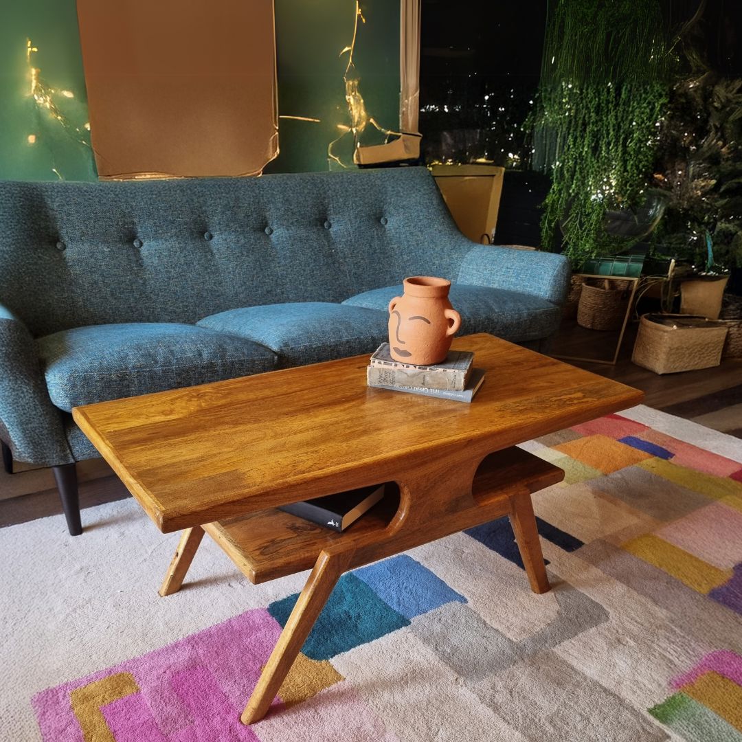 This gorgeous coffee table really ticks all of our boxes! The natural mango wood finish displays the beautiful grain of the wood while giving a smooth and gently curved surface. We love the retro design with splayed legs, while the two tiers provide perfect magazine storage (or a way to hide pesky remotes!). The size is the perfect length for a three seater sofa while the depth makes it a neat fit in a narrow space.