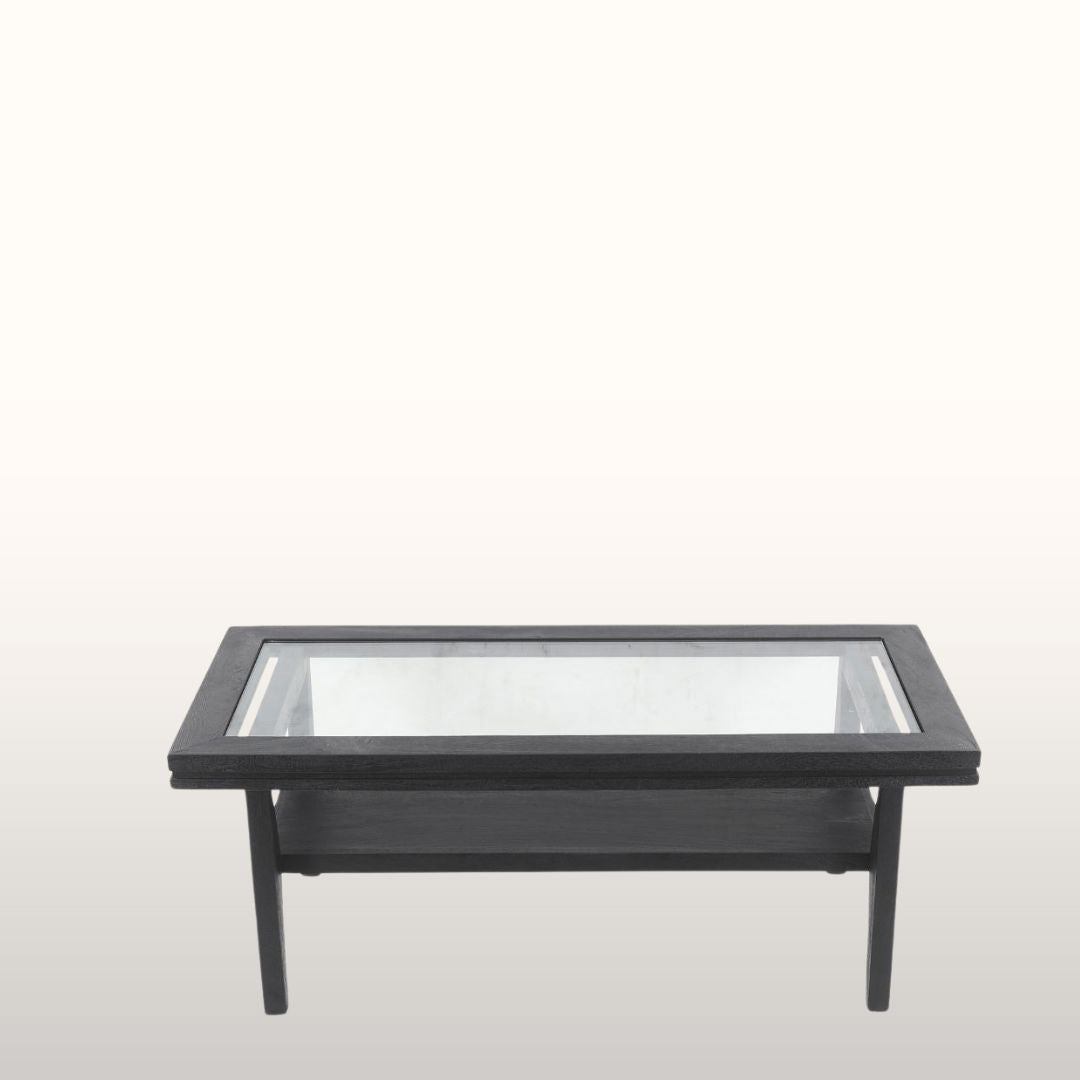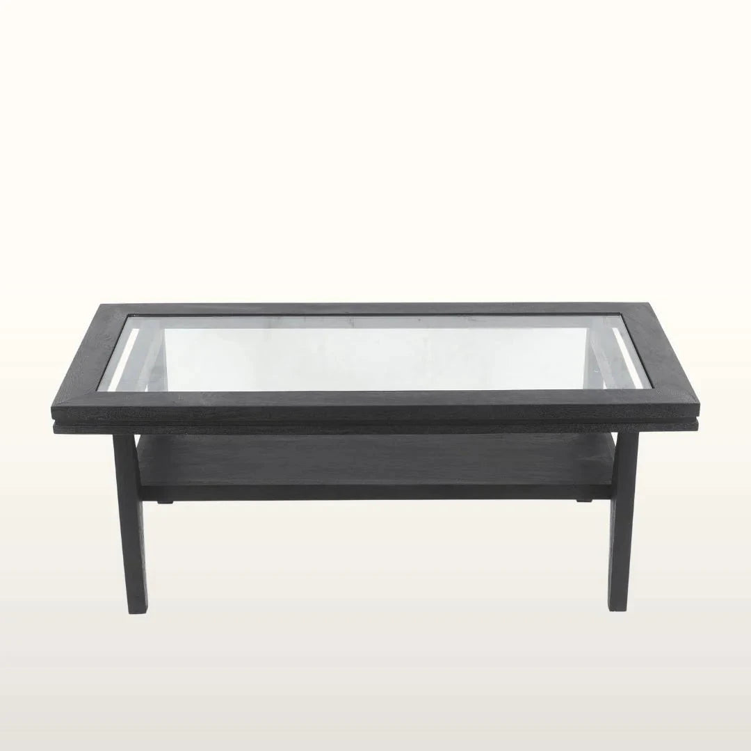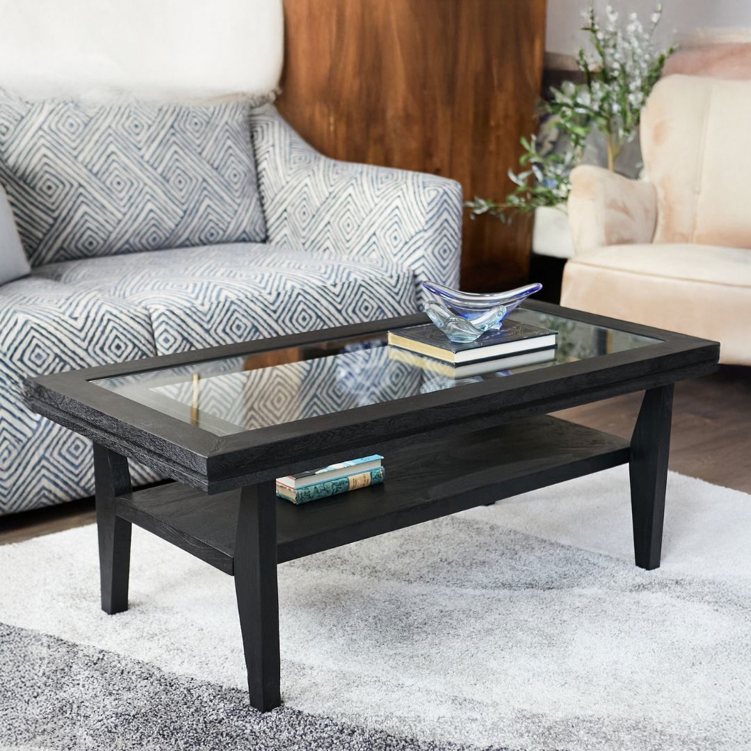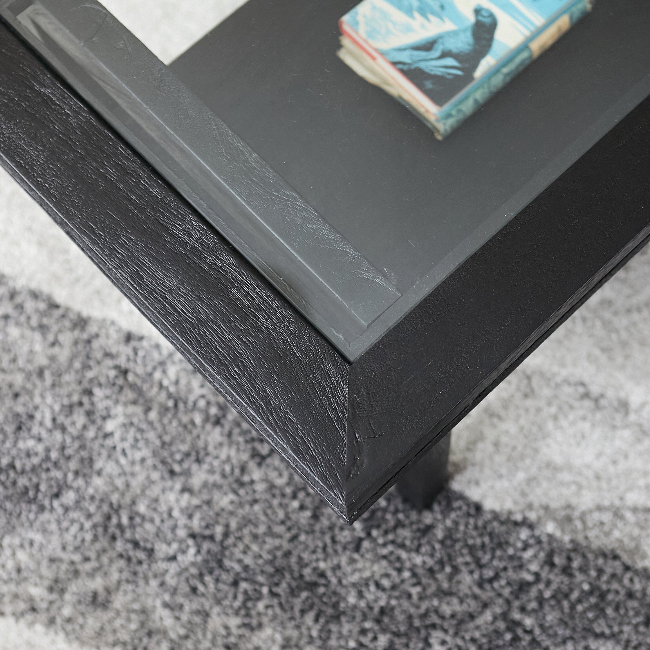 One of our original designs, this handsome black glass coffee table is the perfect completion piece for your living room.  We designed this piece to work really well with full size sofas that go straight to the floor as the design provides a good contrast to a  fabric or leather sofa base.  The removable glass insert provides a look through to the handy shelf below allowing for books or other ornaments to be beautifully arranged but still ensuring you have lots of table top space!  The edges of this table have a deep groove that matches with our Inlay cabinet collection.