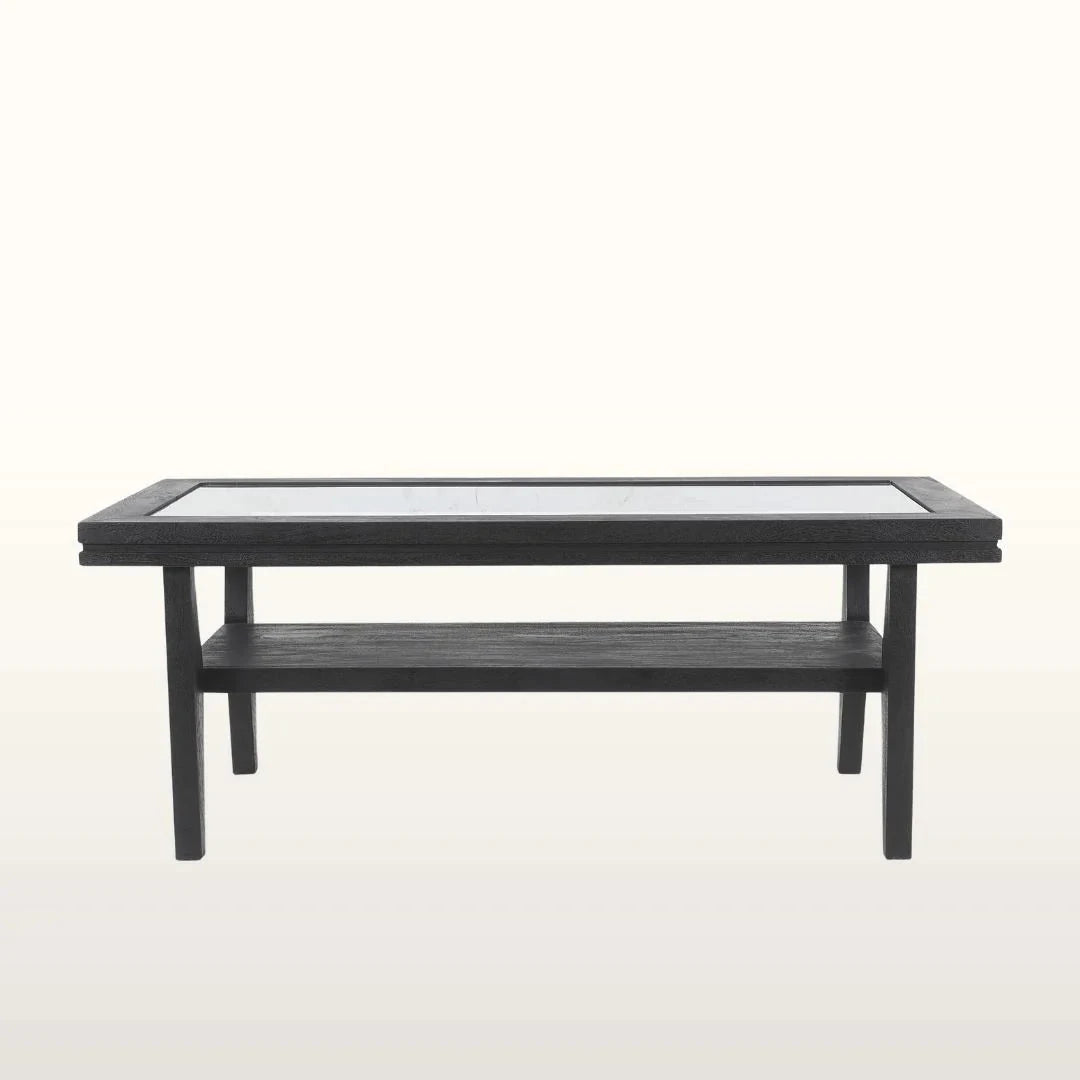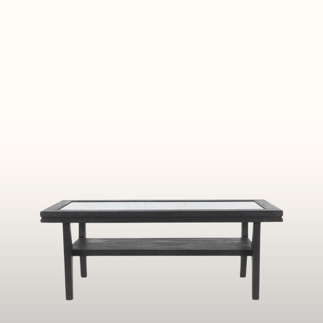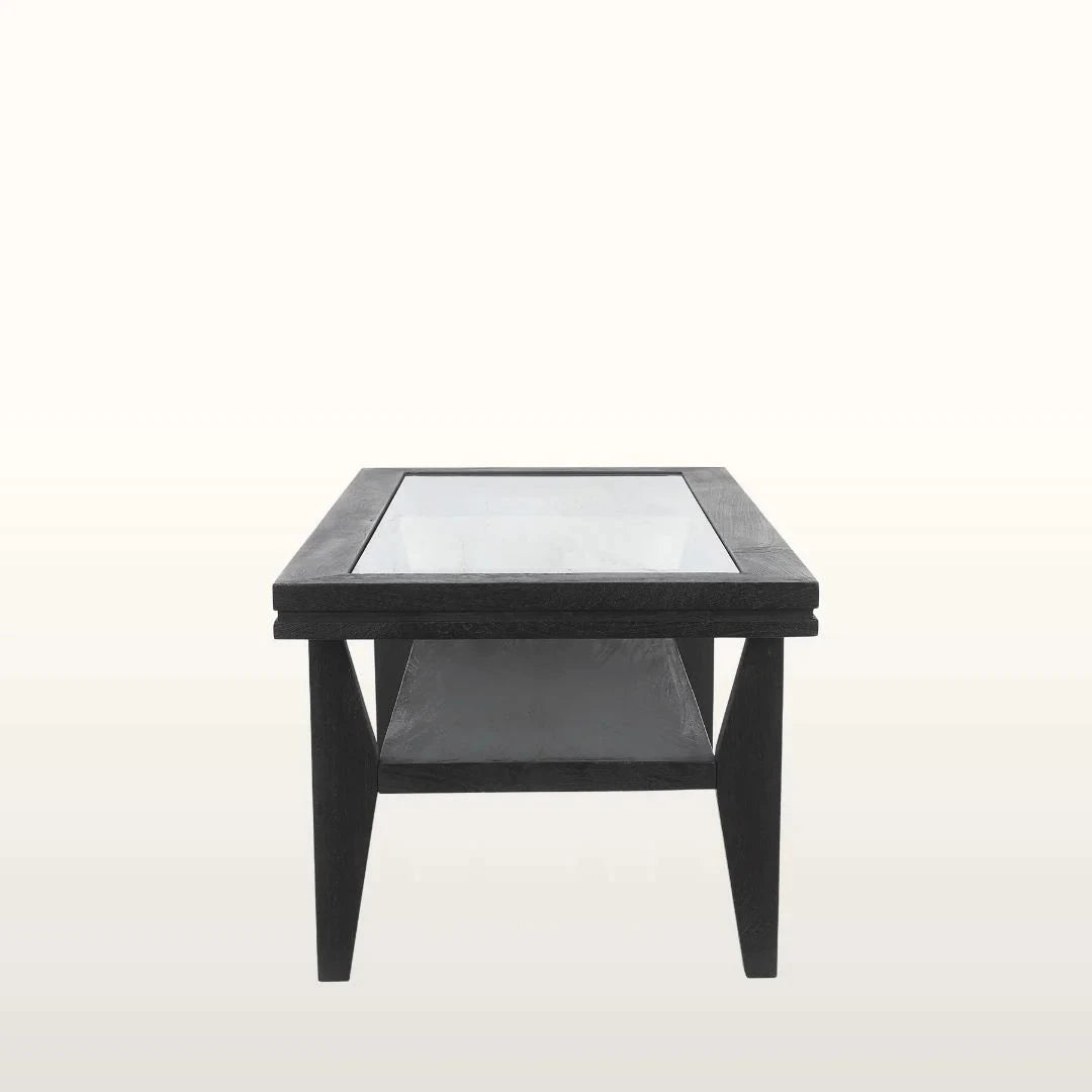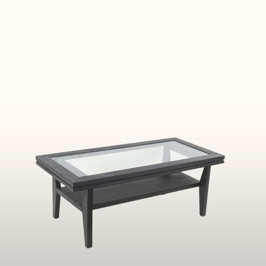 One of our original designs, this handsome black glass coffee table is the perfect completion piece for your living room.  We designed this piece to work really well with full size sofas that go straight to the floor as the design provides a good contrast to a  fabric or leather sofa base.  The removable glass insert provides a look through to the handy shelf below allowing for books or other ornaments to be beautifully arranged but still ensuring you have lots of table top space!  The edges of this table have a deep groove that matches with our Inlay cabinet collection.