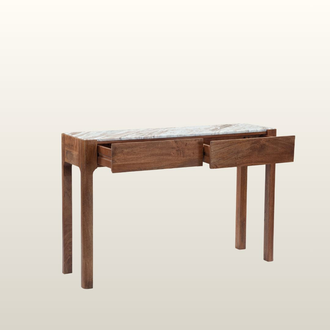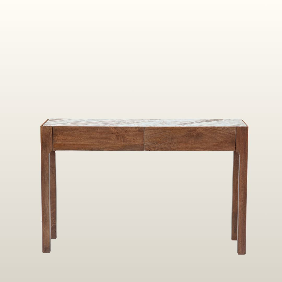 It has two deep drawers and a very fine slightly inlaid white marble top. At 125cm wide, this console table will sit behind sofas or in hallways and really hold it's own.
