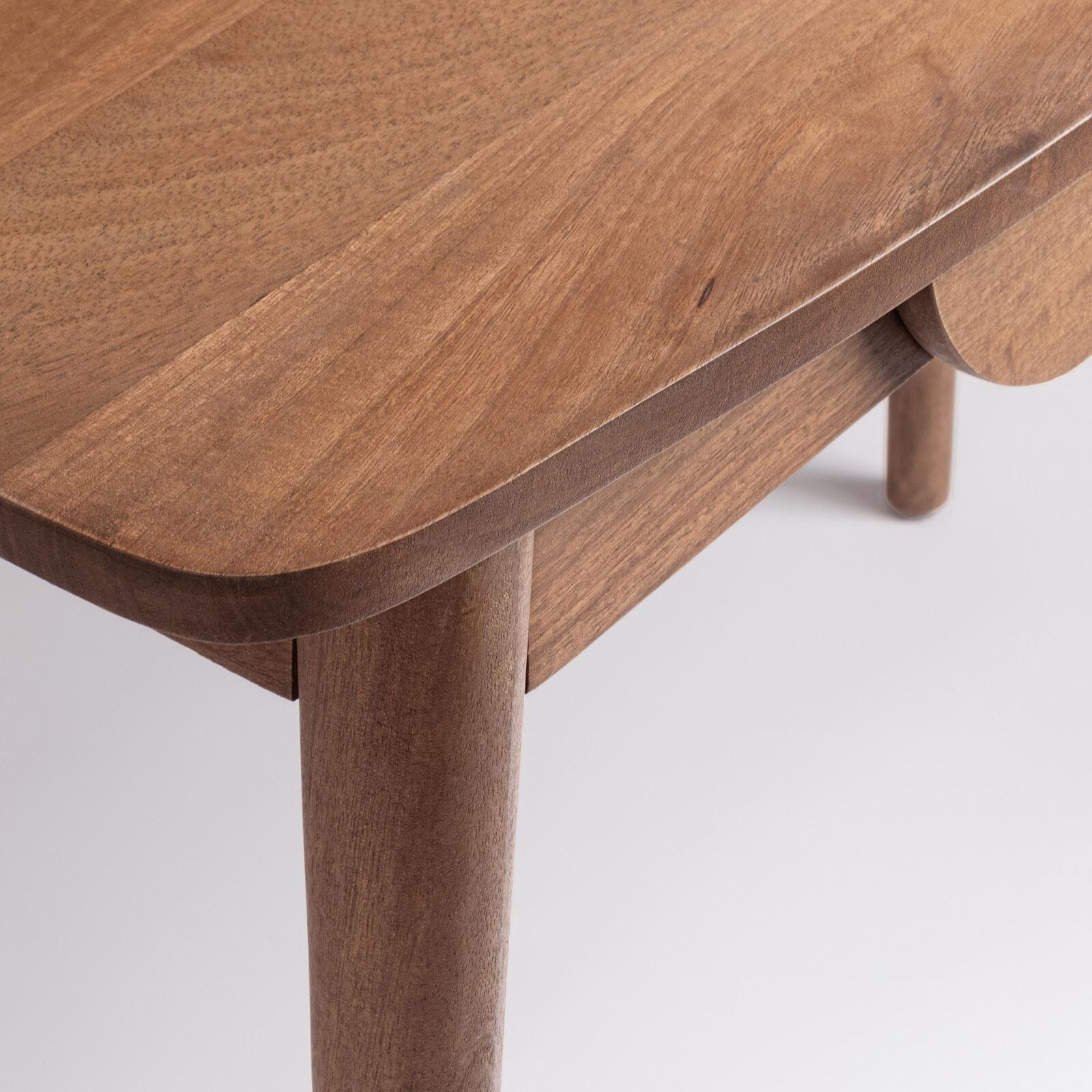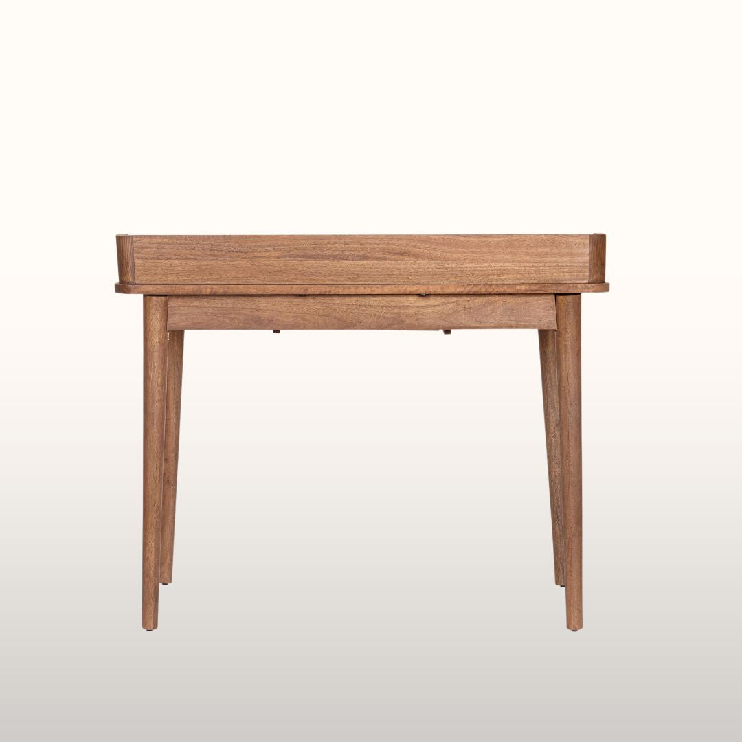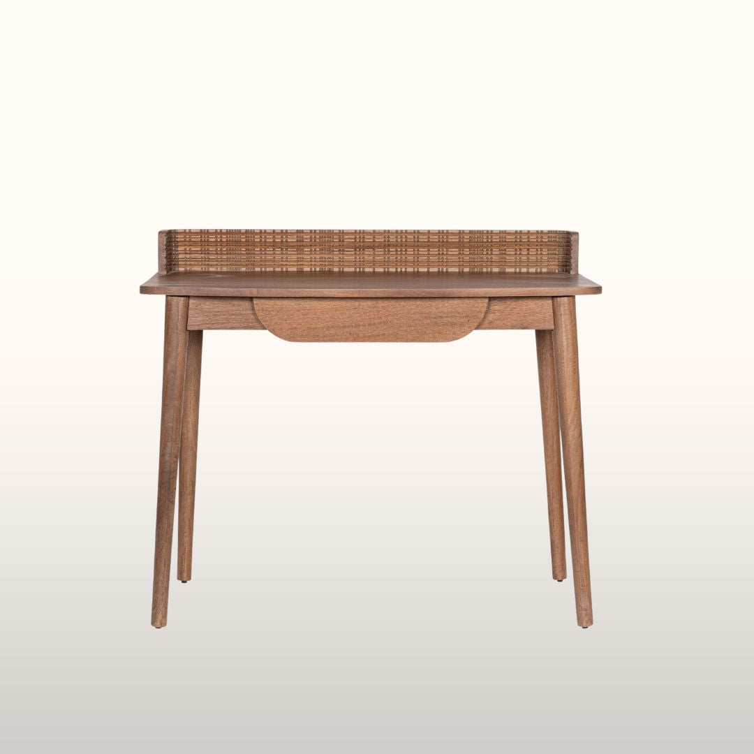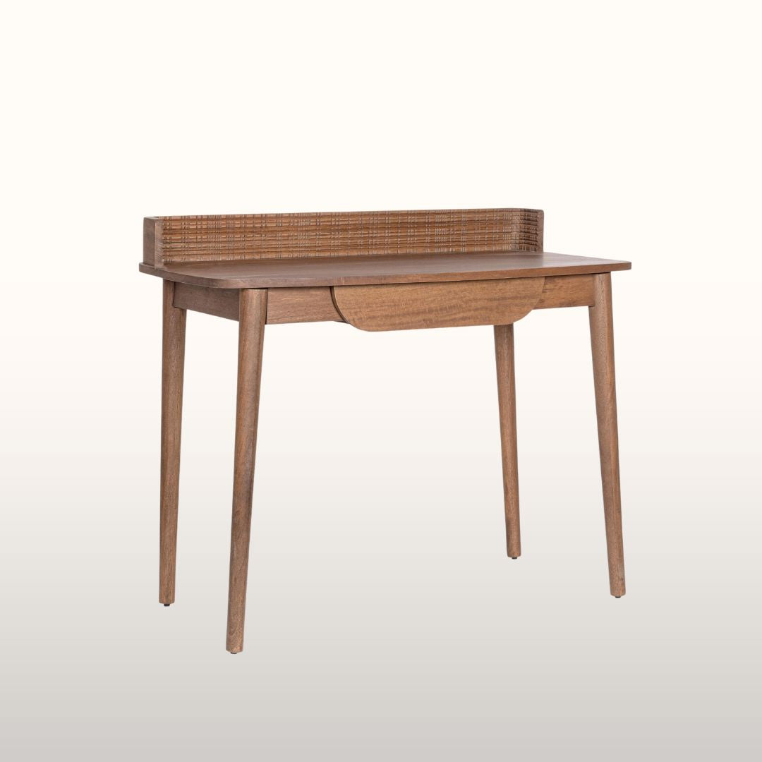 A beautiful medium stained mango wood desk with warm tones in its surface materiality. This stand alone unit has storage available in the form of one single drawer! This stunning structured design is elegant while useful. This design includes a decorative backing detail with eye-catching wooden carving. This desk is perfect for your home office or would sit nicely in an open plan living space.