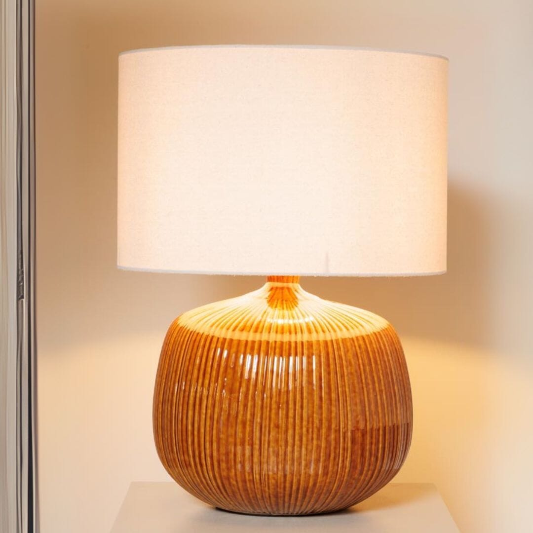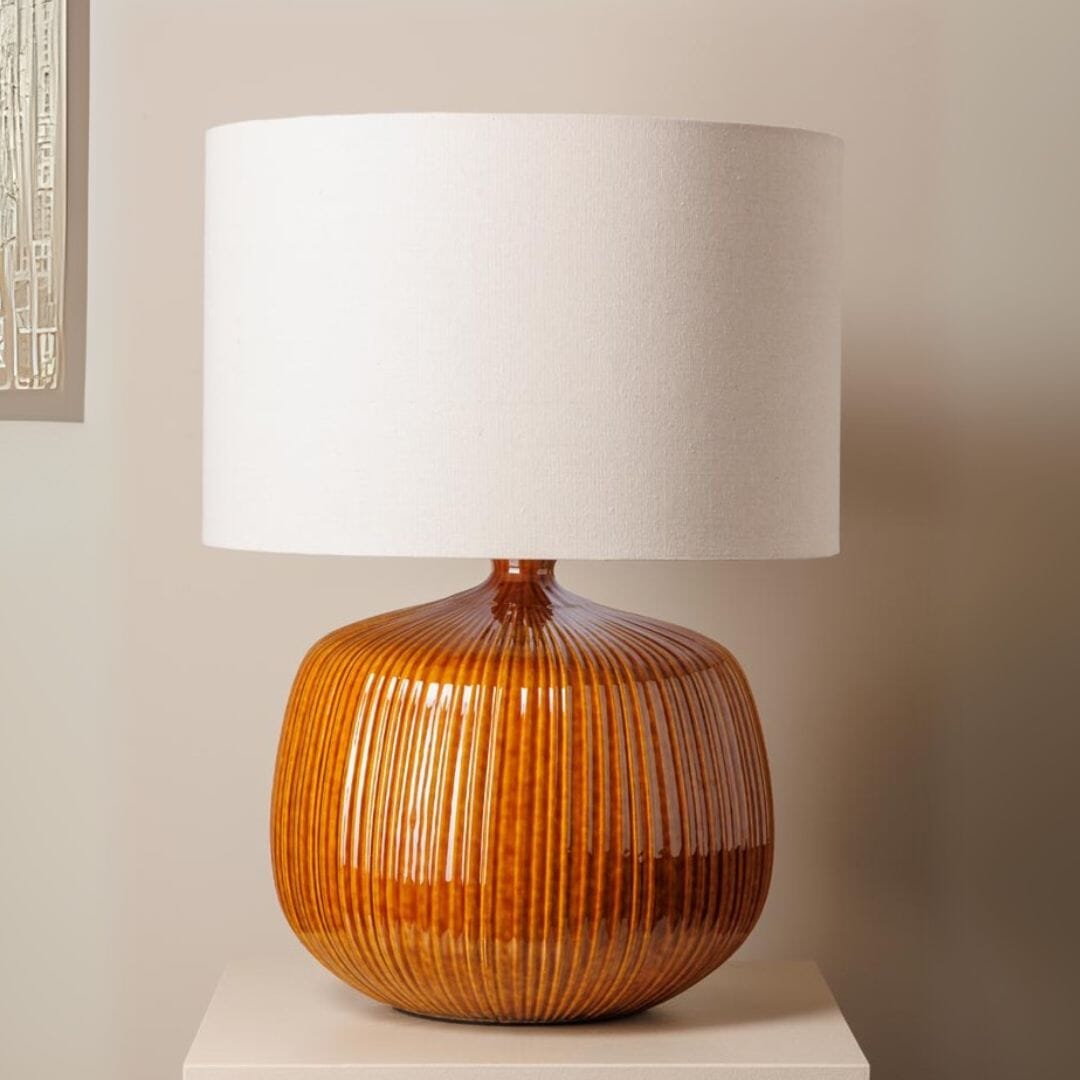 This gorgeous table lamp has us swooning.  The sandstone base is a ridged squoval shape which is tactile to the touch and fabulously created in a warm and cosy ochre colour.  Topped with a neutral off white linen shade that diffuses light beautifully into your room, this tidy lamp is sure to be a winning addition to your space.  The size of this lamp lends itself to a statement finish in a living room hallway.