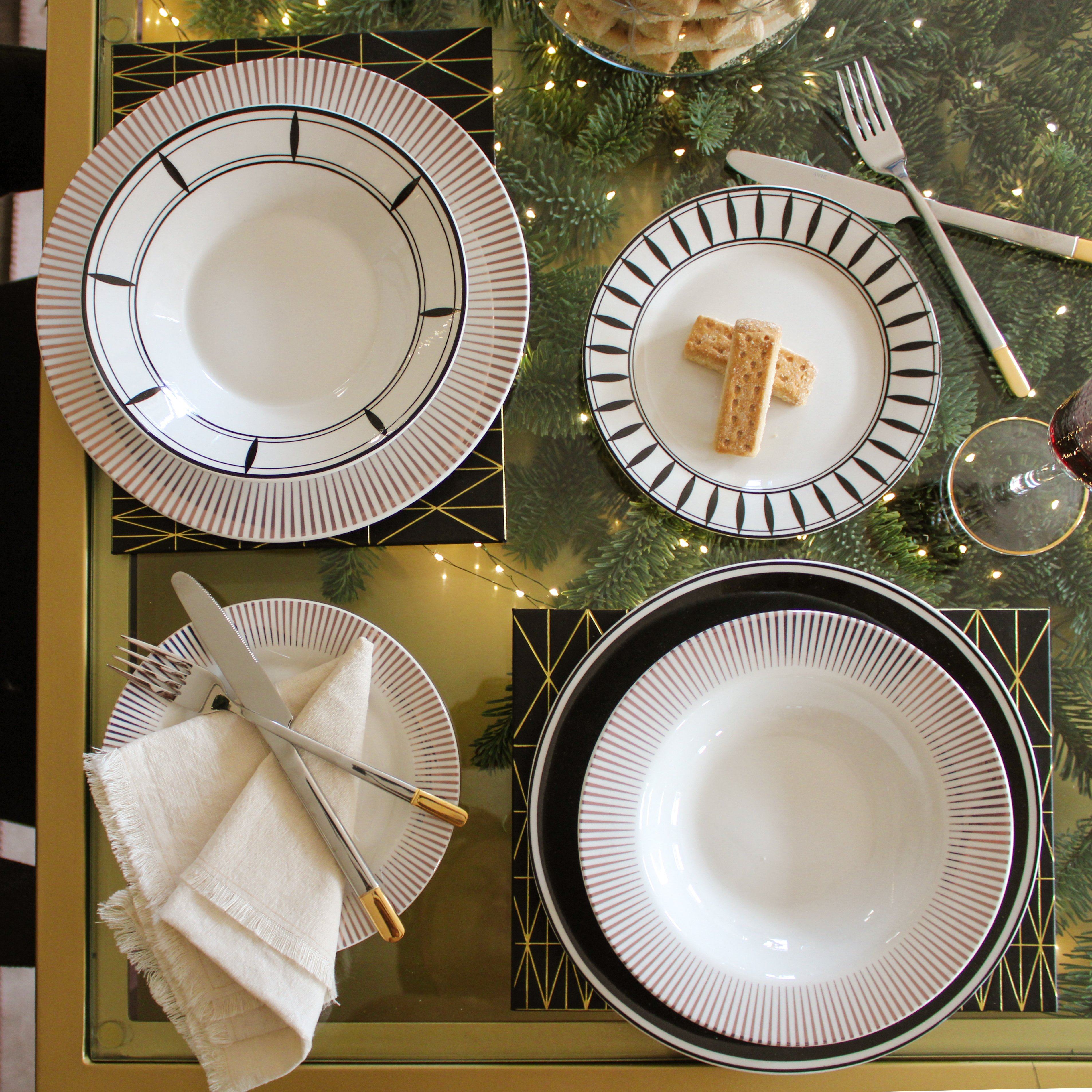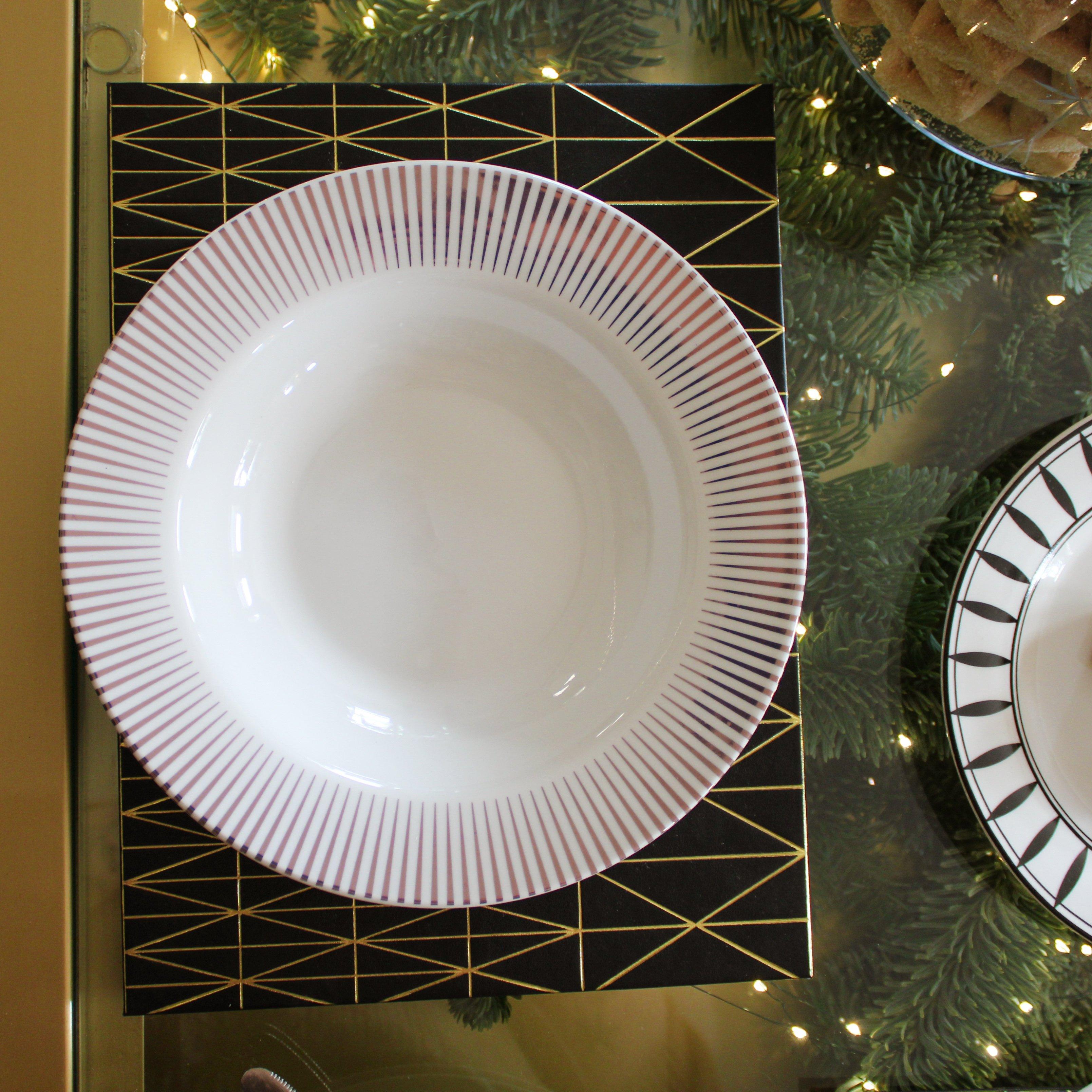 The Oriana B. Christmas dining collection 2021 is a mix and match selection of fabulous monochrome and gold sunburst crockery. Choose from dinner plates, side plates and bowls and mix patterns and designs to create your own unique Christmas table. Our Christmas crockery is made of porcelain, has a smooth glaze finish and is dishwasher safe meaning low stress on Christmas Day!