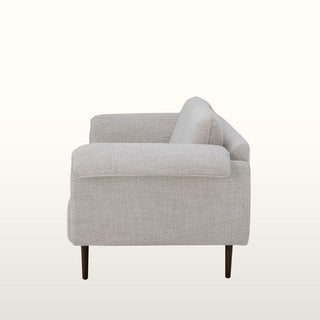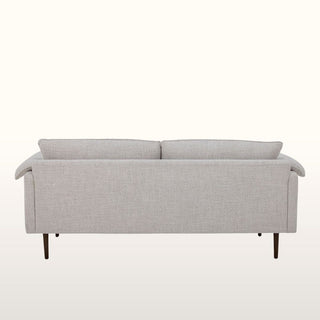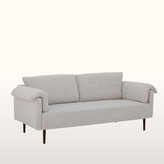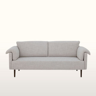 We are so taken with the quiet cool of this White Foldover Arm Sofa. With a sleek and modern design, this sofa embodies a cool and minimalist aesthetic. The pale grey woven fabric is durable and easy to care for, while the single seat cushion and fold over arm detail provide comfort as well as design edge. Complete with tapered black legs, this piece is perfect for any cool-toned room.