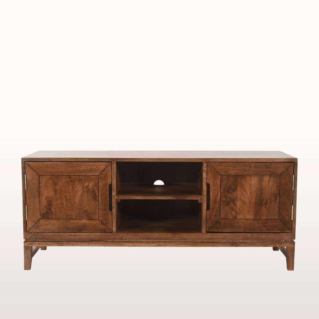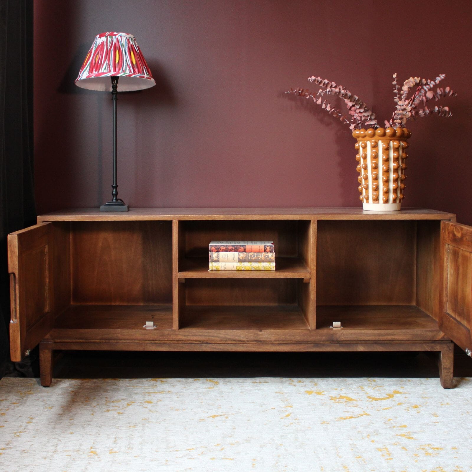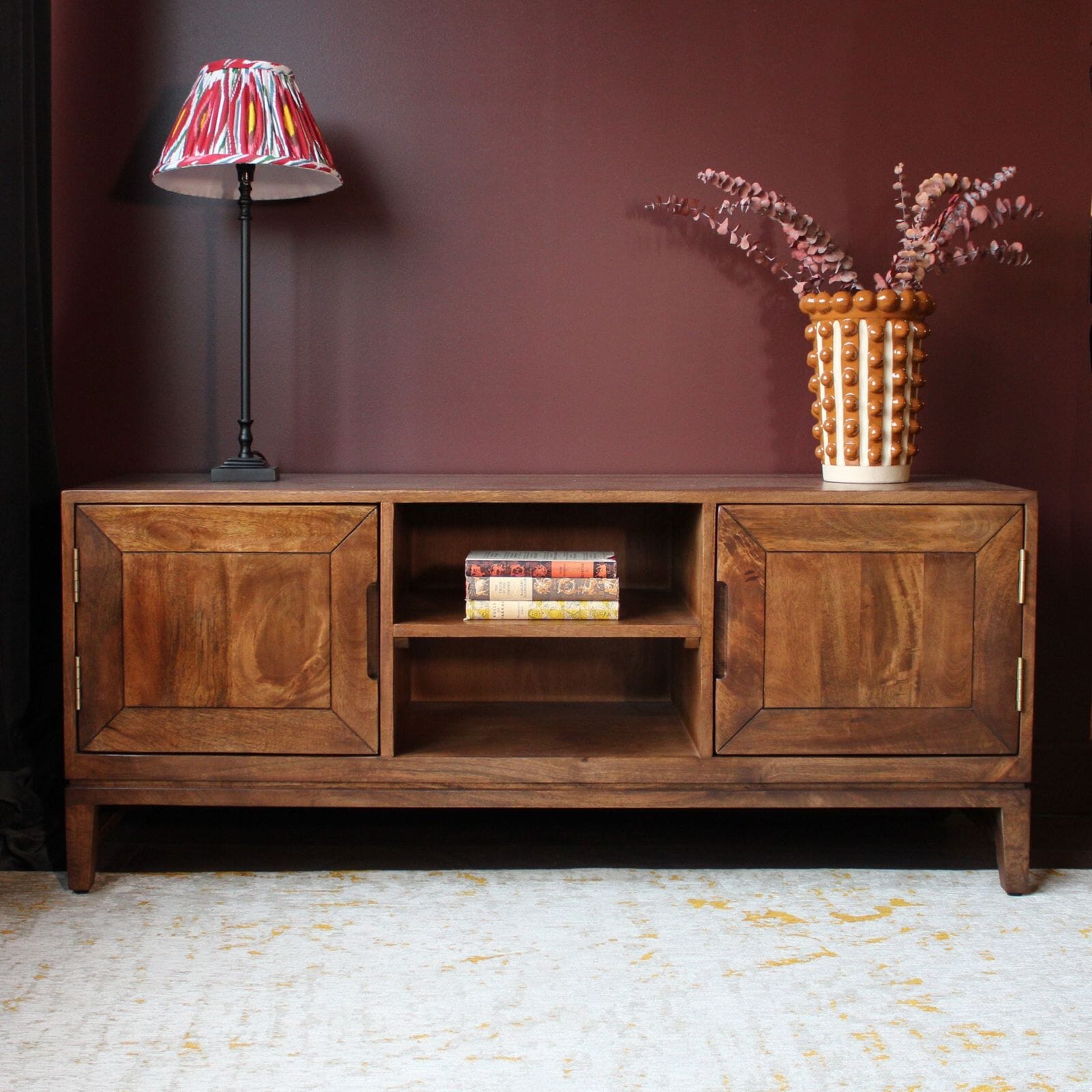 This beautiful tv cabinet is a neat in proportion but packs a huge punch in design! The marquetry tv unit is just 120cm width which is ideal for filling smaller alcoves and giving your tv the mounting it deserves! Our marquetry design features two immaculately bordered doors neatly inlaid with concealed handles and mounted with piano hinges for a very considered aesthetic. The cabinet is mounted on an immaculate leg base with a shadow gap between cabinet and legs that raises the design bar. The central section has an open shelf for media units and a handy hole in the back for wiring although we have also allowed for a disc cover so that if you don't use it for wiring, you are not staring at an empty hole!