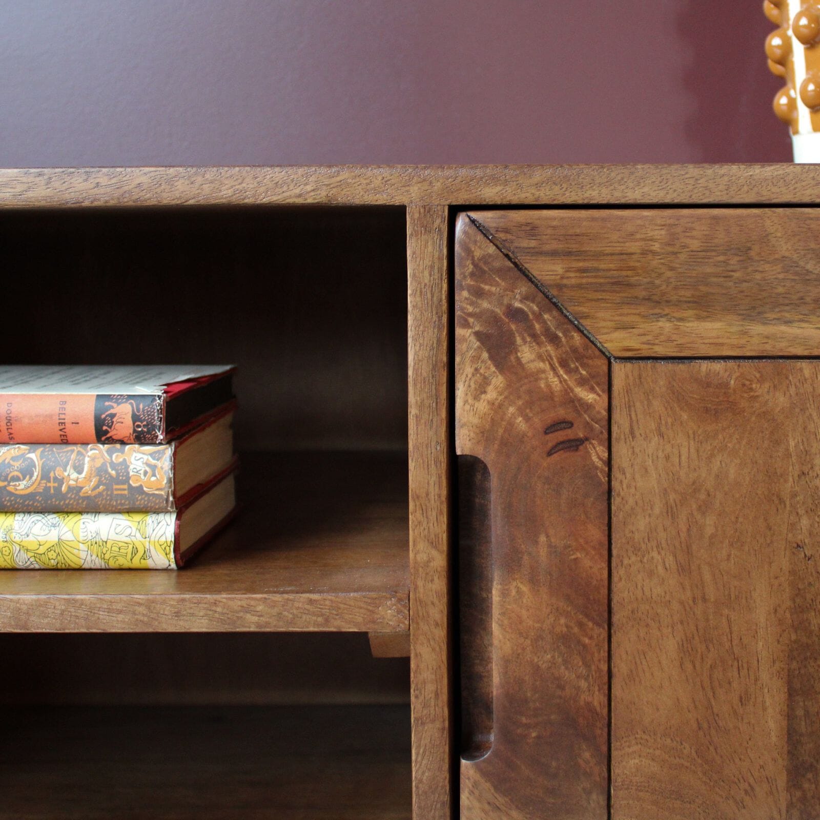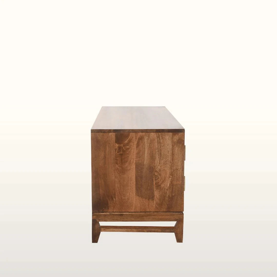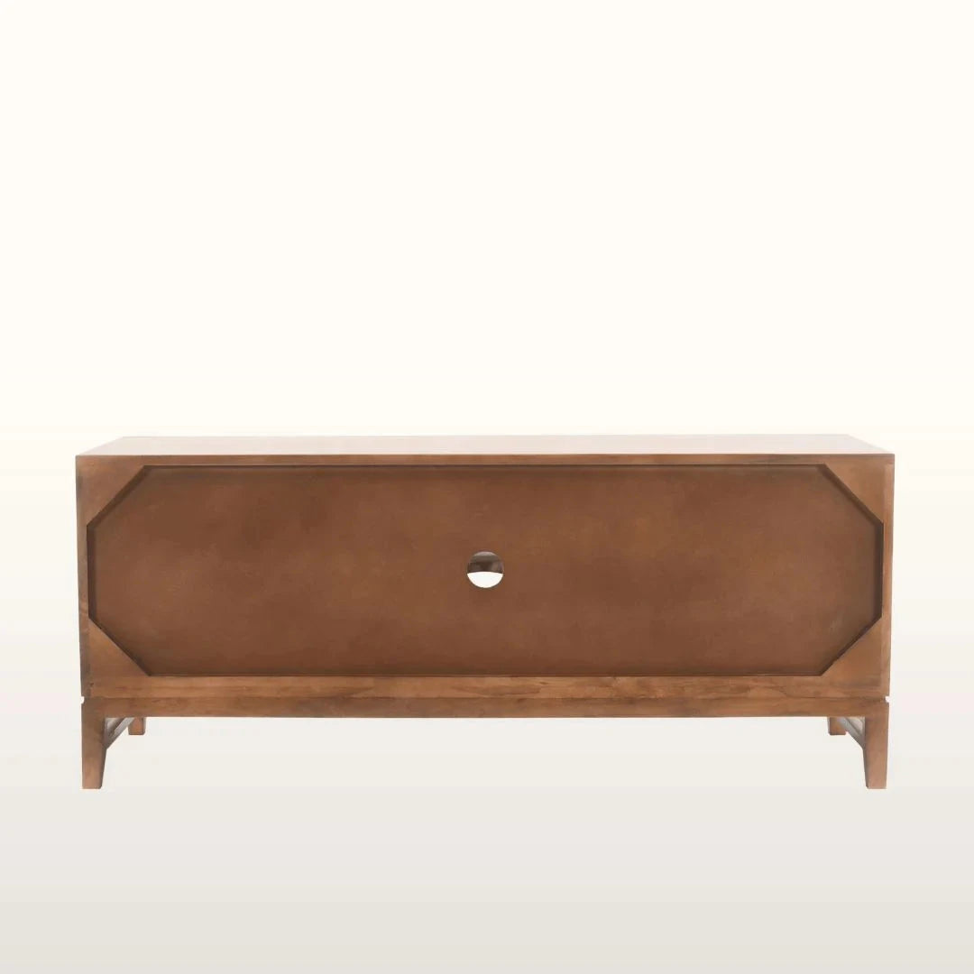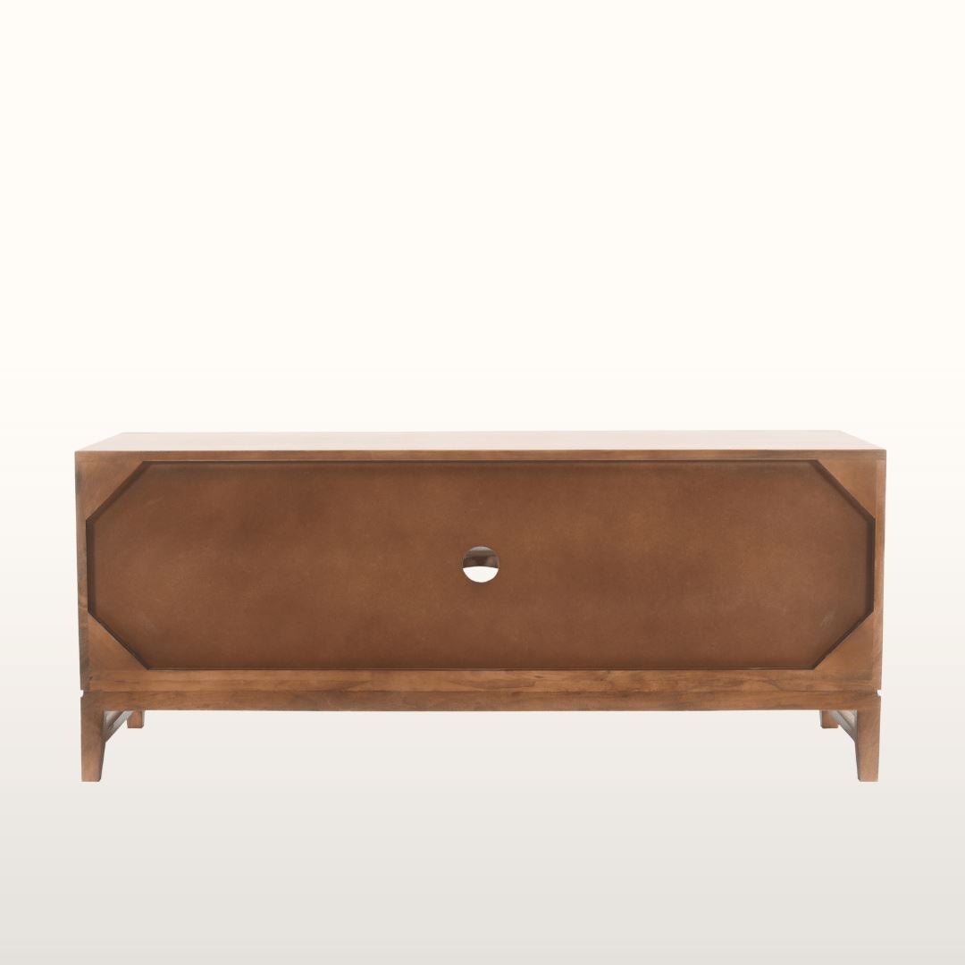 This beautiful tv cabinet is a neat in proportion but packs a huge punch in design! The marquetry tv unit is just 120cm width which is ideal for filling smaller alcoves and giving your tv the mounting it deserves! Our marquetry design features two immaculately bordered doors neatly inlaid with concealed handles and mounted with piano hinges for a very considered aesthetic. The cabinet is mounted on an immaculate leg base with a shadow gap between cabinet and legs that raises the design bar. The central section has an open shelf for media units and a handy hole in the back for wiring although we have also allowed for a disc cover so that if you don't use it for wiring, you are not staring at an empty hole!