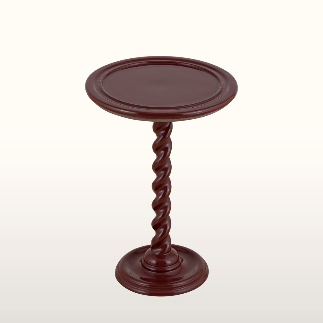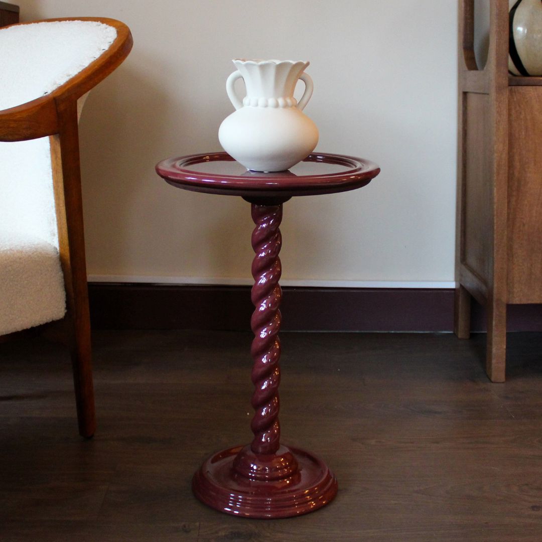 This fabulous pedestal side table in a rich burgundy colour is the table that you have been craving and needing!  The gorgeous deep red lacquer finish and twisted table base give this table instant wow factor and lends your home a considered and polished accent.  It's also extremely useful as pedestal tables can be moved around quickly and easily to provide a perch for a drink and their single stem means that they look clean and tidy against other furniture.  A real winner of a side table!