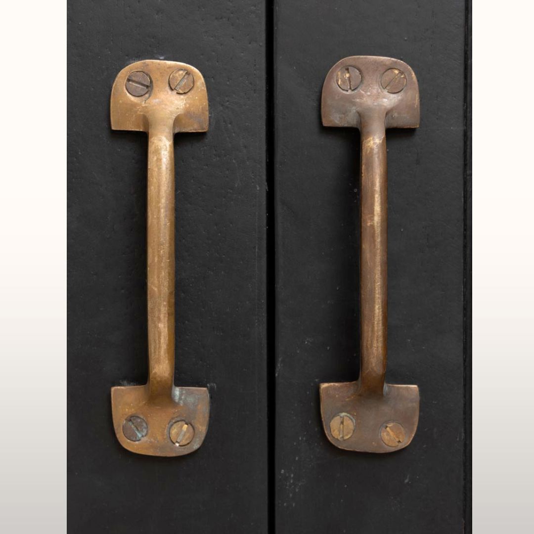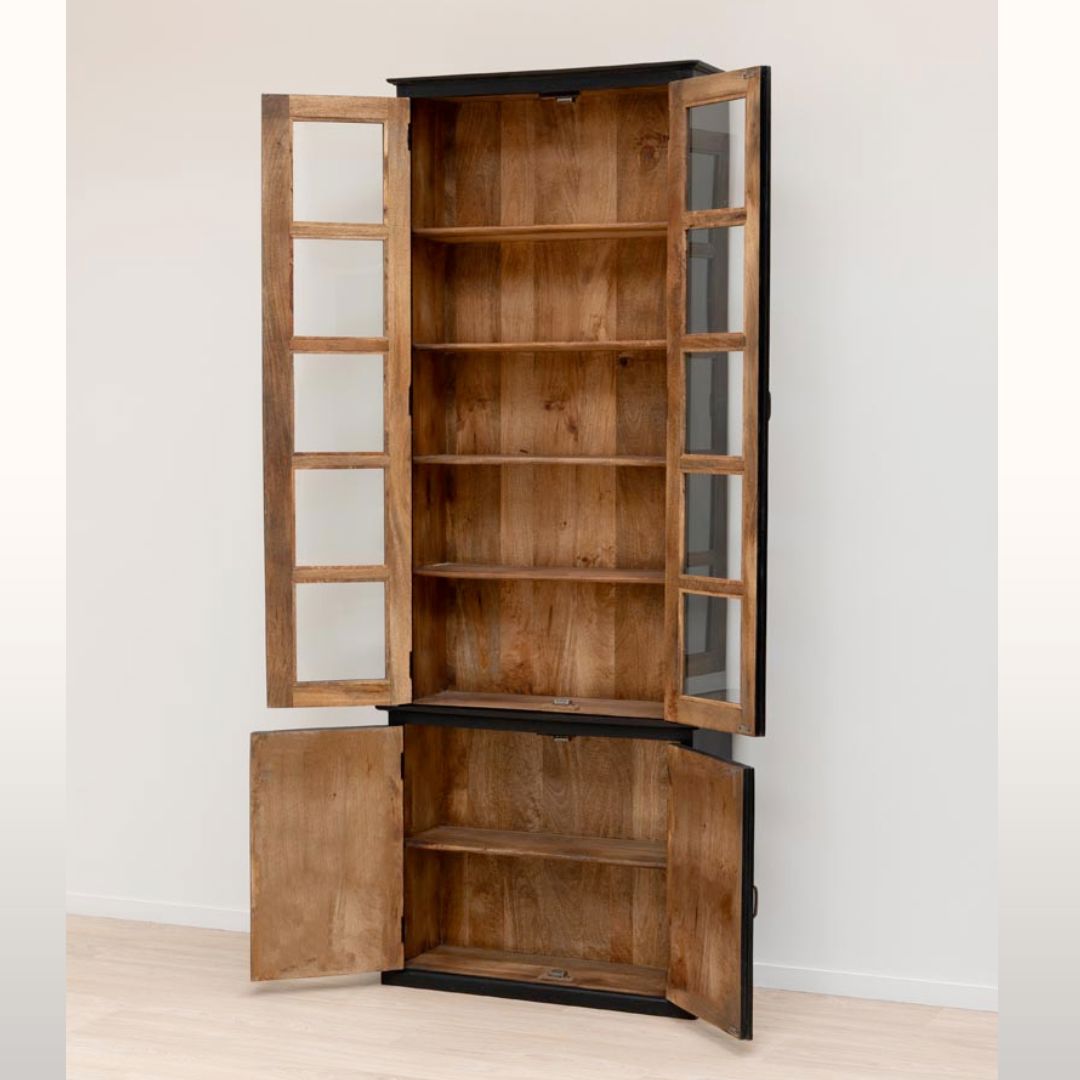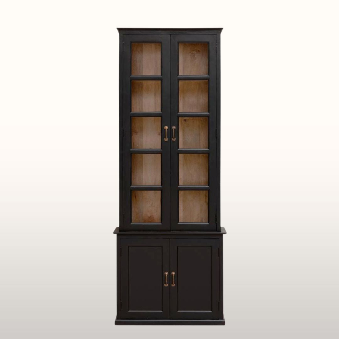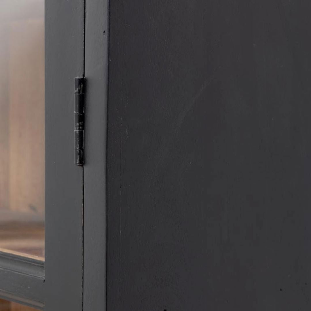This is a beautifully finished and very pretty tall black cabinet that is just aching to be placed in a narrow alcove. This cabinet is finished in a lovely matt black with a natural wood interior that lends itself so well to displaying beautiful objects and books that you have collected on your travels. This cabinet has a lower closed cabinet and the taller top section has 4 shelves.