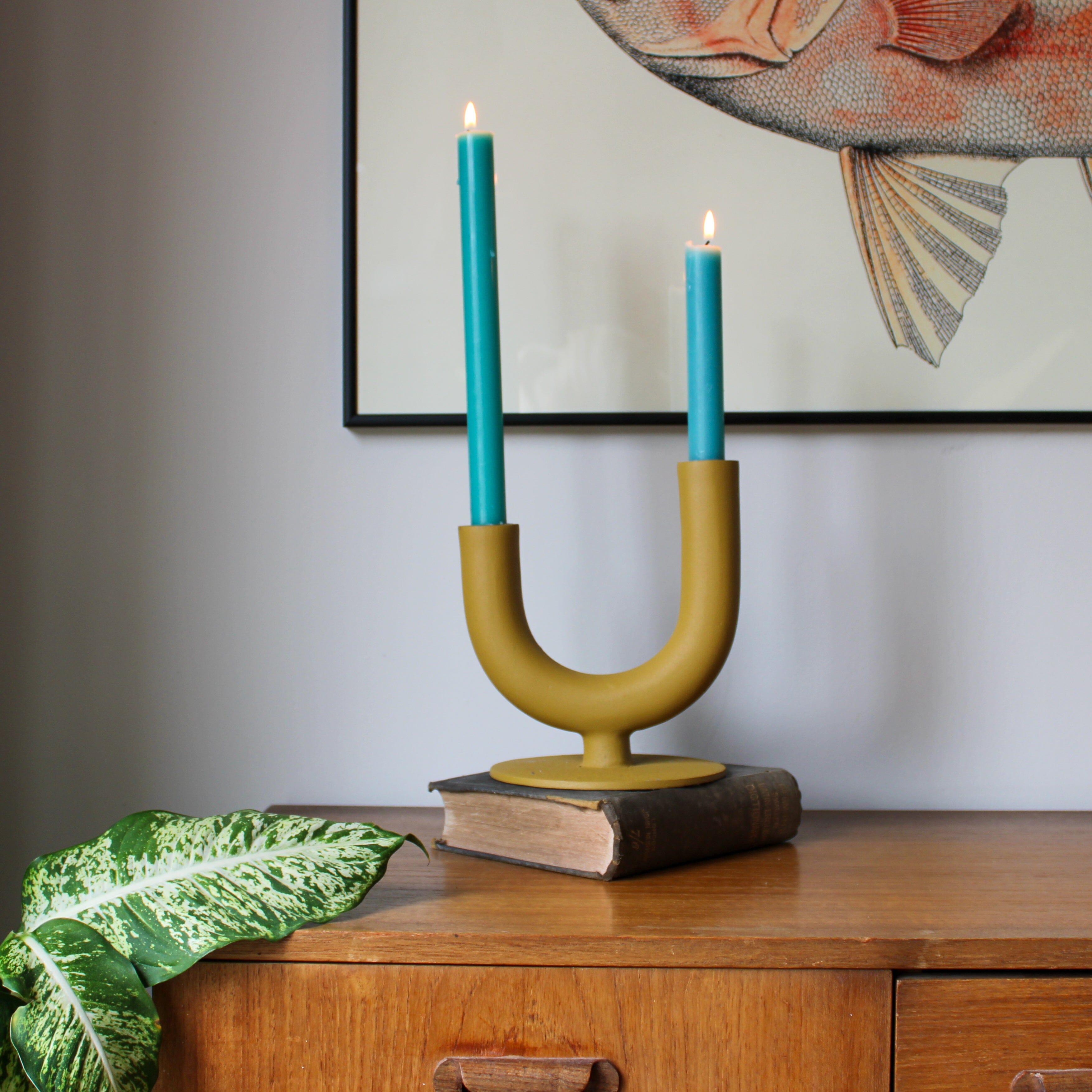 Die Farbe dieser Kerze ist ein leuchtender Türkiston in leuchtendem Blau. Wir lieben es, diese Farbe mit ebenso hellen Paarungen wie unserem ockerfarbenen Metallkerzenhalter zu mischen.