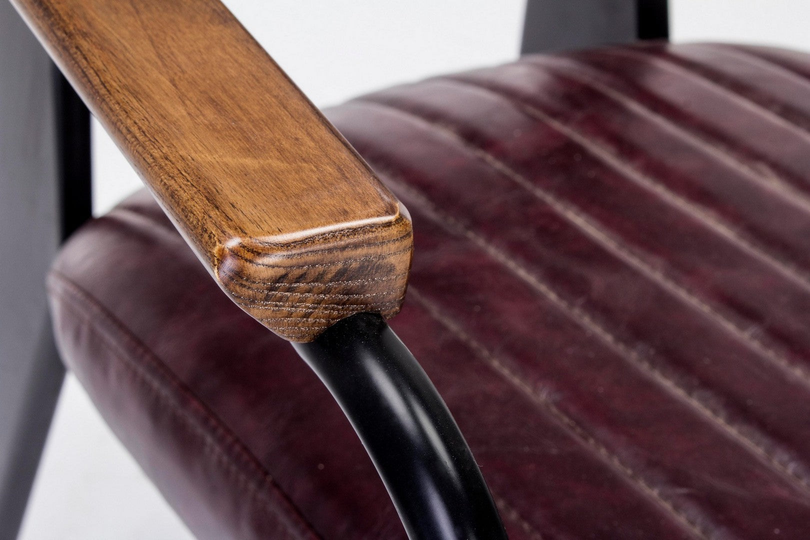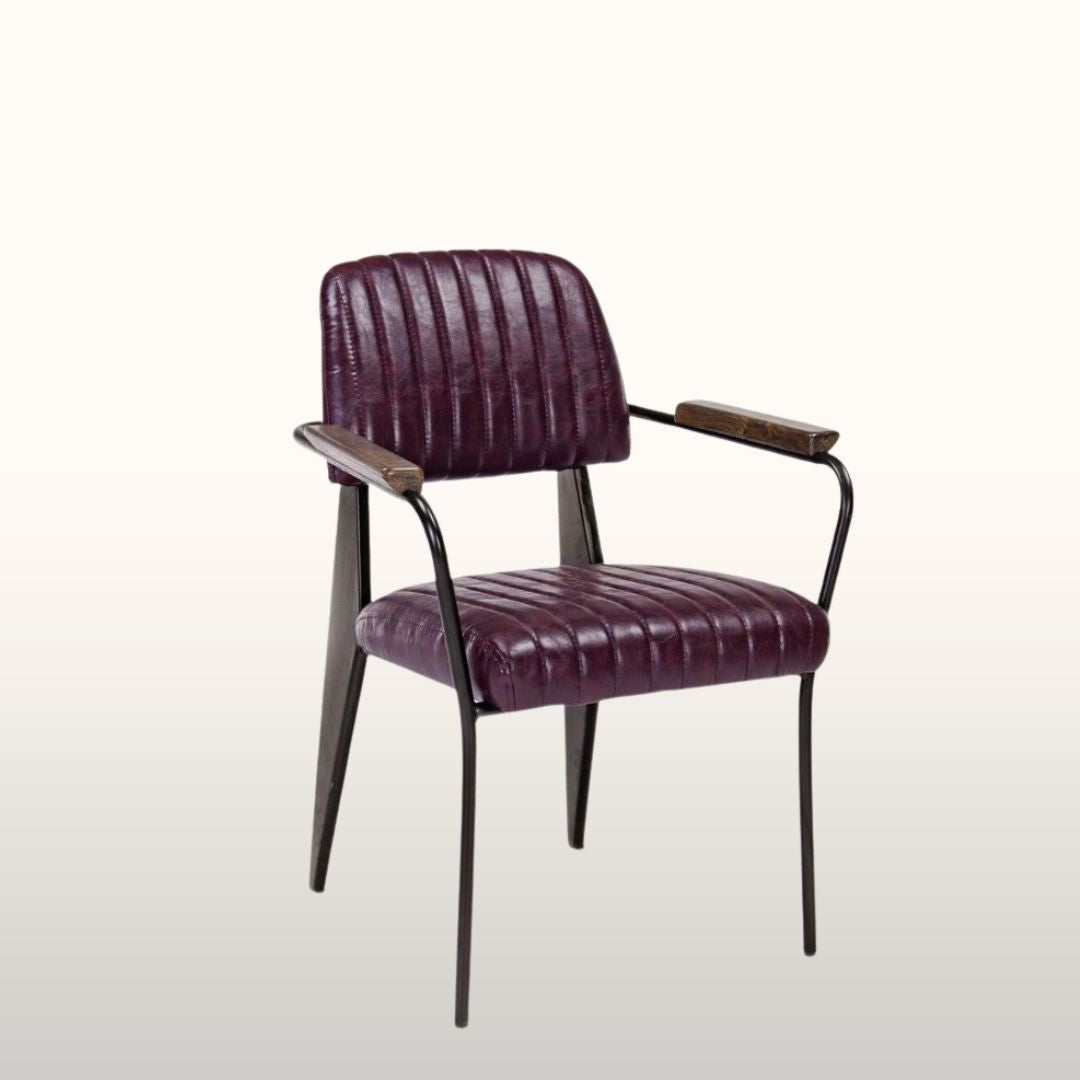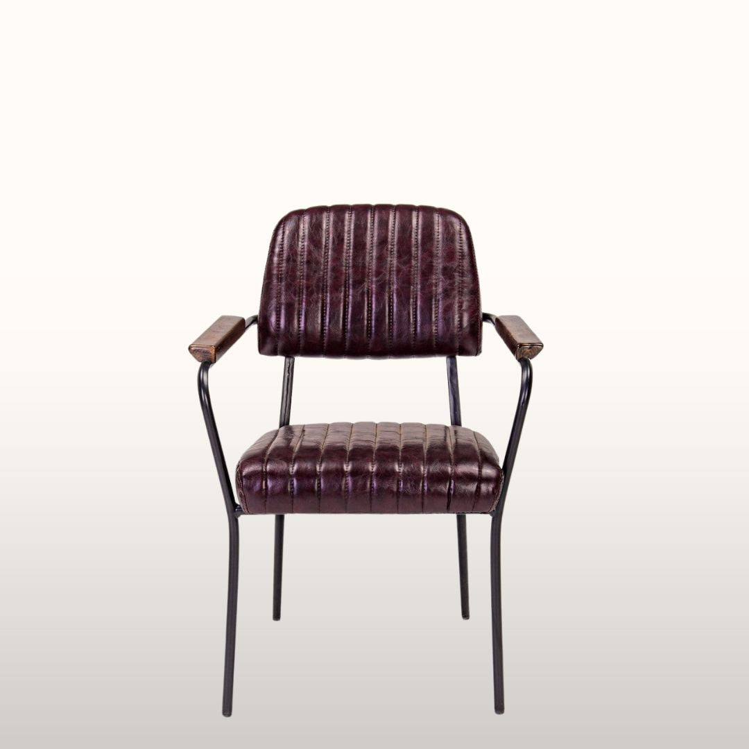 Dieser großzügig proportionierte und farbenprächtige Esszimmerstuhl hat eine starke Ästhetik, die Ihrem Esstisch eine ganz besondere Atmosphäre verleihen wird. Der mattschwarze, pulverbeschichtete Rahmen wird durch den kanalgenähten, bordeauxrot gepolsterten Sitz und die Rückenlehne in Kunstlederoptik ergänzt. Für zusätzlichen Stil sind die Armlehnen mit festen Armlehnen aus Holz ausgestattet. Wir lieben die Art und Weise, wie sich die Armlehnen vorne zum Boden hin krümmen, und die tieferen Hinterbeine, die ein bedeutungsvolles Gefühl von Beständigkeit vermitteln – definitiv ein Stuhl für ein langes Sonntagsessen!