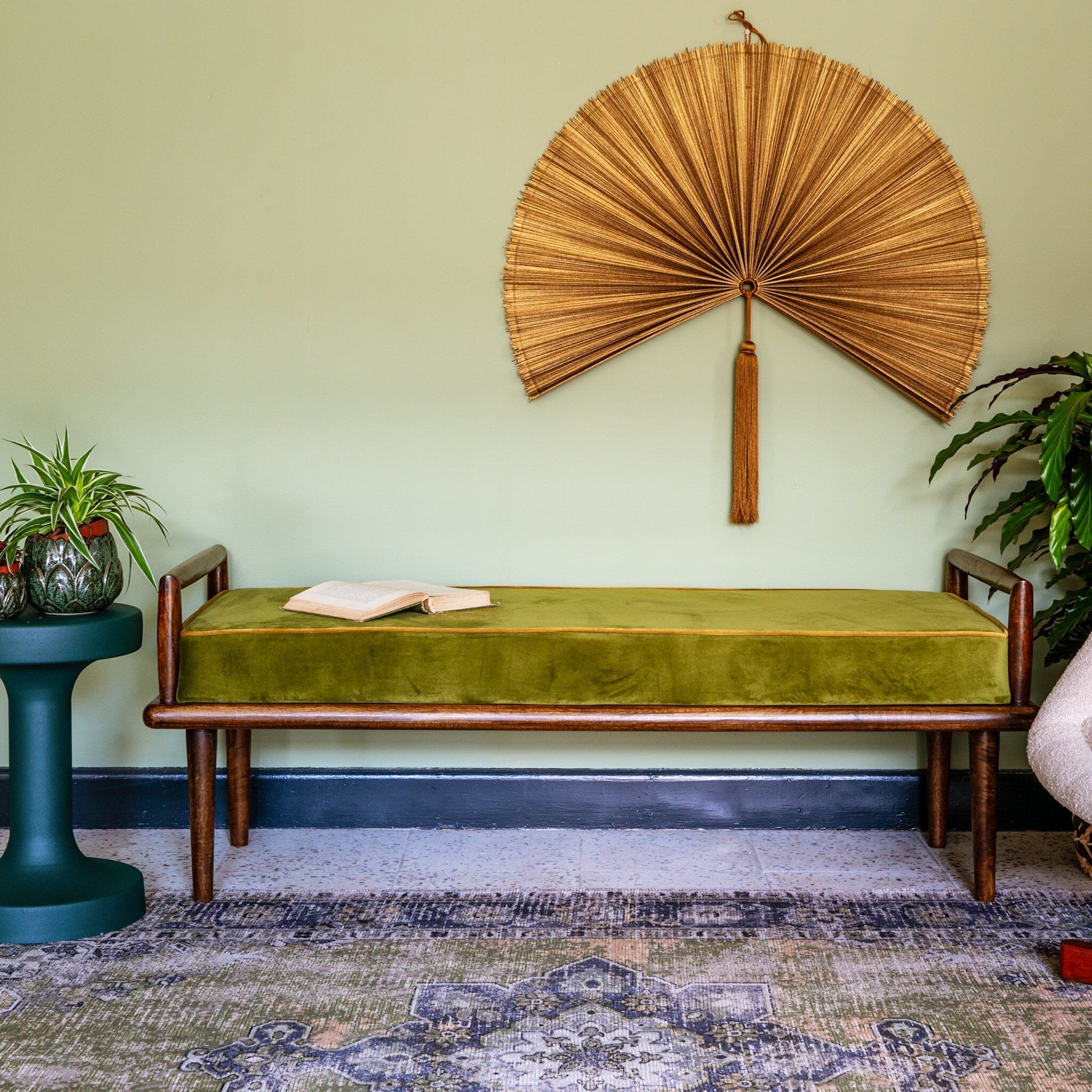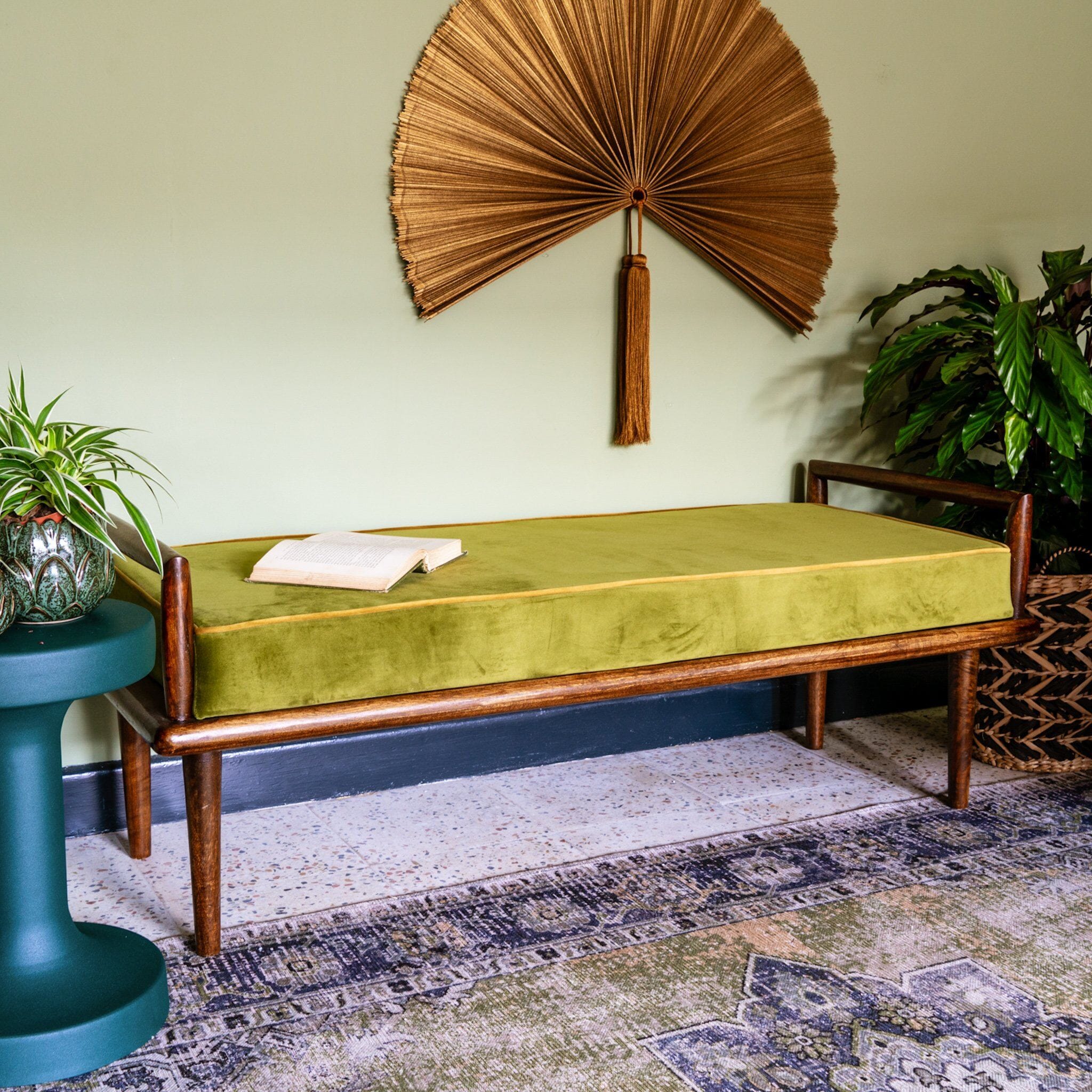 Nun, wir hatten großes Glück, als wir diese wunderschöne Bank gefunden haben! Wir sind begeistert von dem satten grünen Samt und den kontrastierenden Paspeln des Sitzkissens, das in einem Rahmen aus dunklem Mangoholz sitzt und zusammen ein wirklich elegantes und zeitloses Stück ergibt. Der Holzrahmen hat schlanke Beine und eine schöne Griffschiene auf beiden Seiten, die diesem Stück eine schöne, satte Ästhetik verleiht. Diese Bank würde hervorragend am Ende eines Bettes, unter einem Fenster oder in einem großen Flur funktionieren.
