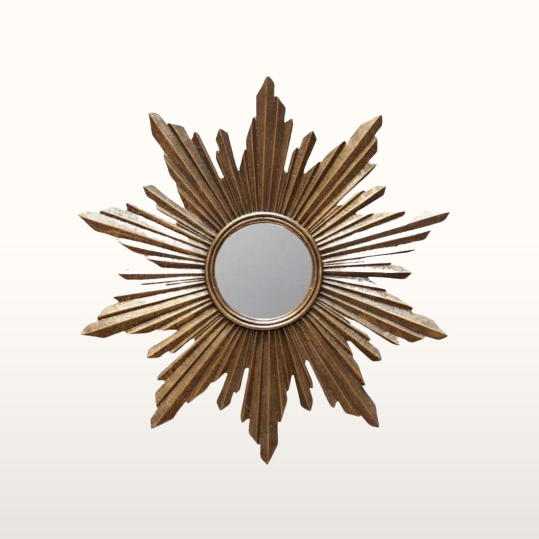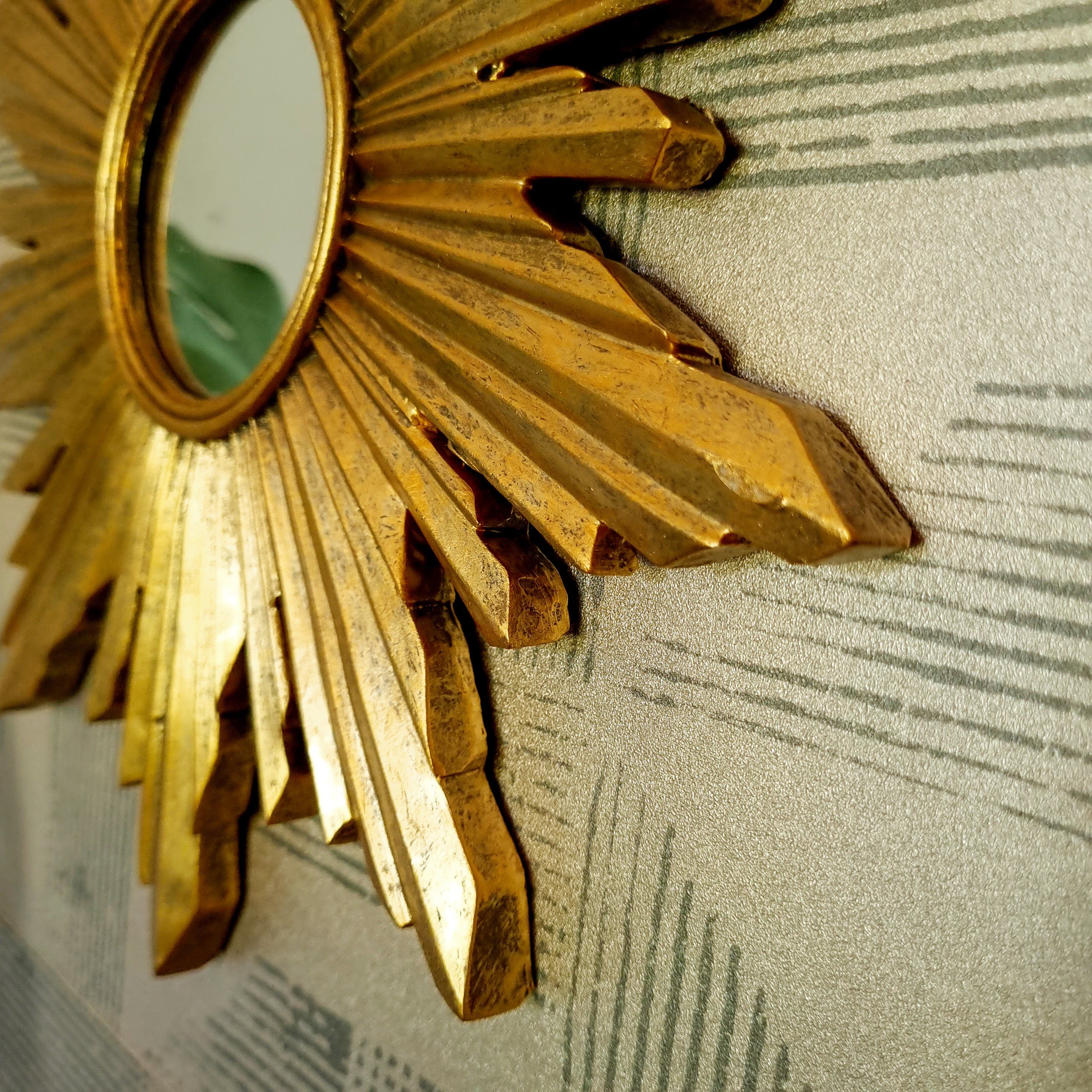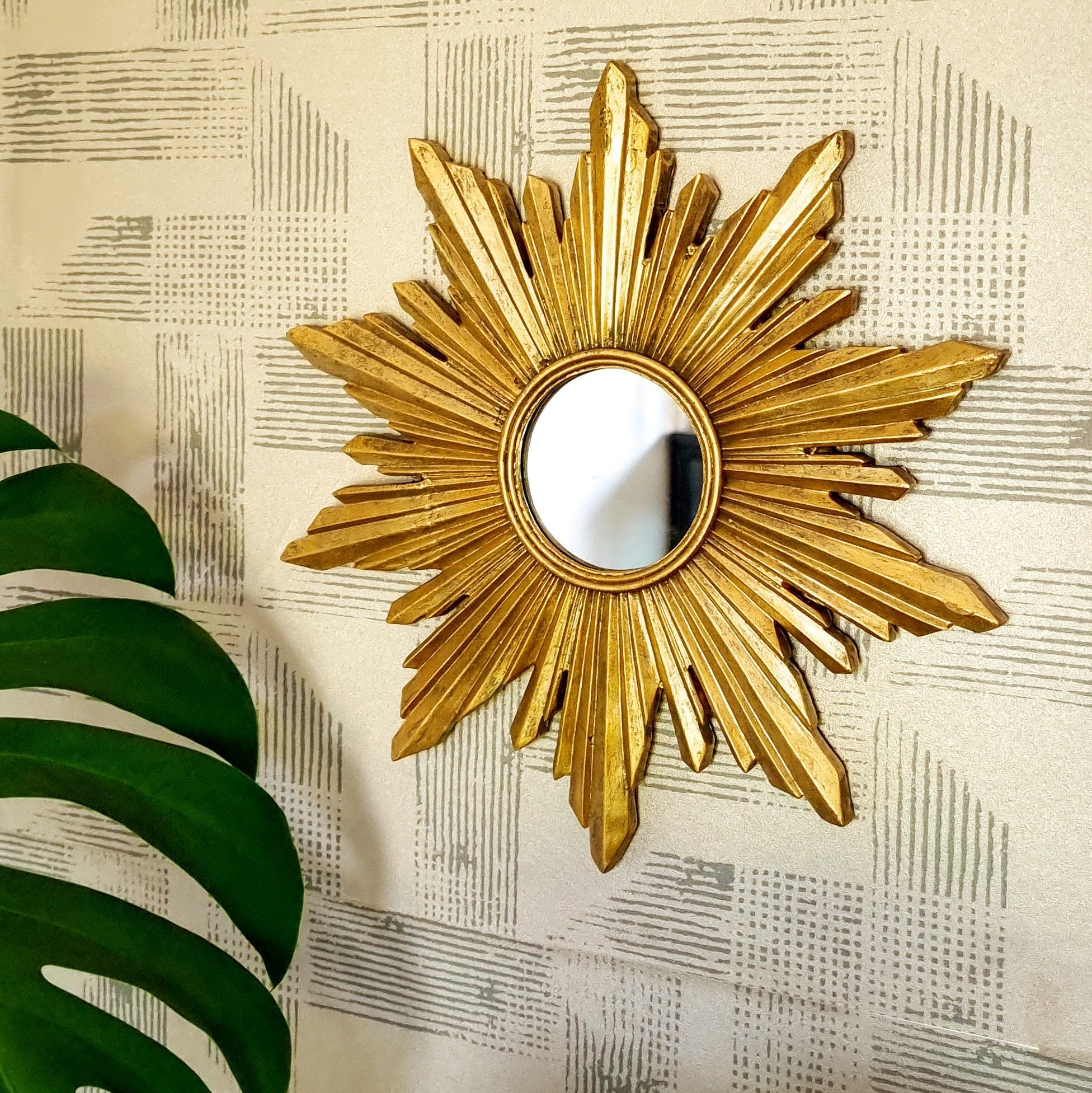 Gönnen Sie sich etwas altmodischen Luxus mit diesem dekorativen goldenen Sunburst-Spiegel. Sein wunderschöner goldfarbener Harzrahmen wurde zu einem komplizierten Sonnenstrahlmuster um einen kleinen dekorativen Spiegel geformt. Wir lieben dies als dekoratives Stück in einer Galeriewand, es würde wunderbar mit unserem Blattgoldspiegel harmonieren.