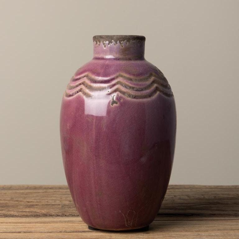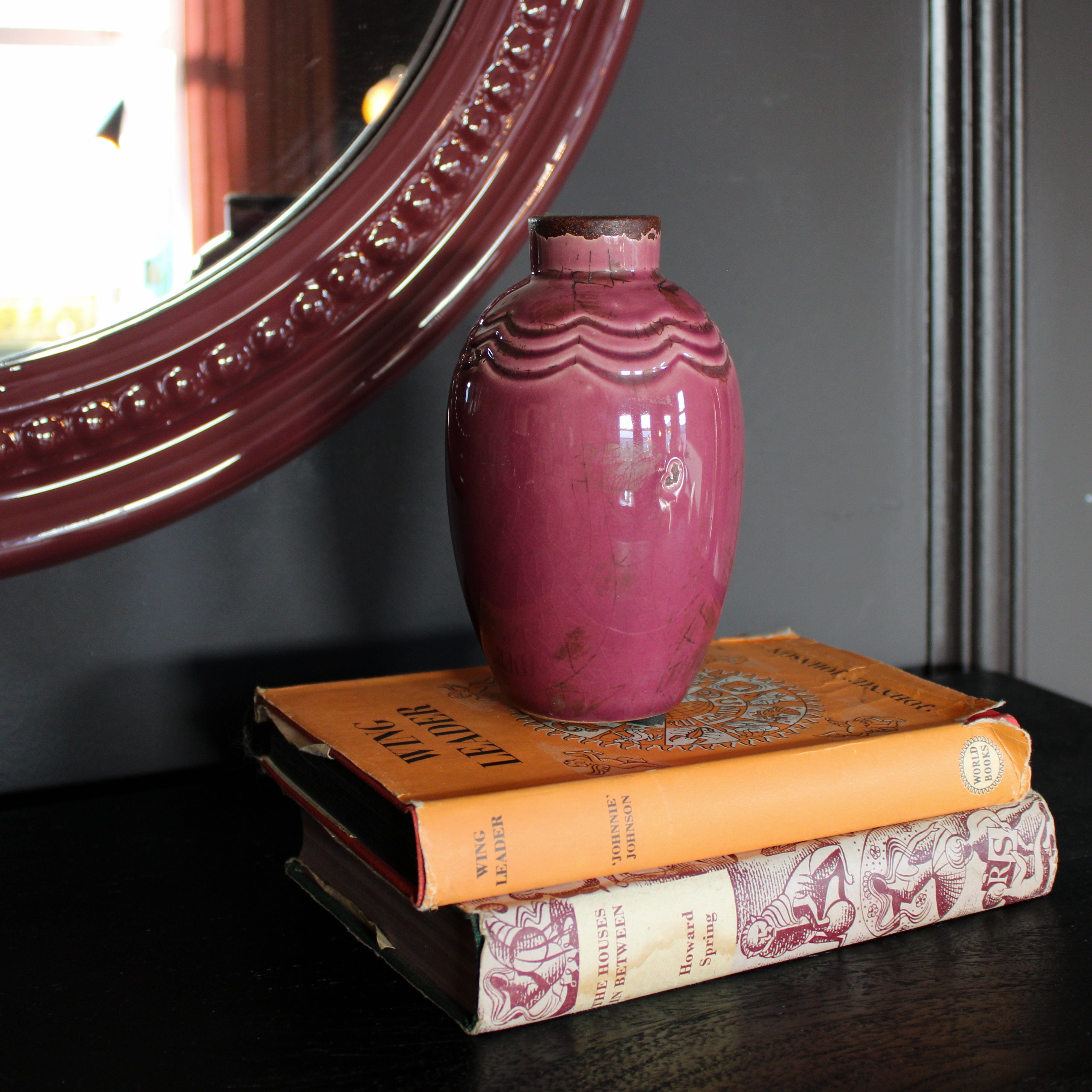 This pretty decorative dark pink/mauve vase is a cute little piece to set upon your shelf or use for a little dry flower display.  This cute stoneware vase is just 14.5cm tall and has a rustic antiqued finish ringed with a triple indented bunting design.  Every vase is very slightly different.