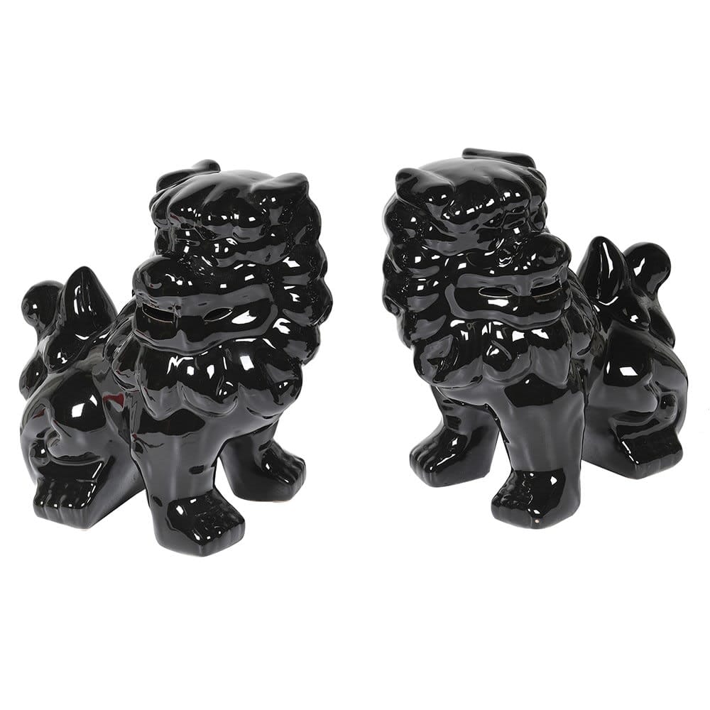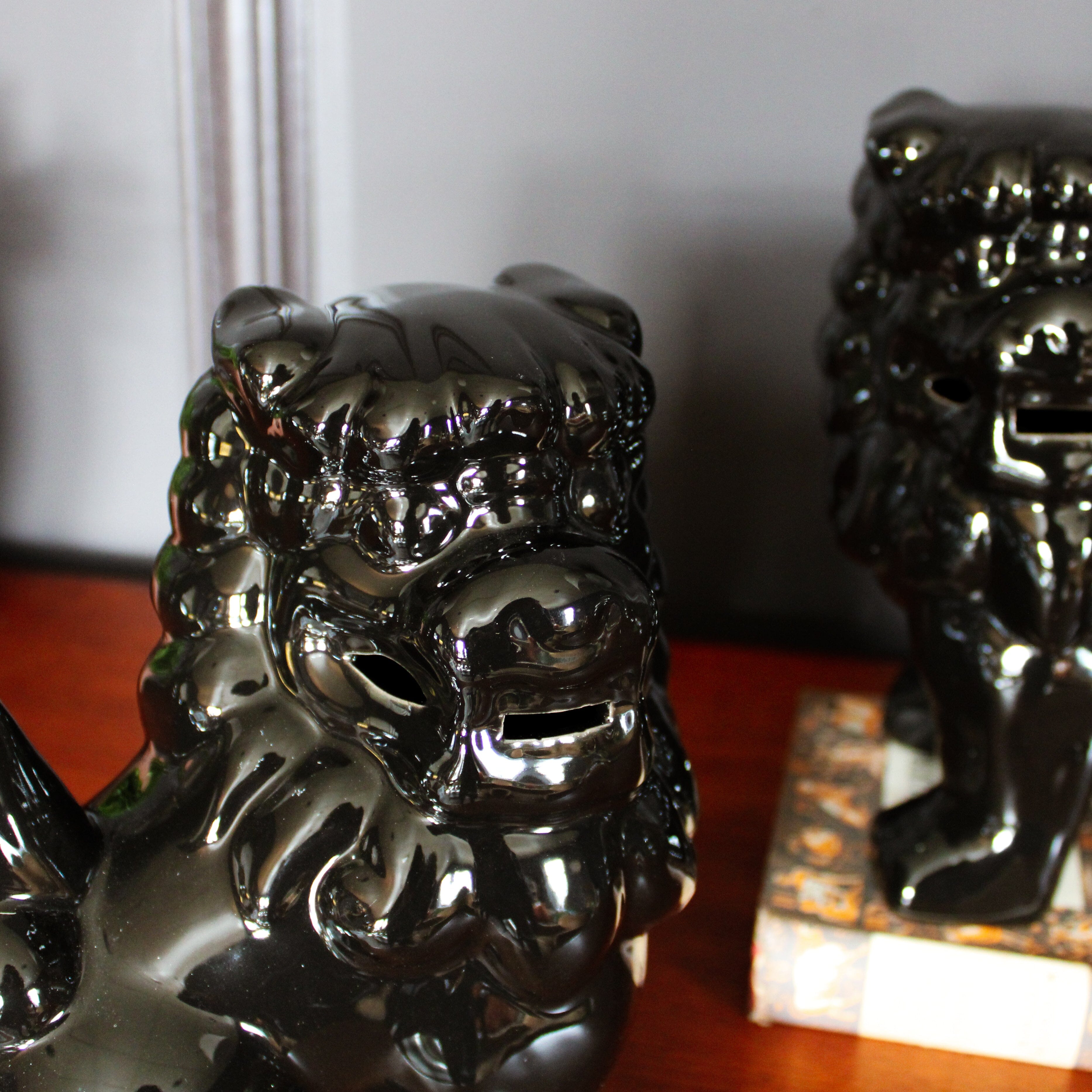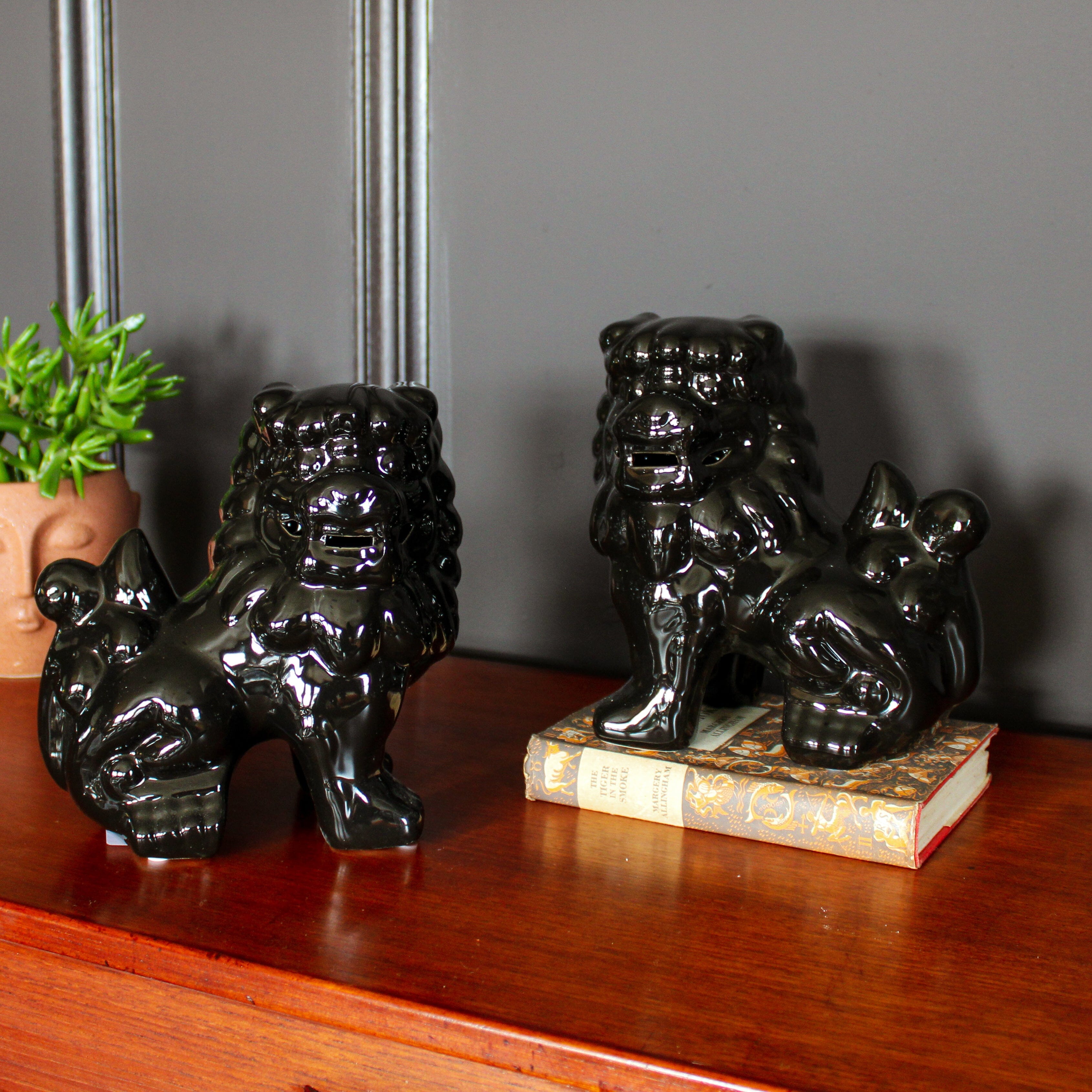 Als wir sie sahen, verliebten wir uns sofort in dieses fabelhafte Paar. Foo Dogs sollen in der chinesischen Kultur Löwen sein und Ihr Zuhause bewachen, und obwohl dieses Paar wild sein mag, sind sie ebenso bezaubernd! Wir lieben ihre hochglänzende schwarze Oberfläche, die sie zu einer entzückenden Zierde für Sideboards oder Kaminsimse macht, aber wir könnten sie auch als Bewachung der Eingangstür auf einer Flurkonsole sehen. Durch die schlichte schwarze Lackierung sind diese Hunde mit fast jedem Farbschema kompatibel. Kombinieren Sie sie mit roten Accessoires für echtes Glück!