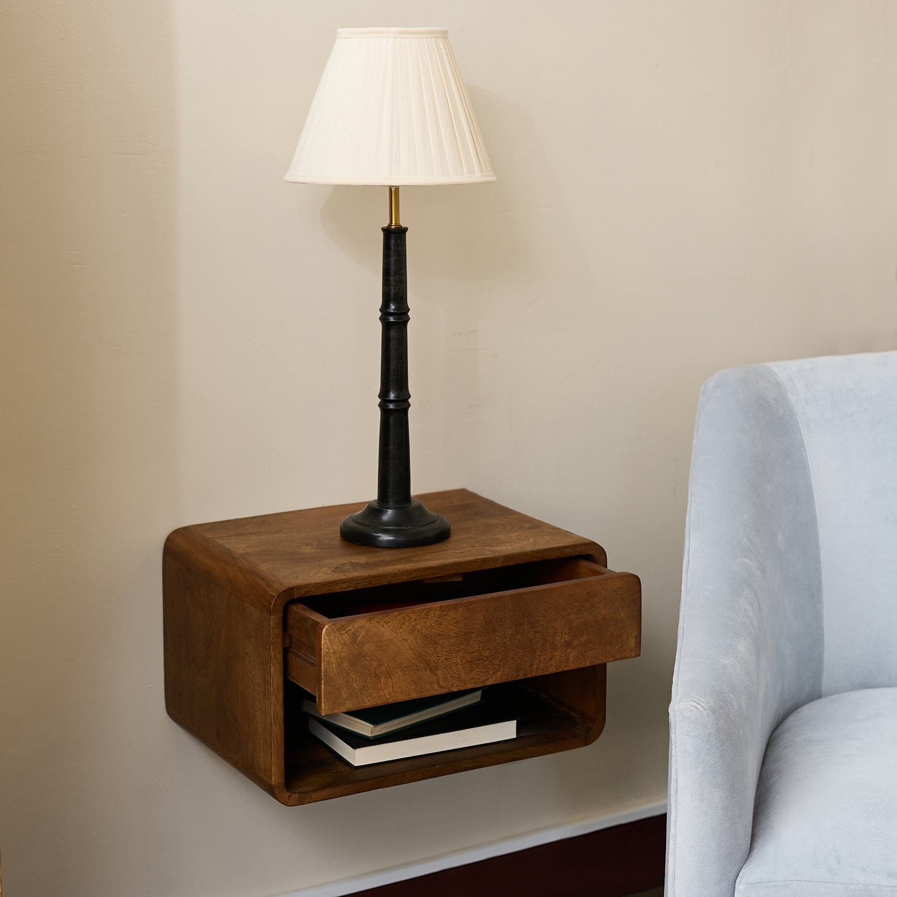 This wall hanging bedside table is a treat for a homeowner looking for clean lines and an elegant design in their bedroom.  It's perfectly proportioned to provide enough table space for a small lamp, a book and a glass of water.  Extra books can be stored beneath an in-built drawer which is ideal for keeping all the bits and bobs that make for a good night's sleep.