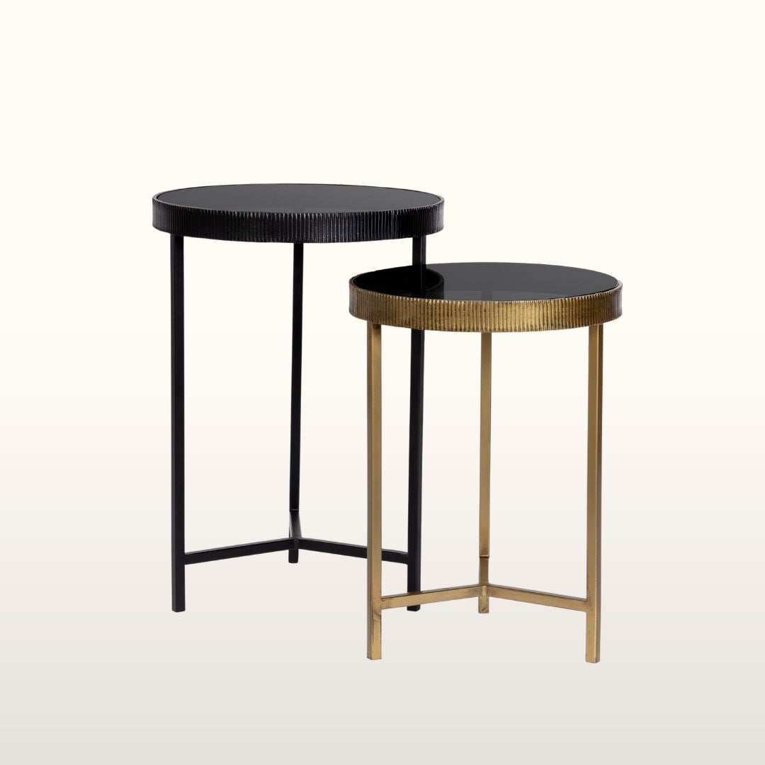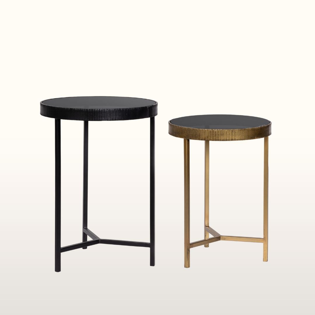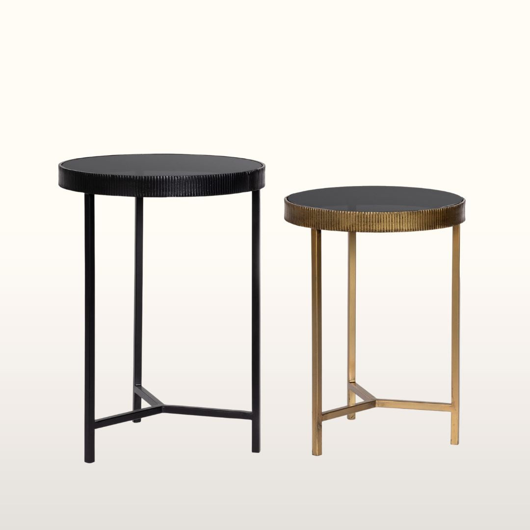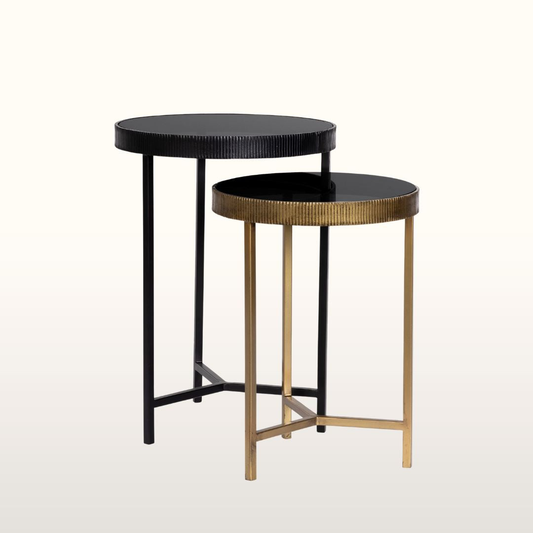 This is a very attractive nest of tables that is the perfect addition to a living room.  The different coloured tables are both interesting and unique with a ridged diameter rim that complements the smoked glass tops and makes them really stand out from the crowd.  They work brilliantly as a pair together and style very elegantly.  Alternatively or could be used in separate parts of a room.