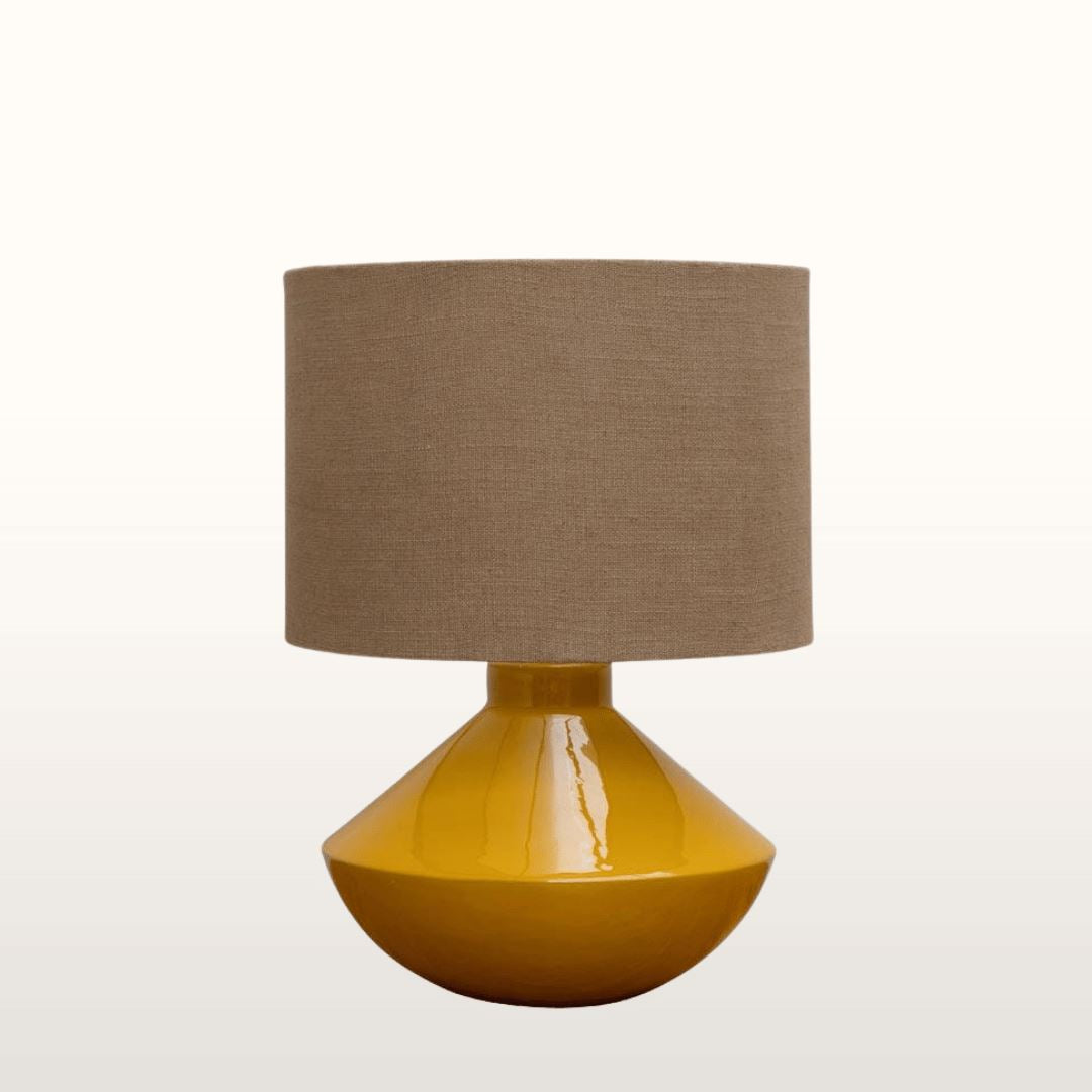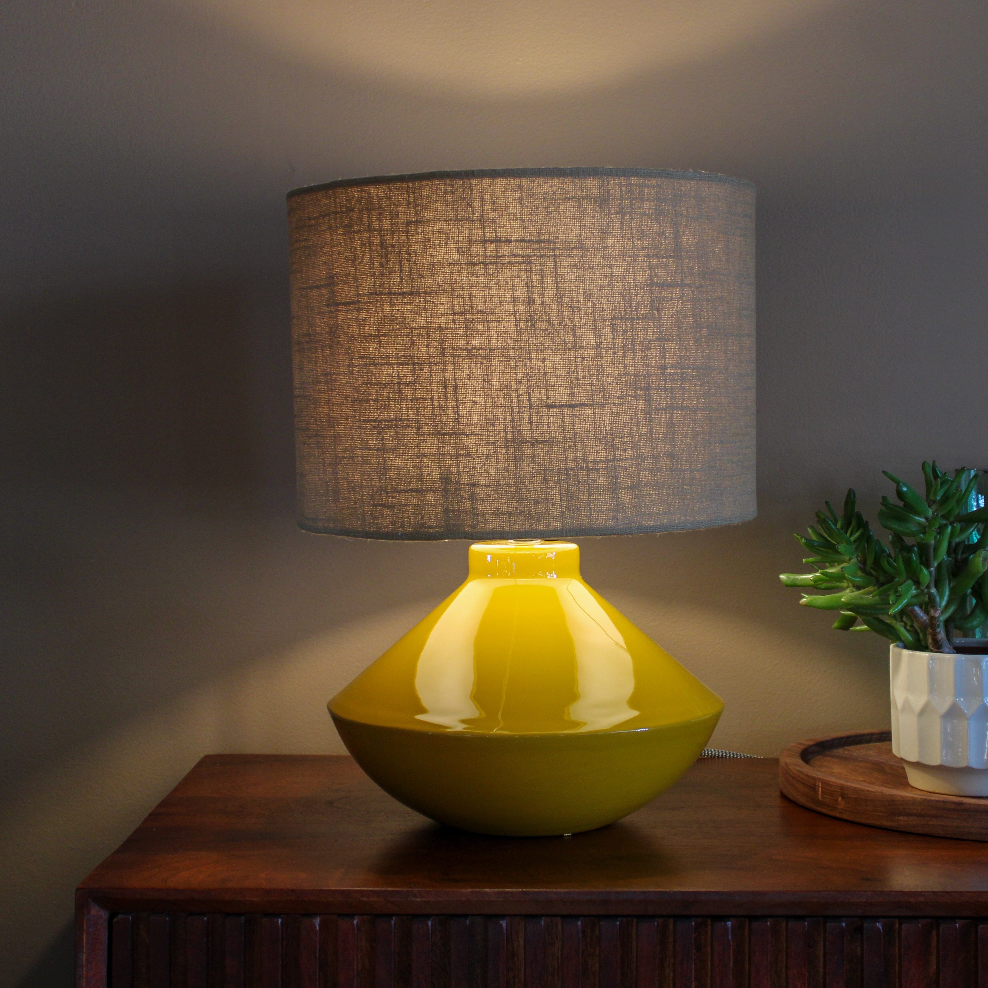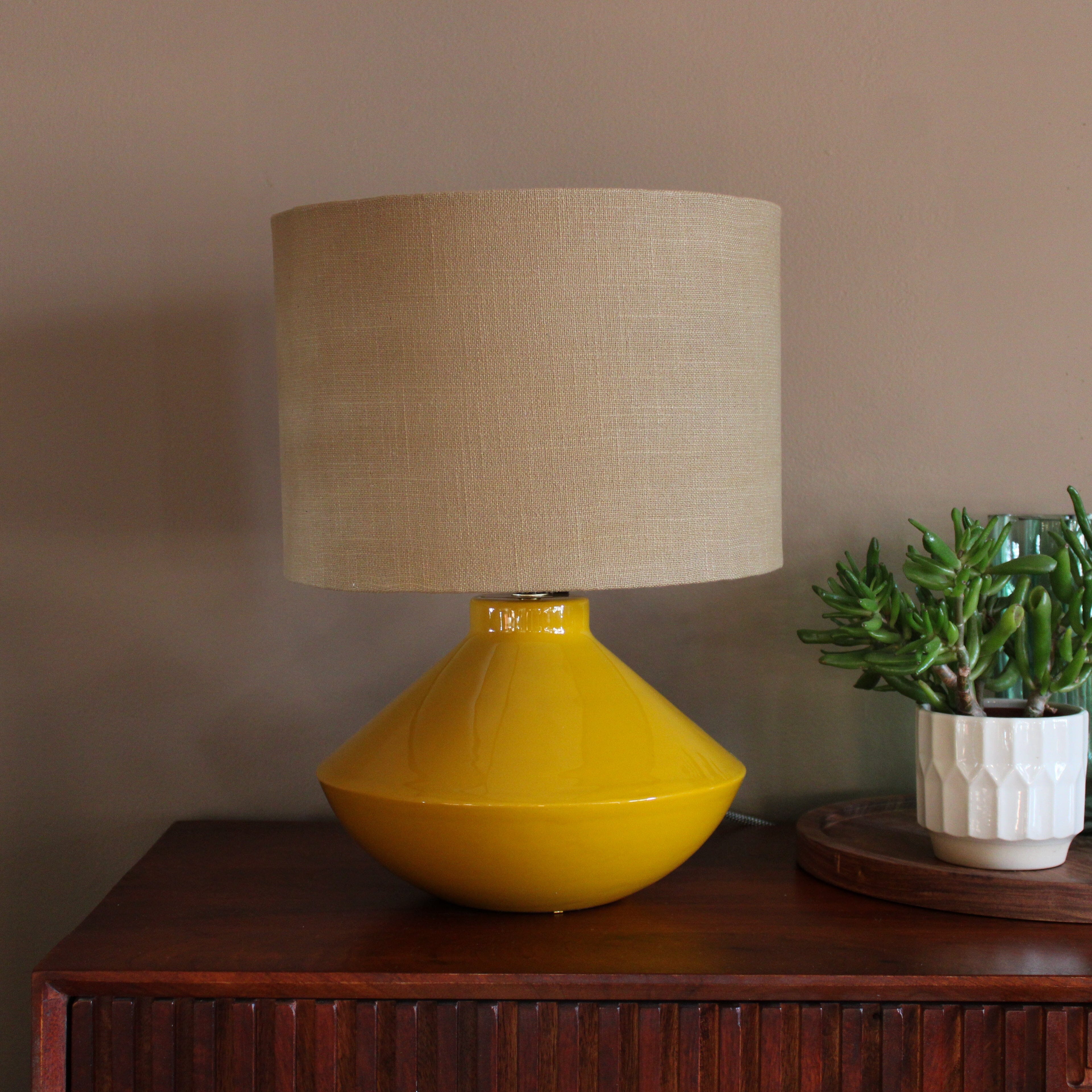 This rather attractive lamp has a lovely geometric inspired ceramic base in a warm mustard yellow which combines beautifully with a warm linen shade.  The base has a lovely solidity of shape to it which would work really well as a bedside lamp or in a hallway.  The linen shade gives a beautiful warm glow when lit and combines to make a really appealing table lamp.