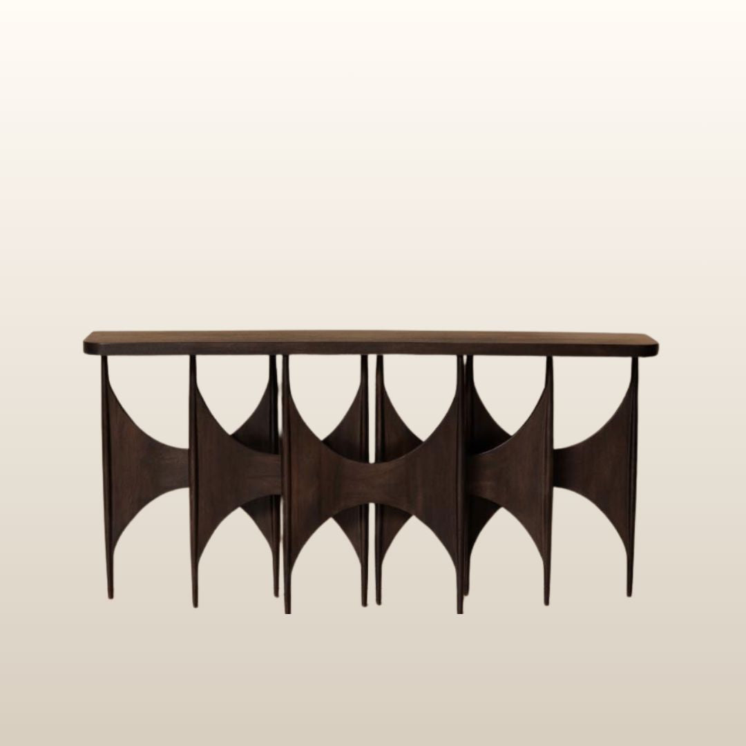 This is an absolutely stunning console table designed to create a real impact in your hallway. Made entirely of wood, this console features a wooden top with a curved front and straight sides meaning that it will meet the wall effortlessly. The top is mounted on a stunning array of sculptured overlapping legs with a scooped design that ends in elegant points to support the top and meet the floor. A really eye-catching piece that is ideal for a large hallway due it's length of 175cm where it can feature as the main focal point.