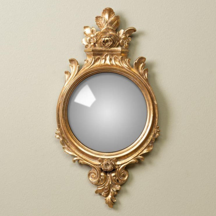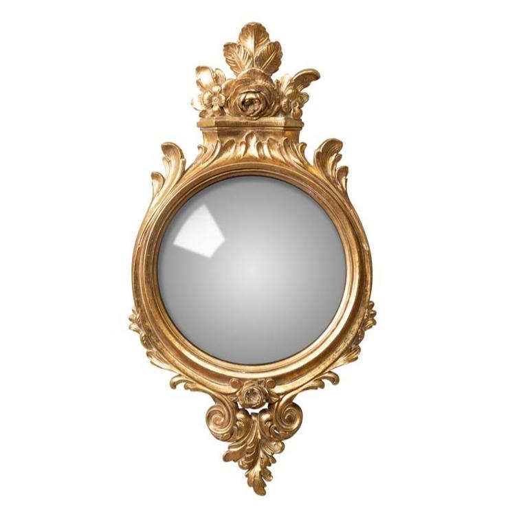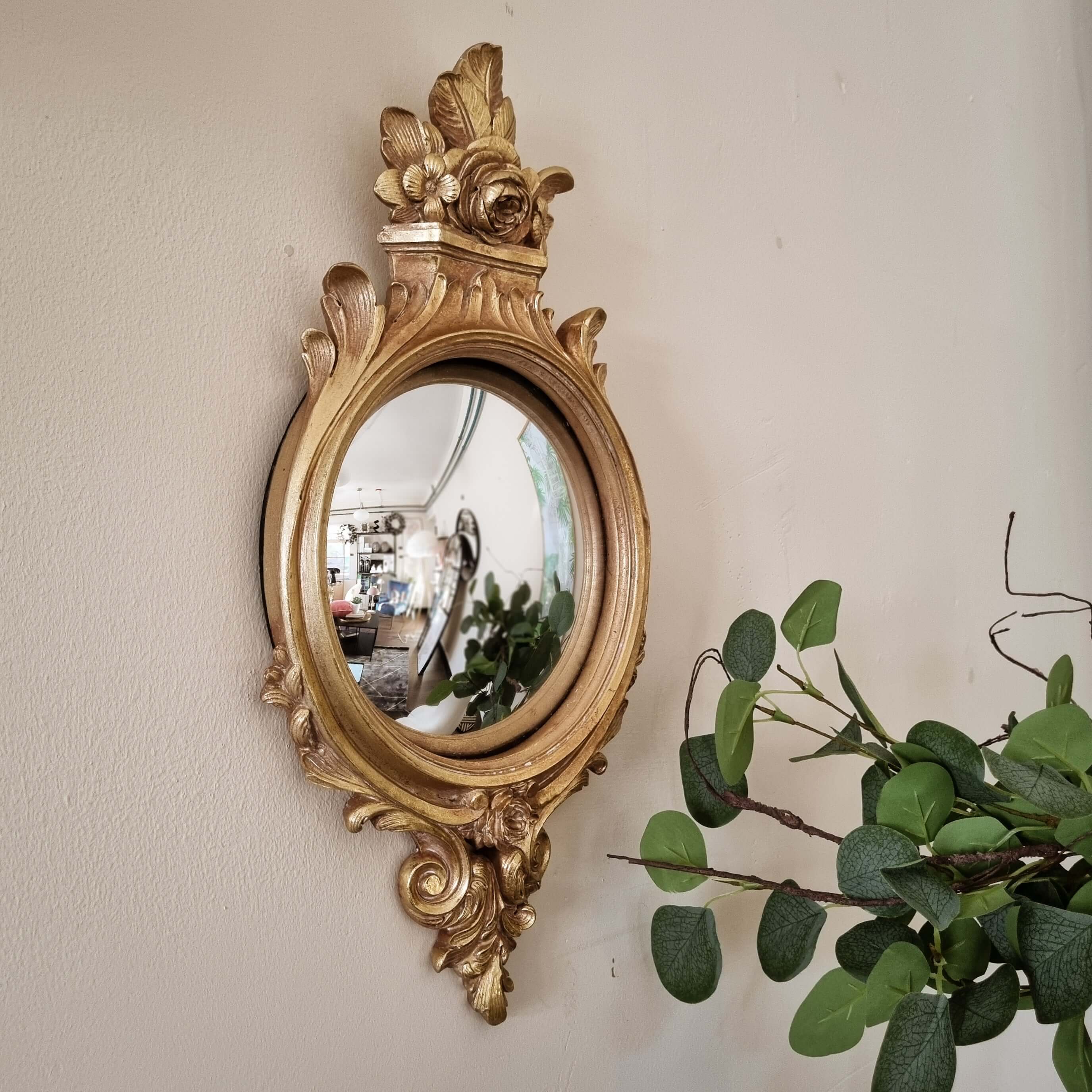 Wir haben uns absolut in diesen göttlichen, vom 18. Jahrhundert inspirierten konvexen Spiegel verliebt. Es ist genau das richtige Maß an Verzierungen, um einen dekorativen Blickfang zu schaffen. Der niedliche konvexe Spiegel ist perfekt von einem üppigen Goldrahmen umgeben, der köstlich geschnitzt ist und Sie in eine Marie-Antoinette-Träumerei versetzt. Kombinieren Sie es mit einigen anderen Spiegeln und lassen Sie es vor einer dunklen Wand hervorstechen, um für zusätzliche Dramatik zu sorgen.