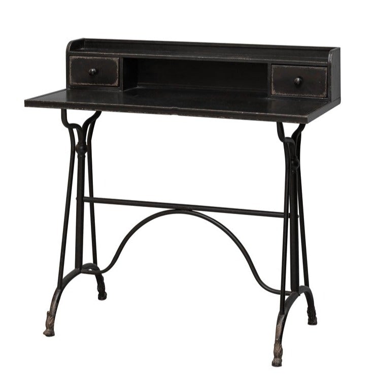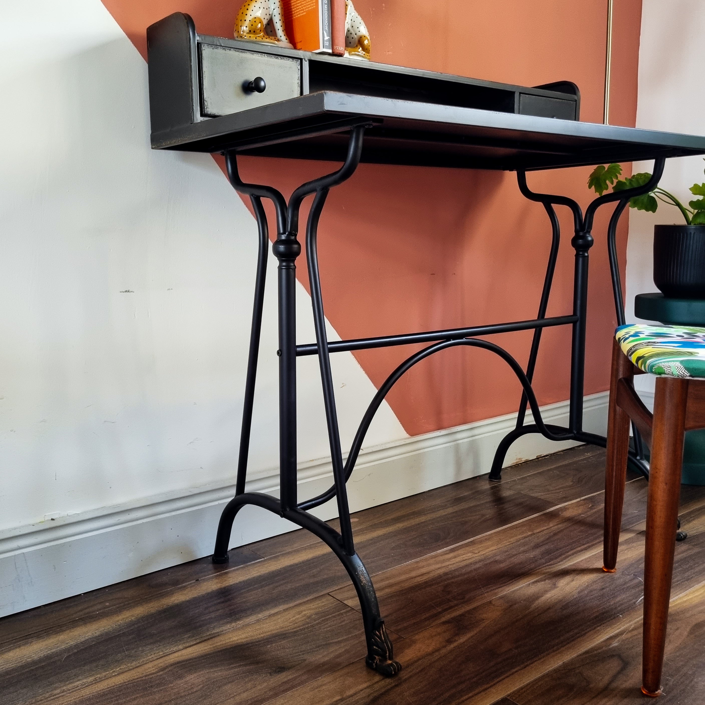 Ein kompakter und stilvoller, industriell inspirierter Schreibtisch, der sich perfekt für ein Gästezimmer oder eine Küchenecke eignet. Dieser fantastische kleine Metallschreibtisch bietet viel Platz auf dem Schreibtisch mit zwei praktischen Schubladen und einem erhöhten Bereich. Er könnte genauso gut als ordentlicher Konsolentisch funktionieren und sieht mit oder ohne Stuhl hübsch aus, sodass er eine praktische Sitzgelegenheit in der Küche sein könnte. Kleiden Sie sich mit unseren hübschen Mini-Leoparden und fügen Sie eine Schreibtischlampe für die Arbeit bis spät in die Nacht hinzu.