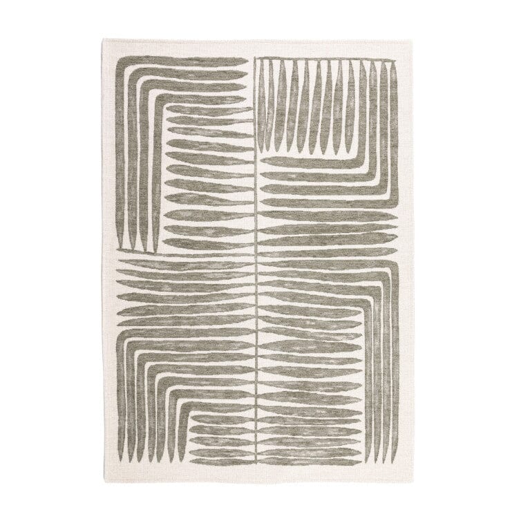 The Botania rug in grey is designed to complement minimalist spaces with its distinct pattern. Its flat-woven construction makes it an excellent choice for placement under dining tables, combining understated elegance with practical durability.