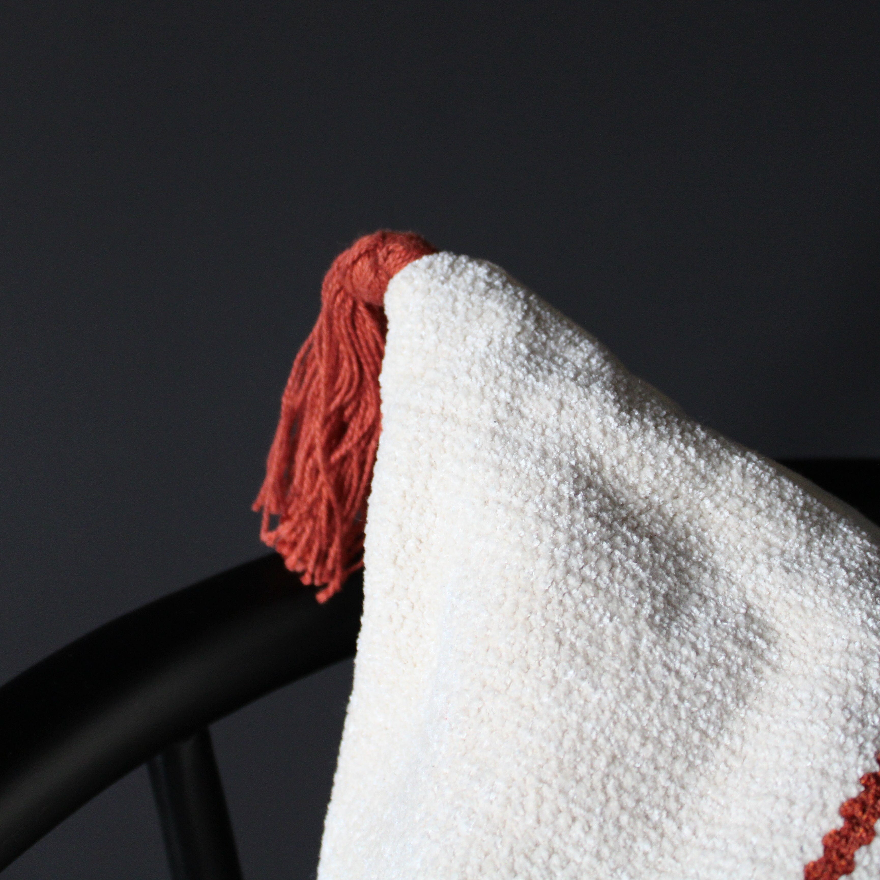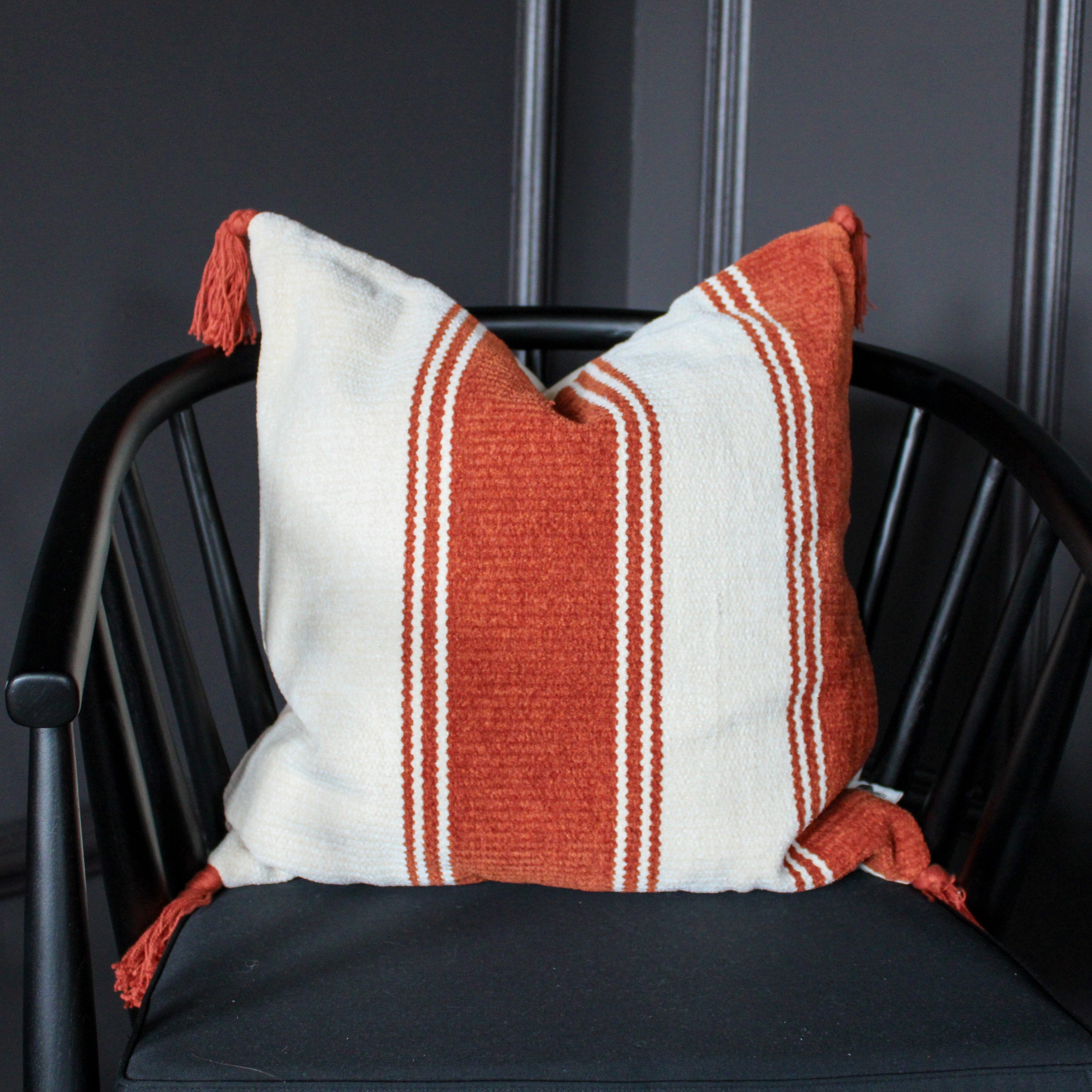 Verleihen Sie Ihrem Wohnraum einen eleganten Hauch von Struktur mit diesem luxuriösen gestreiften Kissen in gebranntem Orange. Dieses 45 cm x 45 cm große Kissen ist aus üppigem Chenille-Stoff gefertigt und weist exquisite gebrannte orangefarbene Streifen auf, abgerundet mit eleganten Quastendetails und komplett mit Federfüllung für ultimativen Komfort. Perfekt, wenn es auf einem Sessel, Sofa oder als dekoratives Accessoire auf einem Bett platziert wird.