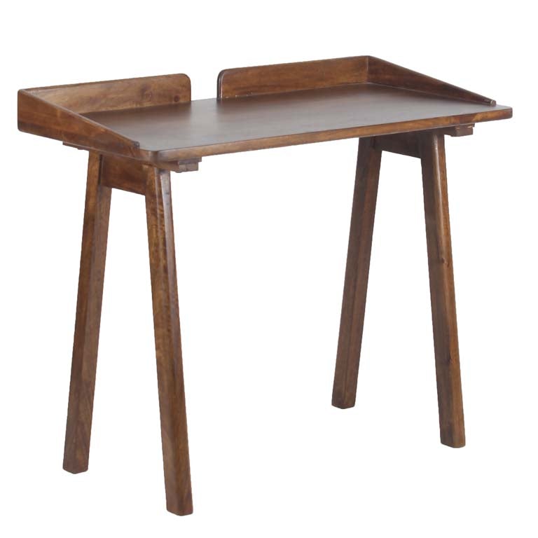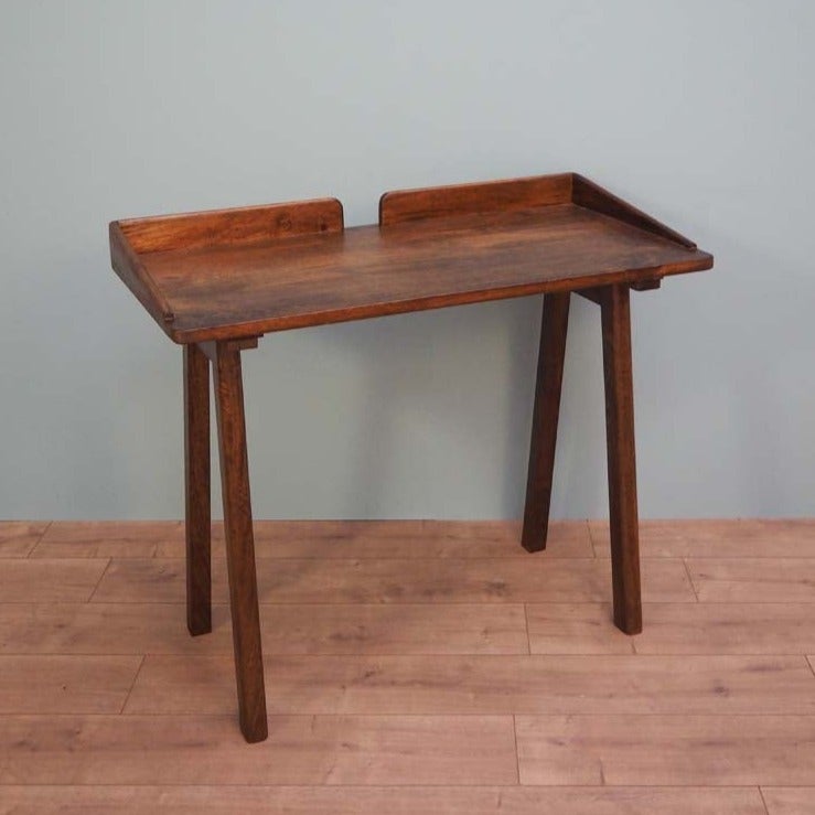 Dies ist ein äußerst kompakter und stilvoller Schreibtisch aus dunklem Holz, und wir lieben ihn absolut! Das schlichte Design verfügt über schöne, abgewinkelte Beine, die genau unter einen ordentlichen Schreibtisch passen, mit sehr praktischen erhöhten Seiten (um zu verhindern, dass alles herunterfällt!). Darüber hinaus verfügt der erhöhte Rand auch über eine Aussparung auf der Rückseite, sodass Sie Ihre Laptop-Kabel problemlos durchfädeln können und Ihren Schreibtisch auch von zu Hause aus in Top-Zustand halten.