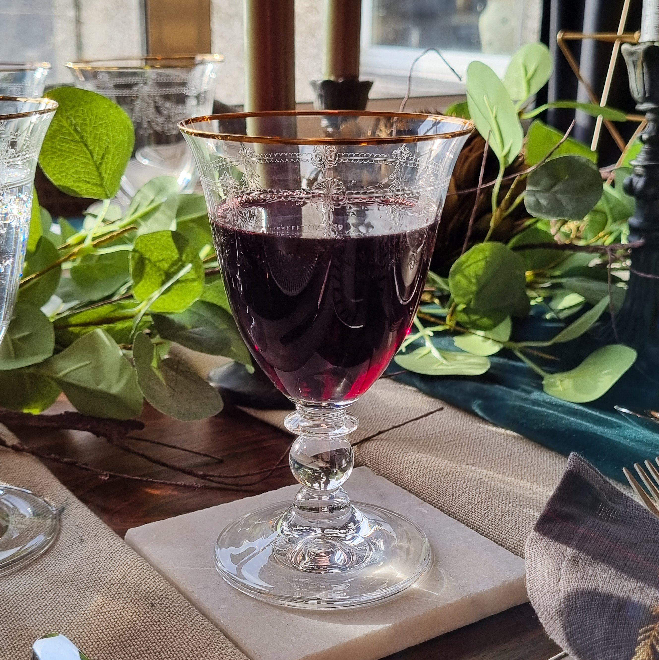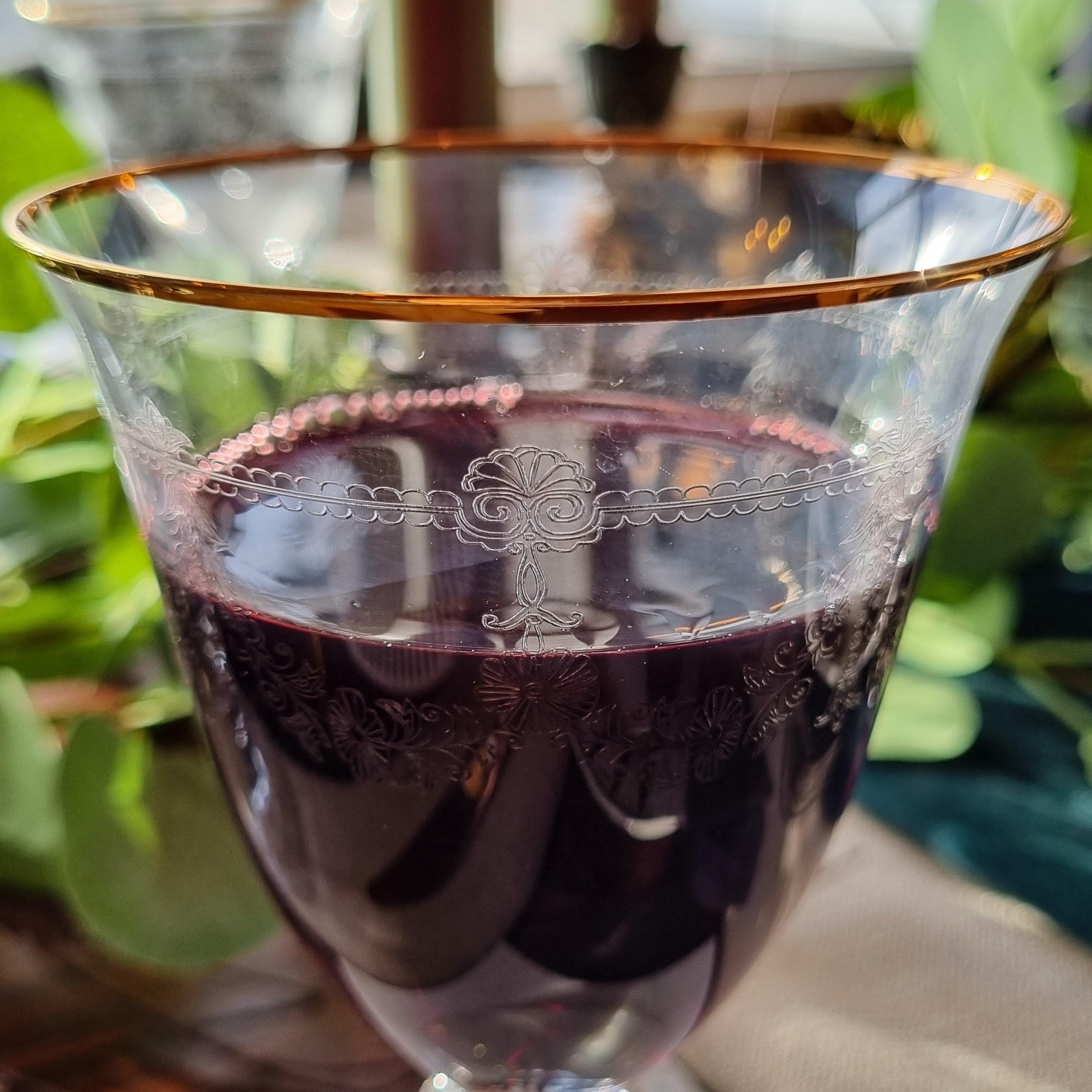Dies ist ein Weinglas mit Finesse! Ein wunderschönes Stück mit Goldrand, das etwas zu bequem in der Hand liegt. Diese hübschen Stücke verleihen jedem Esstisch ein edles Flair. Wir lieben das zarte geätzte Muster im Glas und die geformten Details am kurzen Stiel. Kombinieren Sie sie mit dem geätzten Wasserglas | 6er-Set für ein komplettes Set und einen kuratierten Tisch.