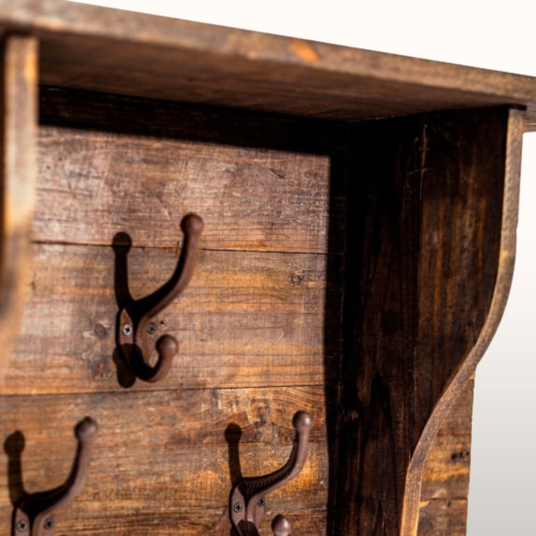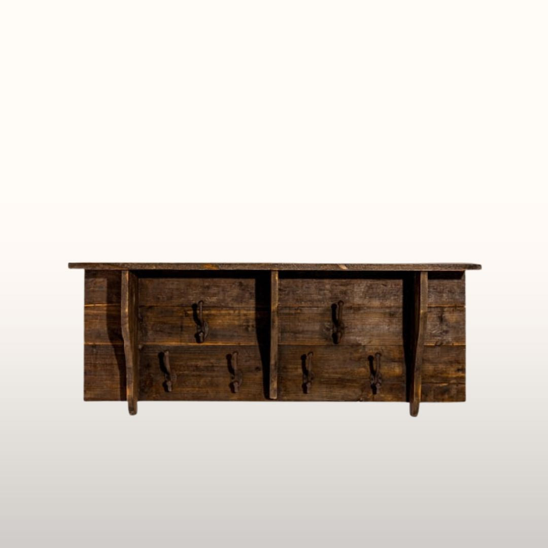 This rustic style coat rack makes a lovely addition to a hallway. It has 6 hooks in 2 sections and a small shelf above. The rustic style wood will work really well if you want to add some texture to a contemporary hallway or if you are looking to imbue a more country cosy feel. At 100cm wide, this piece is going to slot nicely into most hallways.