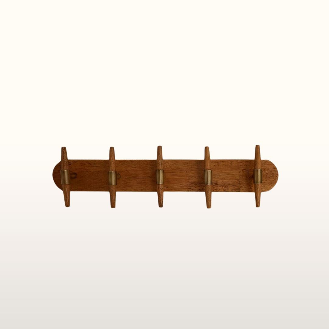 This super wooden coat hook is inspired by mid century design. Featuring five peg like hooks with brass cleats, this small coat rack is ideal for a small space or back of a door. It will look stylish and sleek and hug the wall beautifully. A lovely neat piece of design.