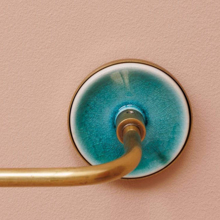 Add a decorative flourish to your bathroom with this pretty brass towel rail. Beautifully crafted in brass with a turquoise ceramic plate, this brass towel rail will add a perfectly balanced touch of old world charm and contemporary chic to your bathroom or guest washroom. Pair it up with the matching hook, toilet roll holder or towel ring for a complete bathroom makeover.
