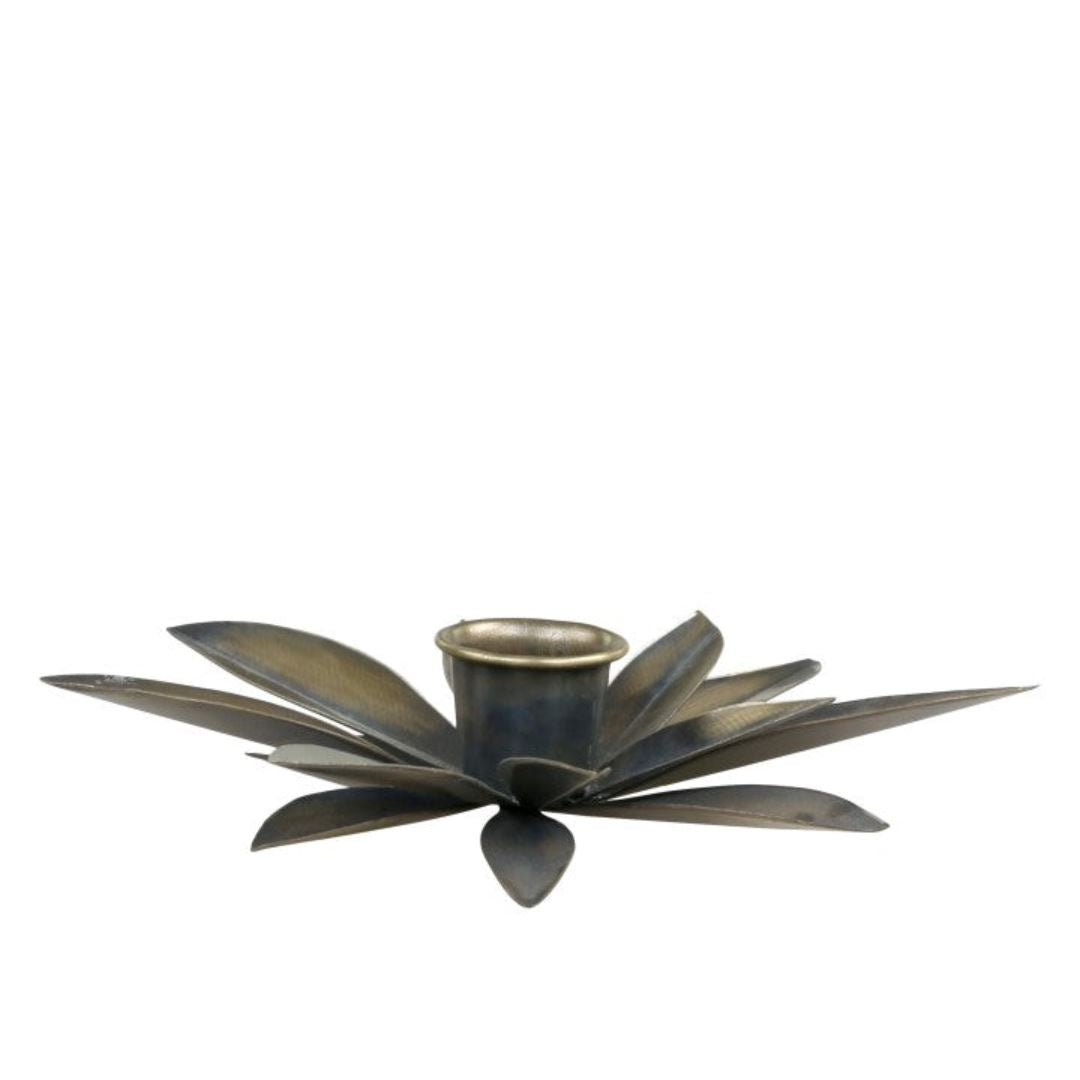 Ce délicat petit bougeoir en forme de lys est un joli petit buffet pour les salles à manger, ou même pour une table d'appoint de salon. Fabriquée à partir de fines feuilles de fer, c'est une pièce délicate dotée de pétales de couleur laiton rayonnant depuis un bougeoir central. Associez-le au bougeoir à fleurs moyennes et au bougeoir à grandes fleurs pour un délicieux trio.