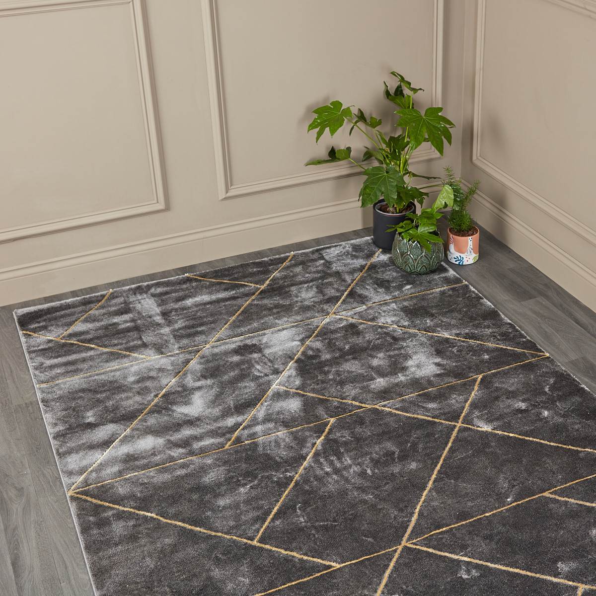 Un tapis sombre et séduisant, parfait pour un salon sophistiqué ! Le motif géométrique doré contraste parfaitement avec le fond marbré gris foncé, créant une finition luxueuse qui est également très douce sous les pieds. Fabriqué à partir d'un mélange de polypropylène et de polyester, ce tapis résistant survivra à l'usure de la vie de famille et créera également une fabuleuse ambiance de soirée.