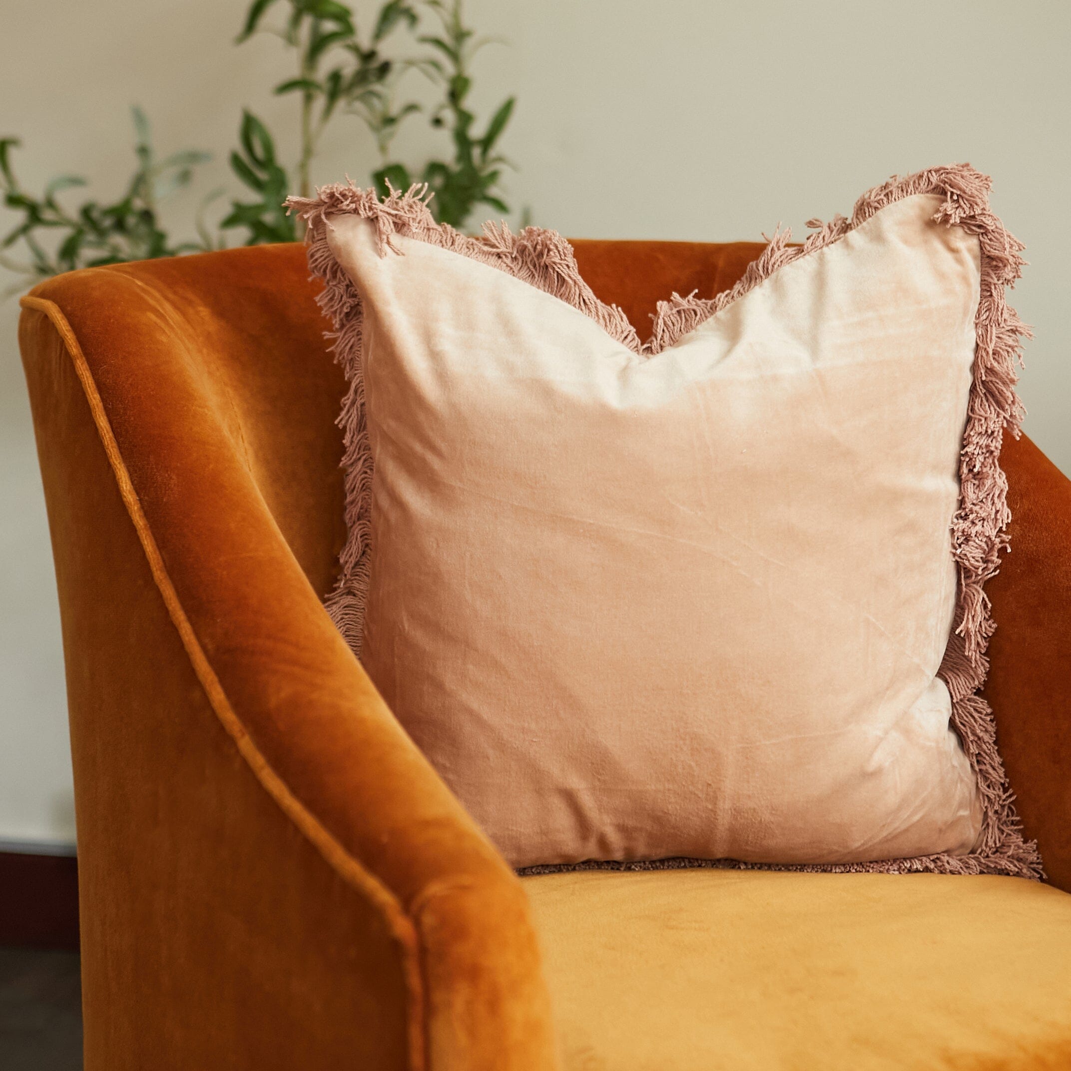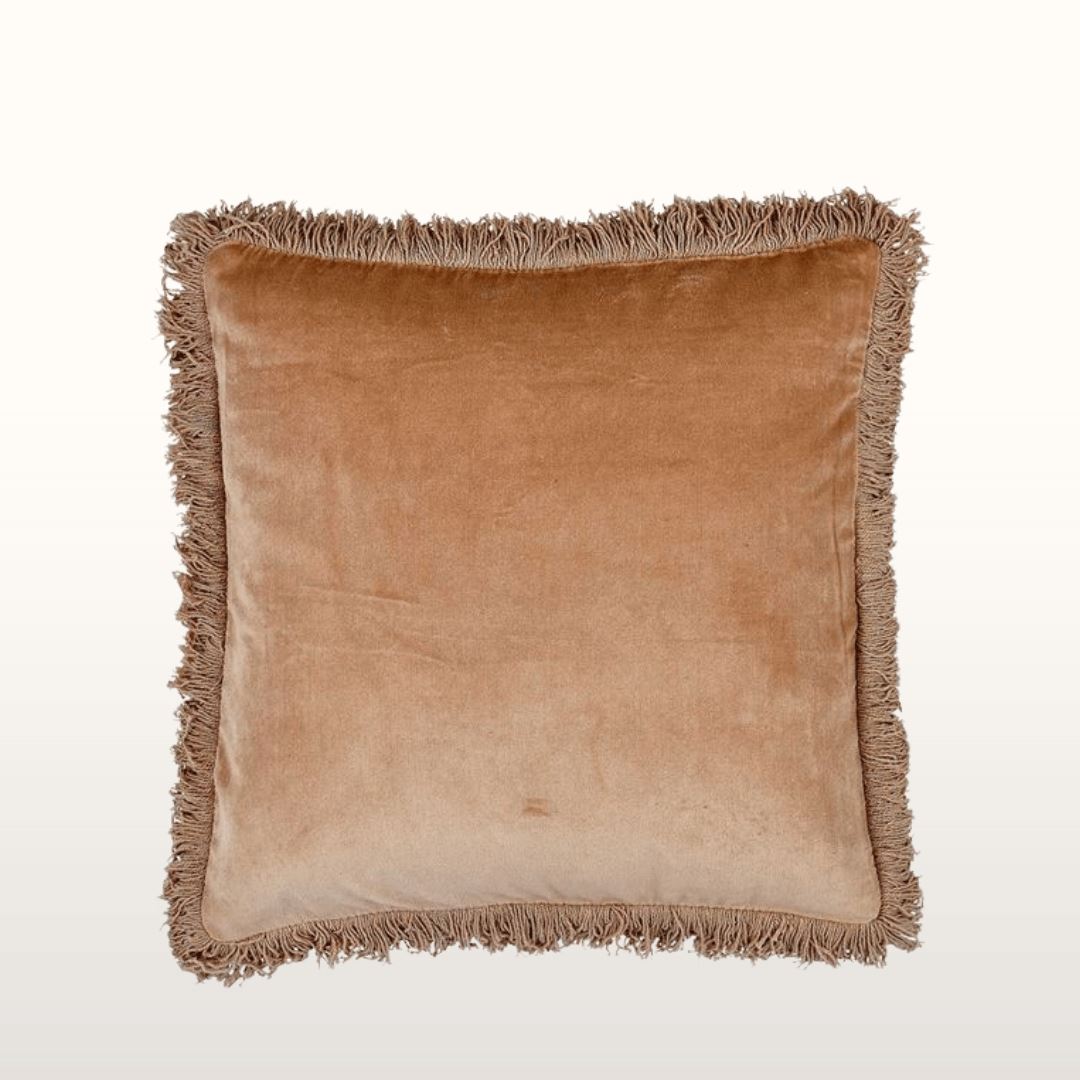 Add a little bit of luxury to your sofa situation with this lovely plump fringed cushion. The soft velvet combined with the gorgeous thick fringed sides make this cushion a luscious piece to sink into and the mellow tan shade is a warm addition that will blend beautifully with most colour schemes but we think work particularly well with similar warm tones. The filler is feather making this cushion easy to plump!