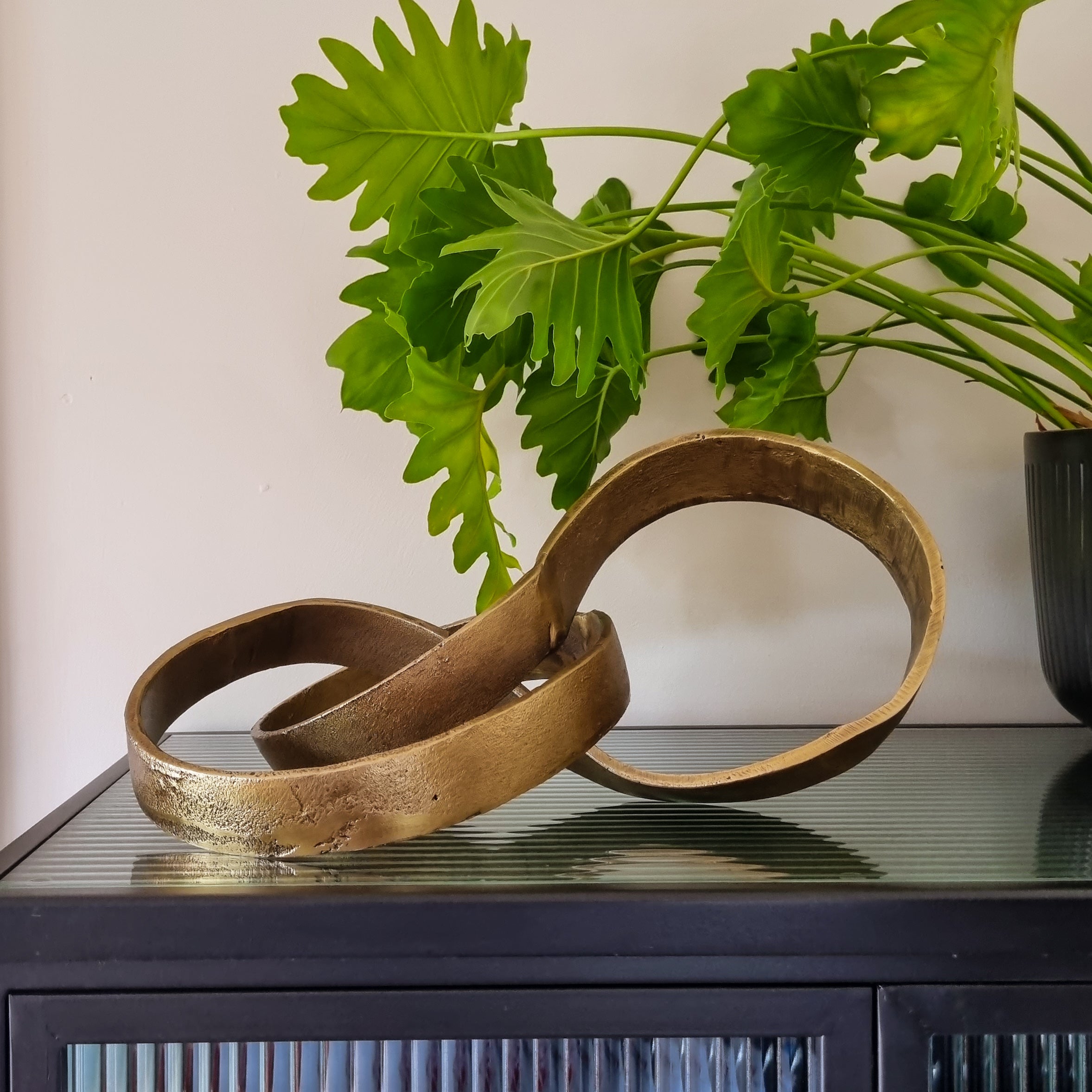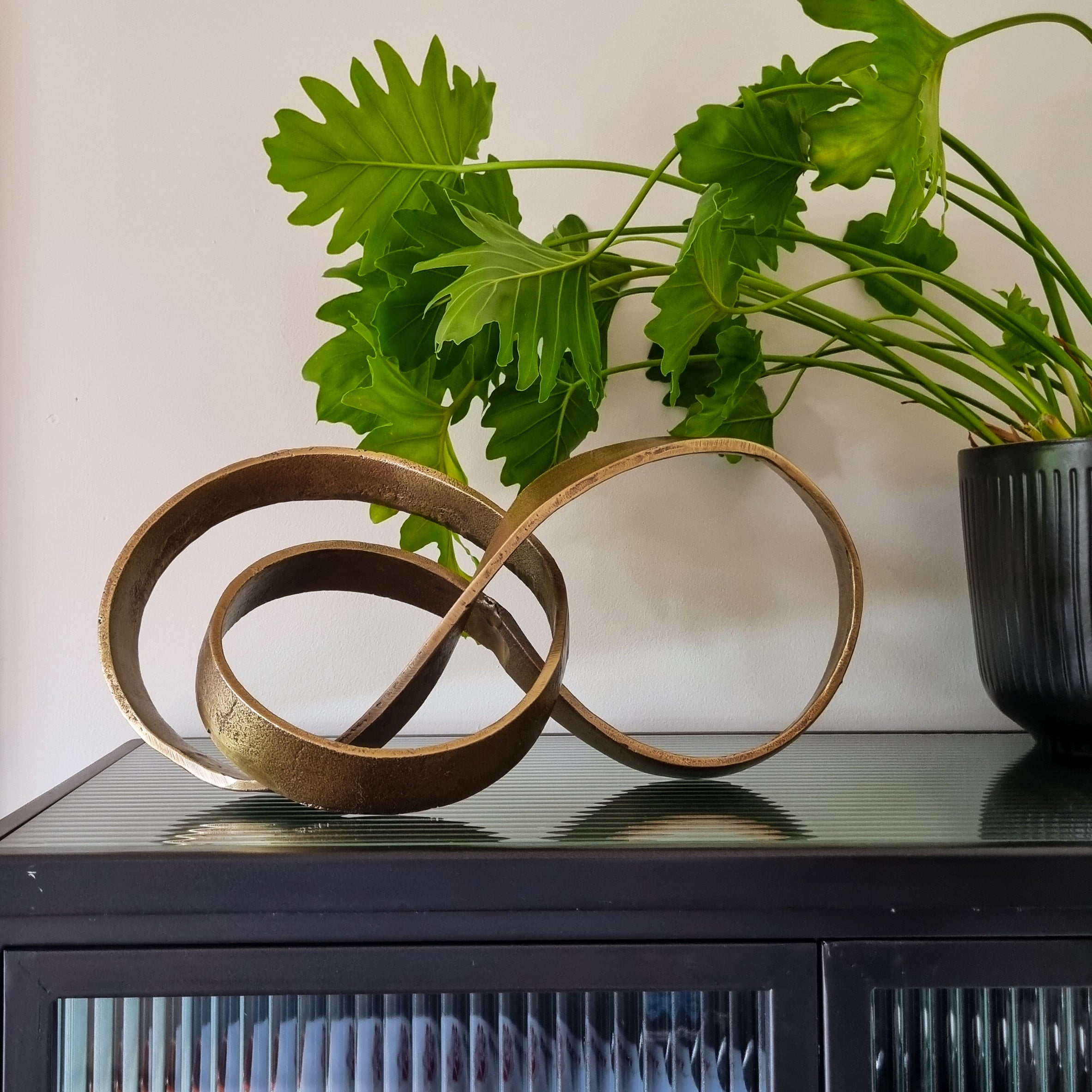 Il s’agit d’une sculpture infinie apaisante et inspirante à l’infini. Cette pièce à effet laiton offre un joli contrepoint organique au contour linéaire de vos meubles et est exactement ce que vous recherchez pour créer un intérêt visuel avec une belle continuité. Pourquoi ne pas habiller le dessus de l'un de nos buffets ou armoires (comme nous l'avons ici sur notre armoire à 2 portes ) et y ajouter une plante verte luxuriante.