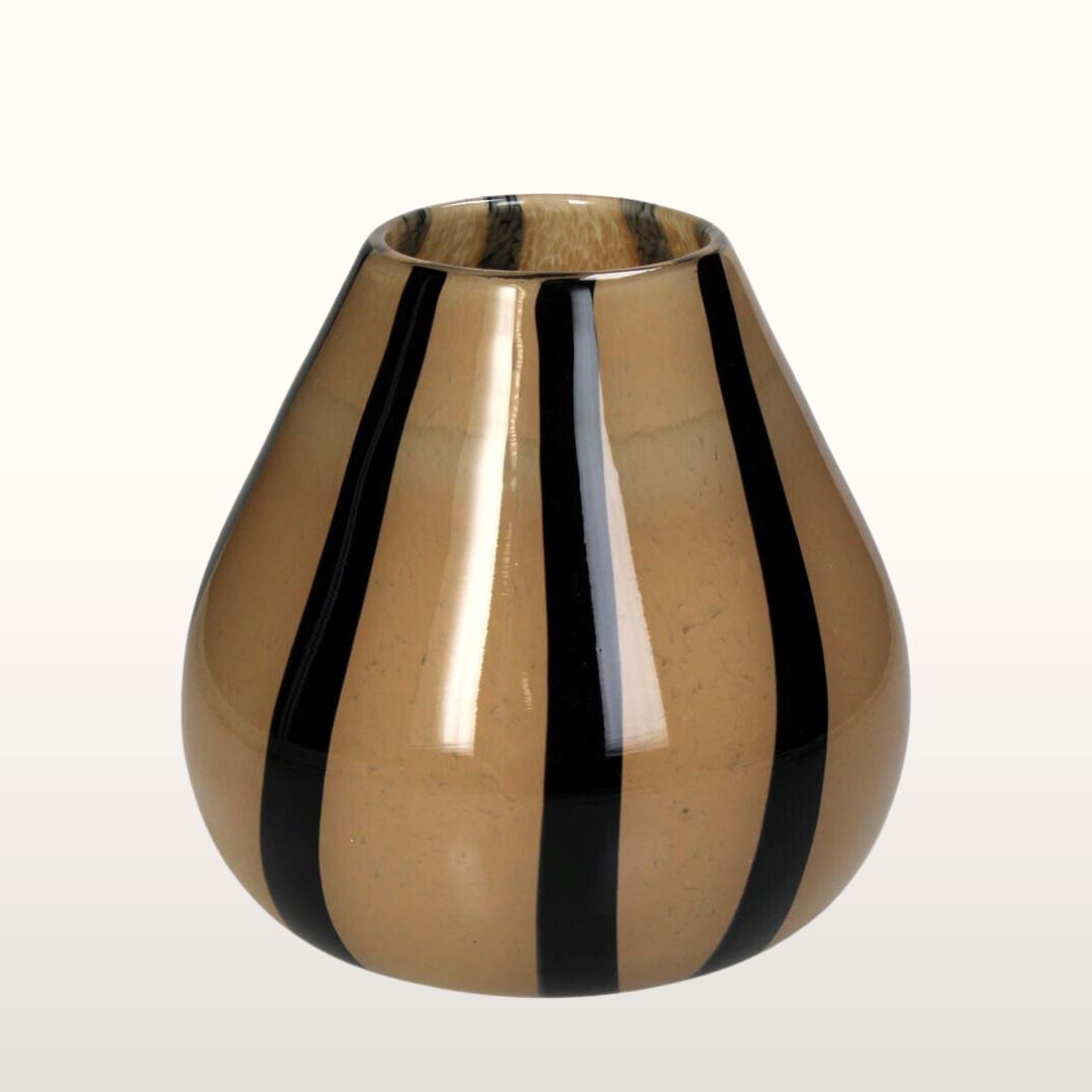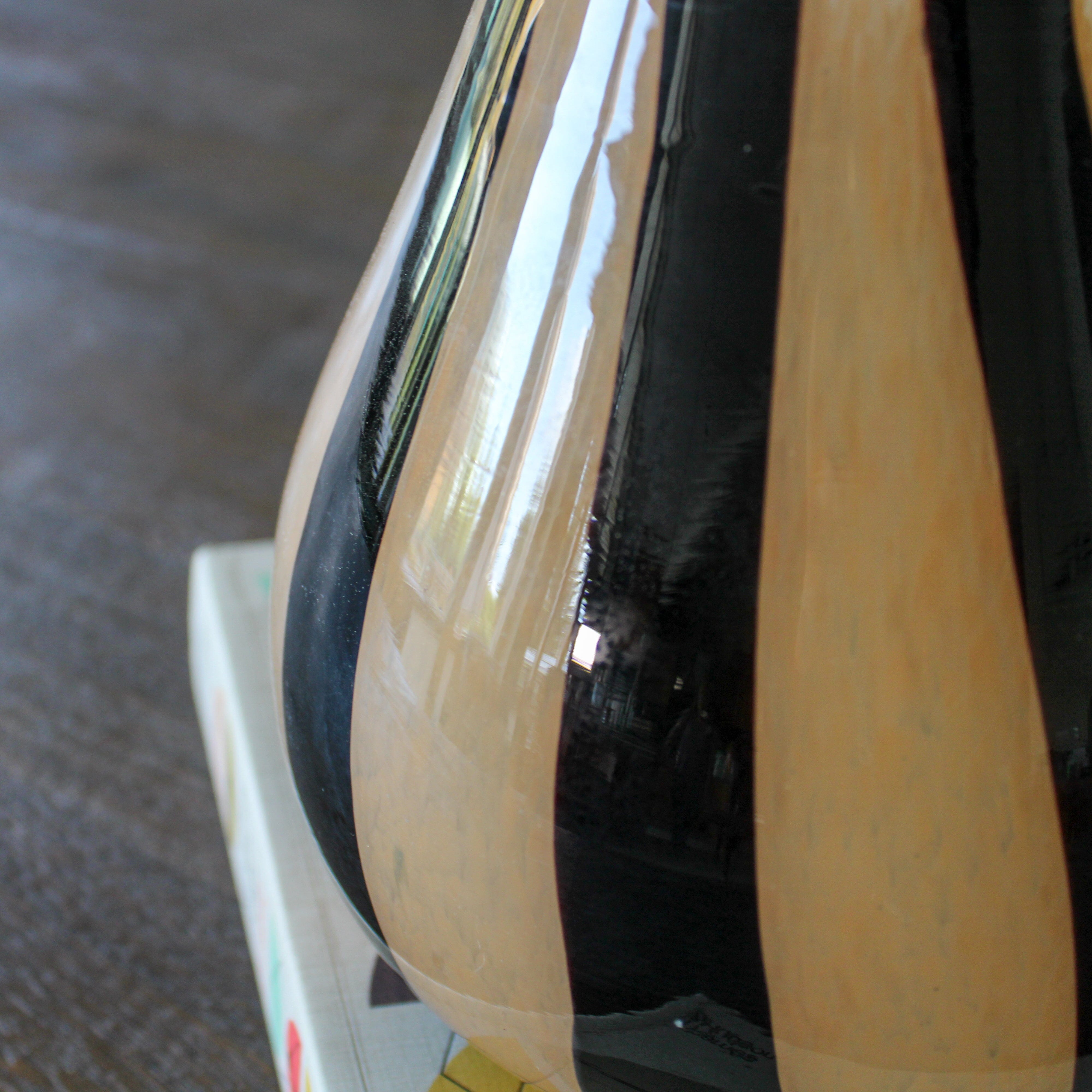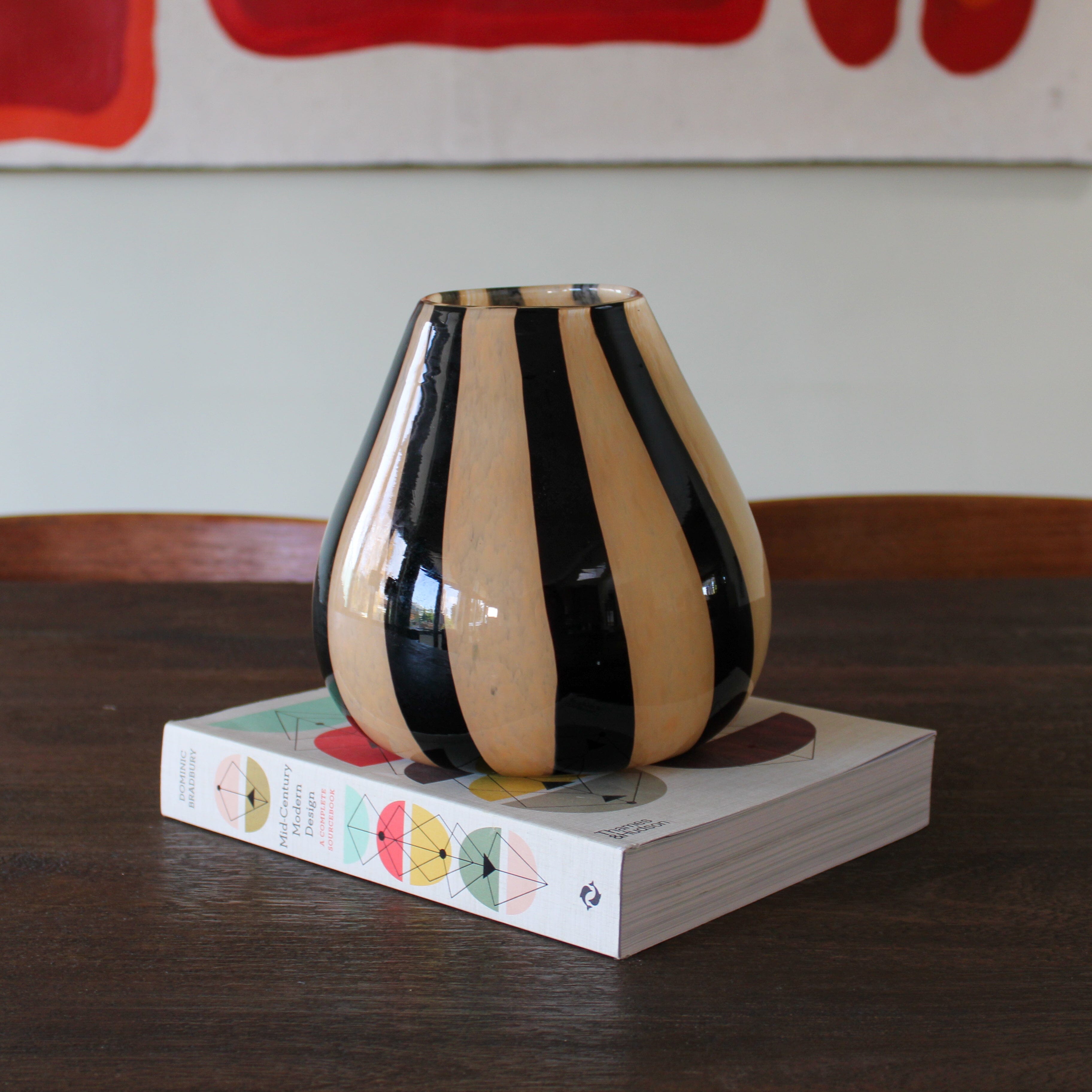 Il s’agit d’un vase rayé plutôt frappant et tout à fait inattendu, fabuleux, qui a une certaine présence qui aurait plutôt fière allure niché sur une étagère parmi les livres. La forme est en forme de bulbe et légèrement organique, rehaussée par les rayures brunes sur le fond tacheté pêche. Il s’agit d’un vase saisissant et s’il est rempli d’un bouquet de fleurs fraîches, il pourrait constituer une véritable pièce décorative.