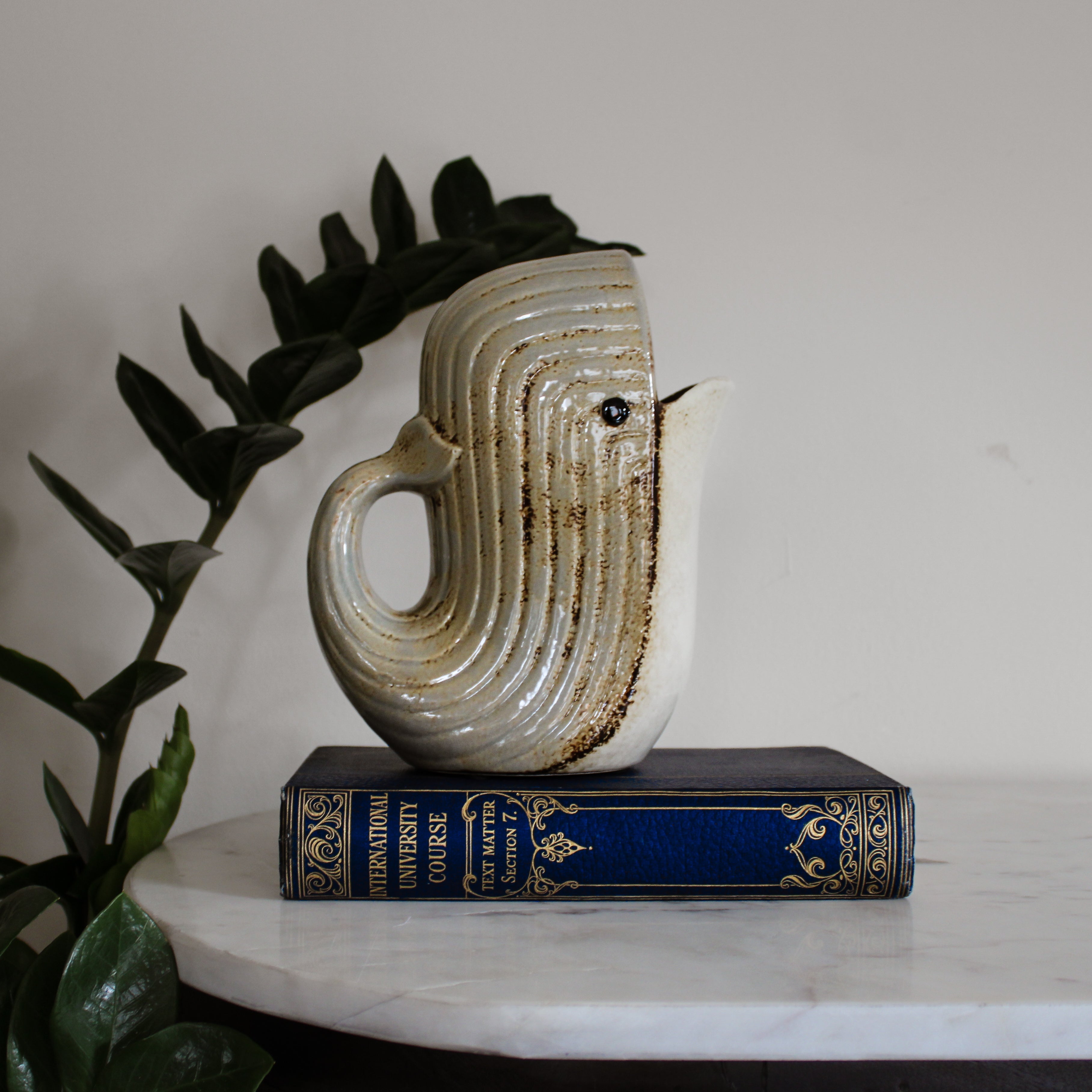 Quel petit délice c'est ! Ce fabuleux pichet baleine est une joie à voir, à parts égales de fonction et de forme. Nous adorons la magnifique finition en terre des faîtes ainsi que la teinte vert-bleu du grès. Posez ce type sur une étagère comme pièce décorative, mettez-lui des fleurs dans la bouche ou utilisez-le à table comme pièce parlante fonctionnelle ! Cela ferait un excellent cadeau de pendaison de crémaillère pour un nouveau propriétaire au bord de la mer, ou simplement pour quelqu'un avec un sens du style original !