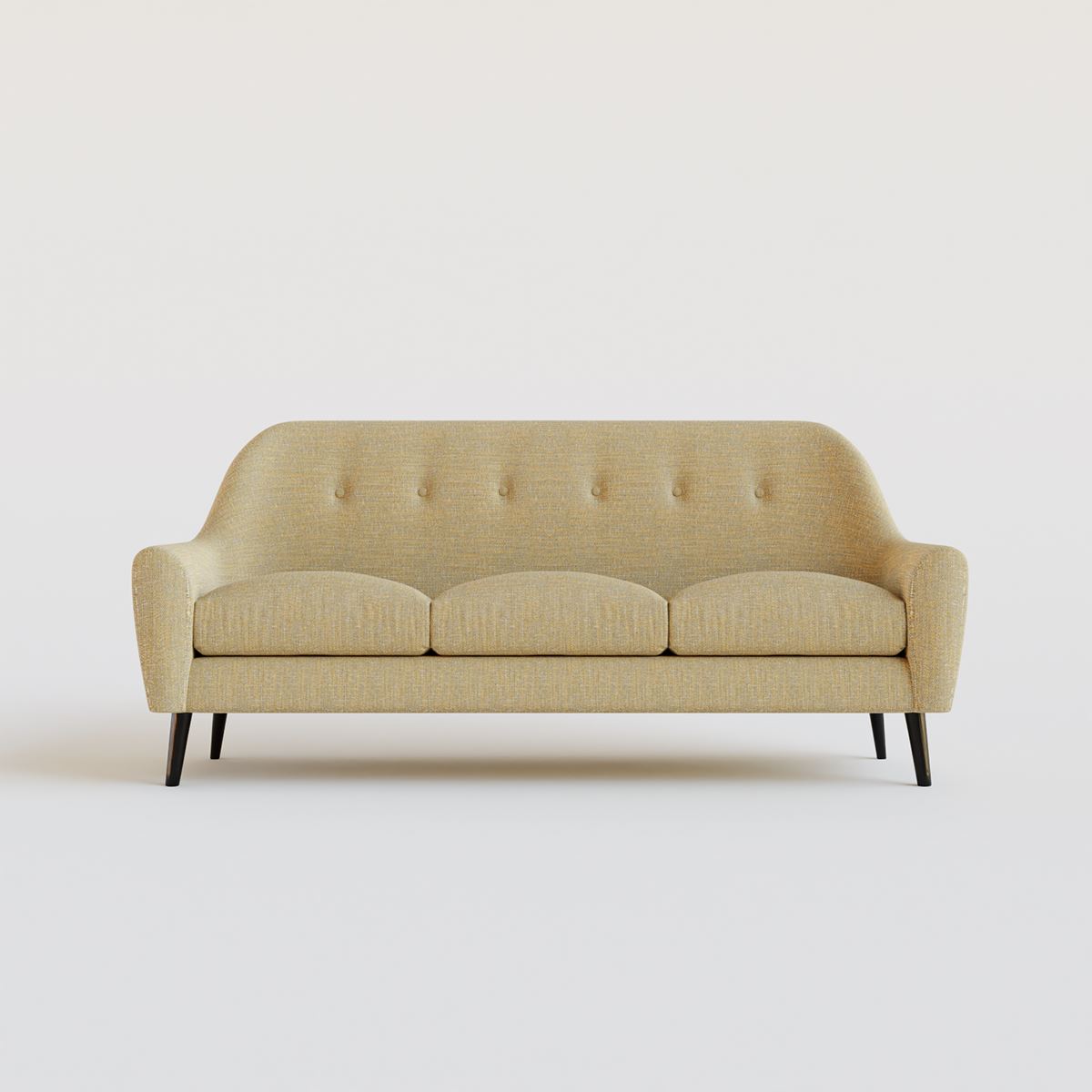 Ce magnifique canapé inspiré des années 1950 a tout pour plaire : un magnifique tissu en velours vert, une forme incurvée douce, des pieds joliment tournés, des coussins confortables et un joli dossier boutonné. Les proportions de ce canapé lui confèrent une ambiance chaleureuse et décontractée, mais avec beaucoup de style. Le dossier plus haut permet de reposer facilement votre tête et les accoudoirs bas sont parfaits si vous souhaitez vous étirer. Ce canapé fait main est conçu pour injecter des doses égales de douceur et de confort directement dans votre salon !