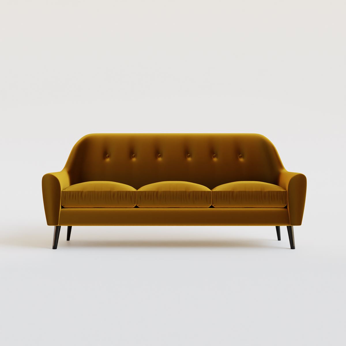 Ce magnifique canapé inspiré des années 1950 a tout pour plaire : un magnifique tissu en velours vert, une forme incurvée douce, des pieds joliment tournés, des coussins confortables et un joli dossier boutonné. Les proportions de ce canapé lui confèrent une ambiance chaleureuse et décontractée, mais avec beaucoup de style. Le dossier plus haut permet de reposer facilement votre tête et les accoudoirs bas sont parfaits si vous souhaitez vous étirer. Ce canapé fait main est conçu pour injecter des doses égales de douceur et de confort directement dans votre salon !