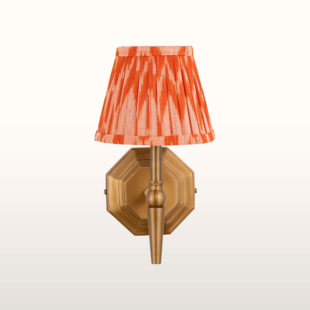 This beautiful wall light is part of the exclusive Oriana B range.  Designed by Oriana B, this wall light has a brass single arm fixed to an octagonal brass plate and topped with a decorative orange pleated lampshade.  This is the perfect lamp for a bedside or in a compact space such as small hallway or bathroom.