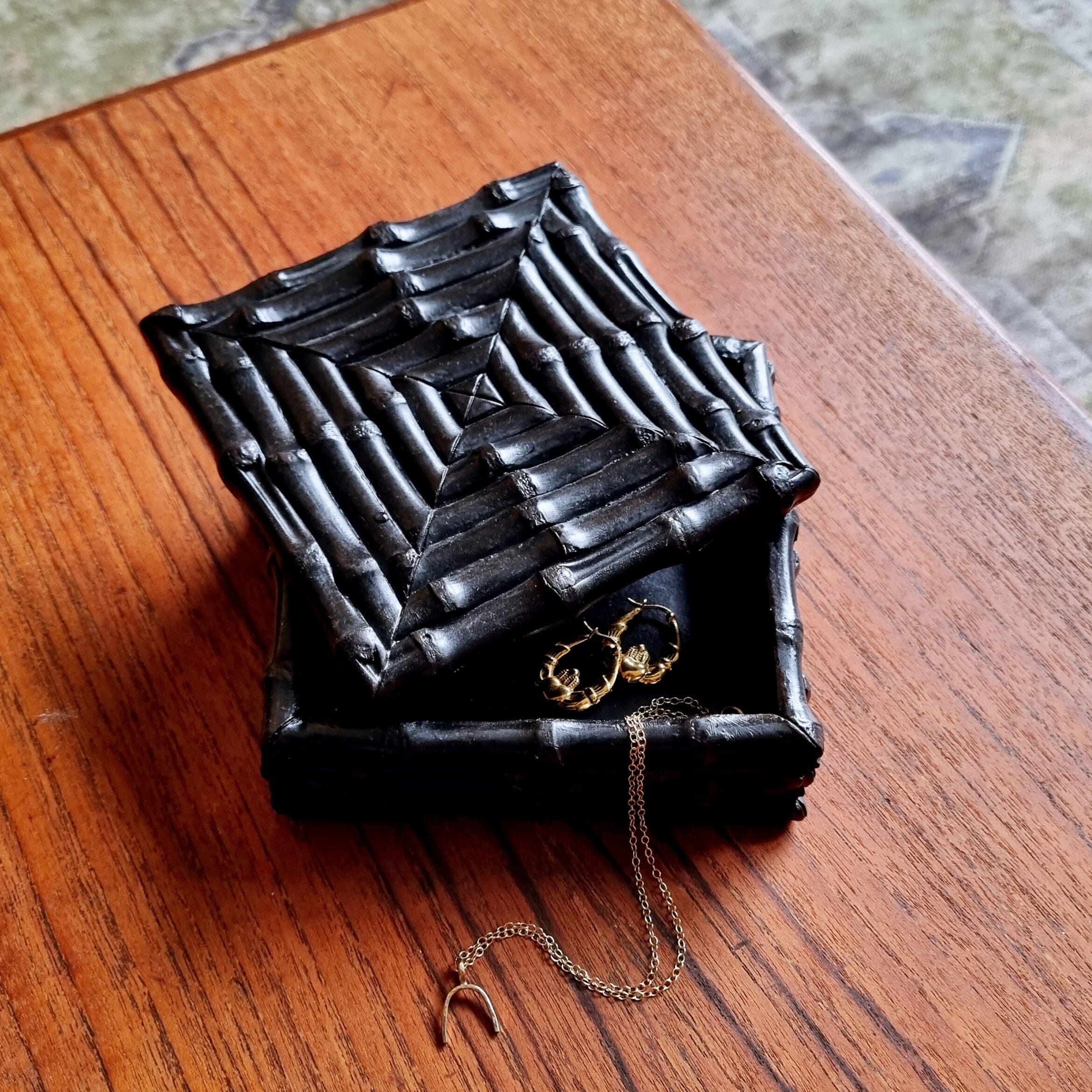 Cette boîte à bijoux noire effet bambou est un rêve de table de chevet ! C'est la petite pièce parfaite pour garder vos bibelots de nuit ou ranger vos bijoux jusqu'à ce qu'il soit temps de redevenir glamour. Nous adorons la finition texturée effet bambou qui donne à cette pièce moderne une sensation rustique et texturée. Il aurait fière allure sur une étagère placée sur des livres cartonnés monochromes pour un style d'étagère chic.