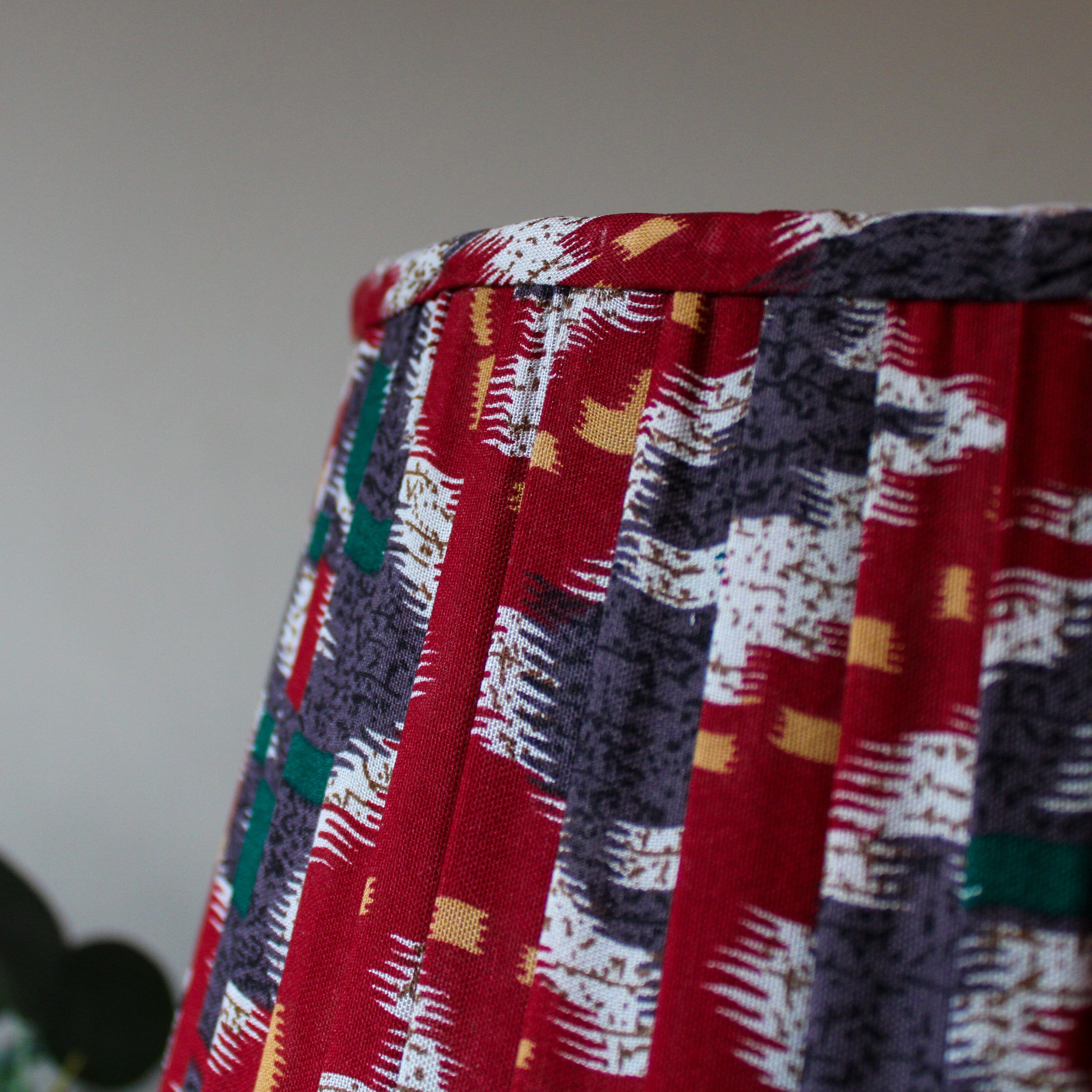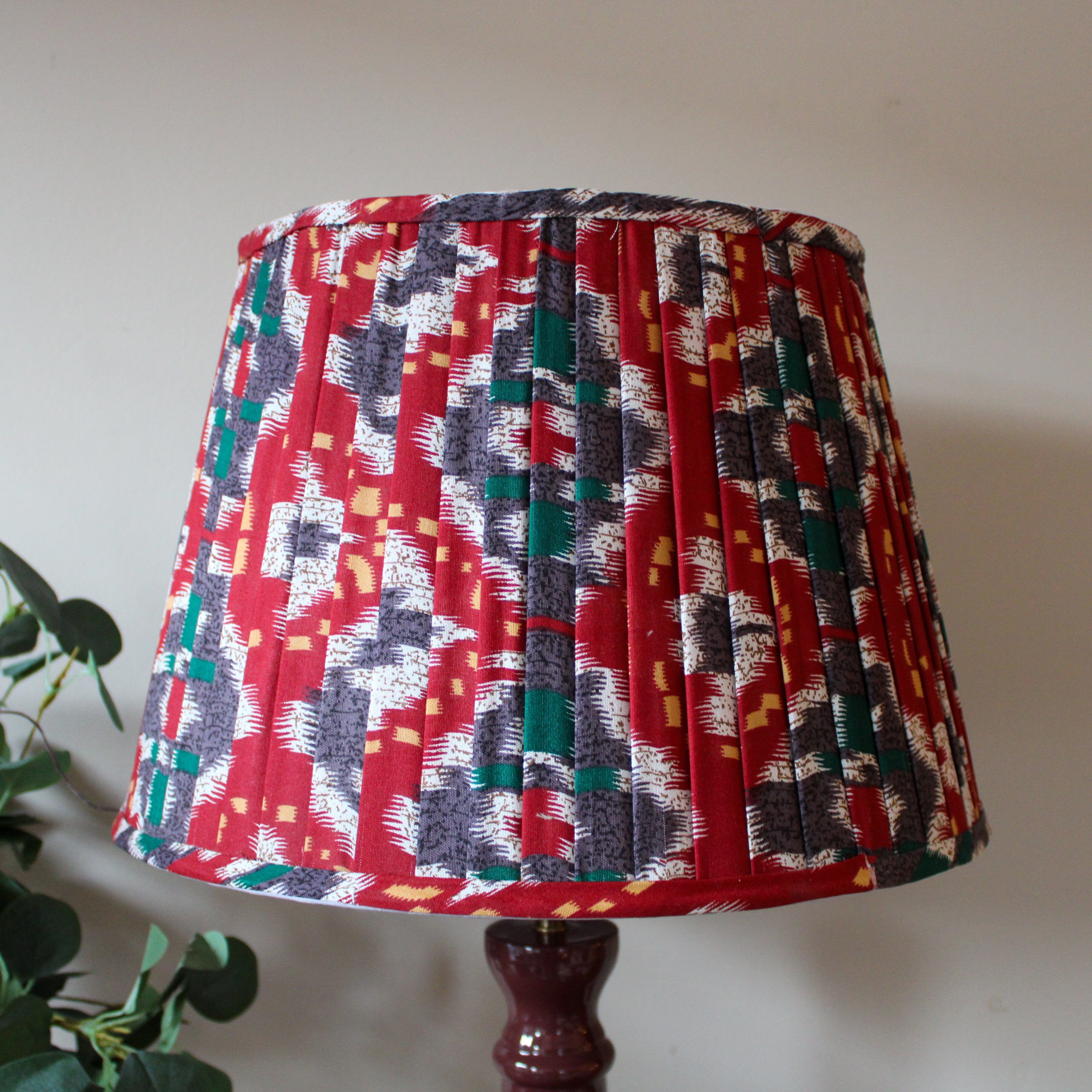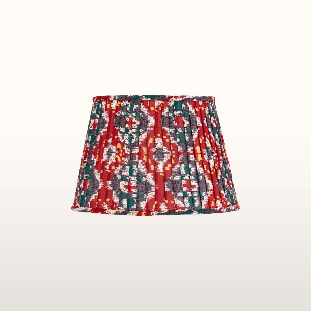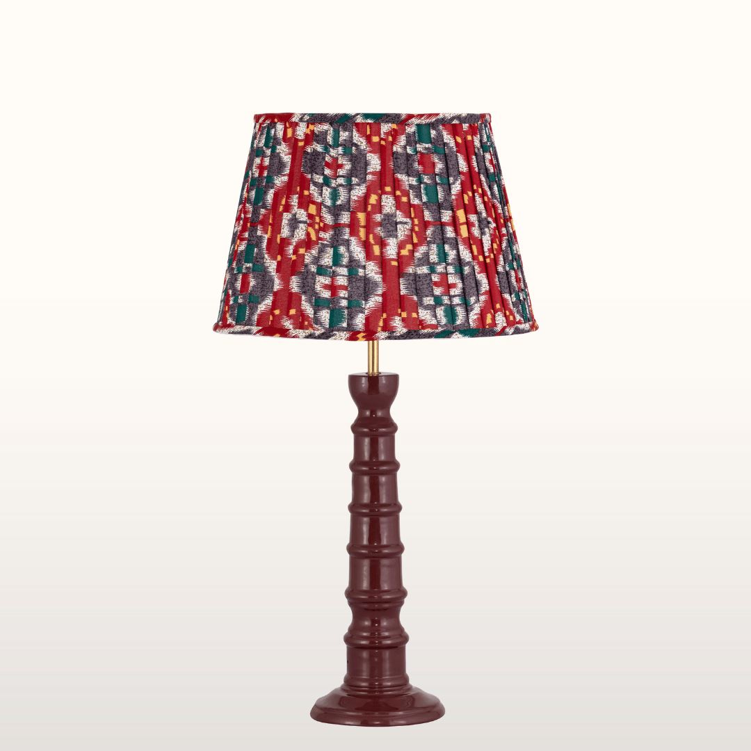 Enrich your home with our stunning burgundy enamel table lamp topped with a beautiful red and blue pleated shade. This profoundly warm and cosy table lamp will add a real sense of style to your home with colour, texture and detail perfectly in balance. The base is tactile to the touch with circular ridges which complements the pretty pleating of the shade. A lovely lamp ideal for a living room, bedroom, dining room or hallway.