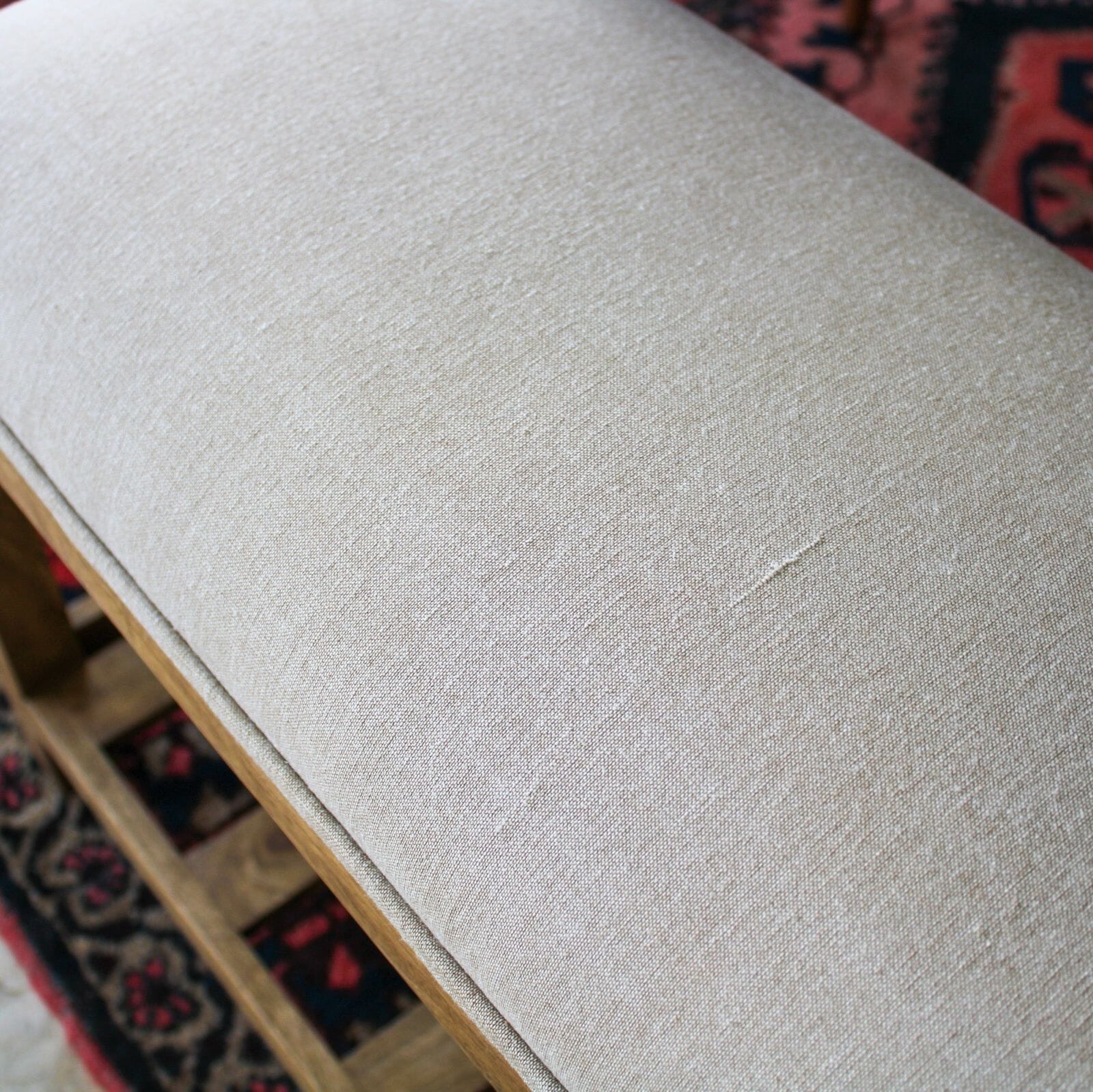 Ce joli banc est la quintessence du style décontracté. Il s'agit d'un banc étroit de seulement 31 cm de profondeur qui s'intégrera confortablement dans des espaces plus petits et est donc idéal pour un petit couloir ou au bout d'un lit. Il est doté d'une étagère inférieure, idéale pour ranger des chaussures ou des paniers de rangement en osier, et d'un siège rembourré en lin blanc cassé. Le bel effet solide donne à cette pièce une ambiance éternelle qui ajoutera une sensation de luxe tranquille à votre maison.