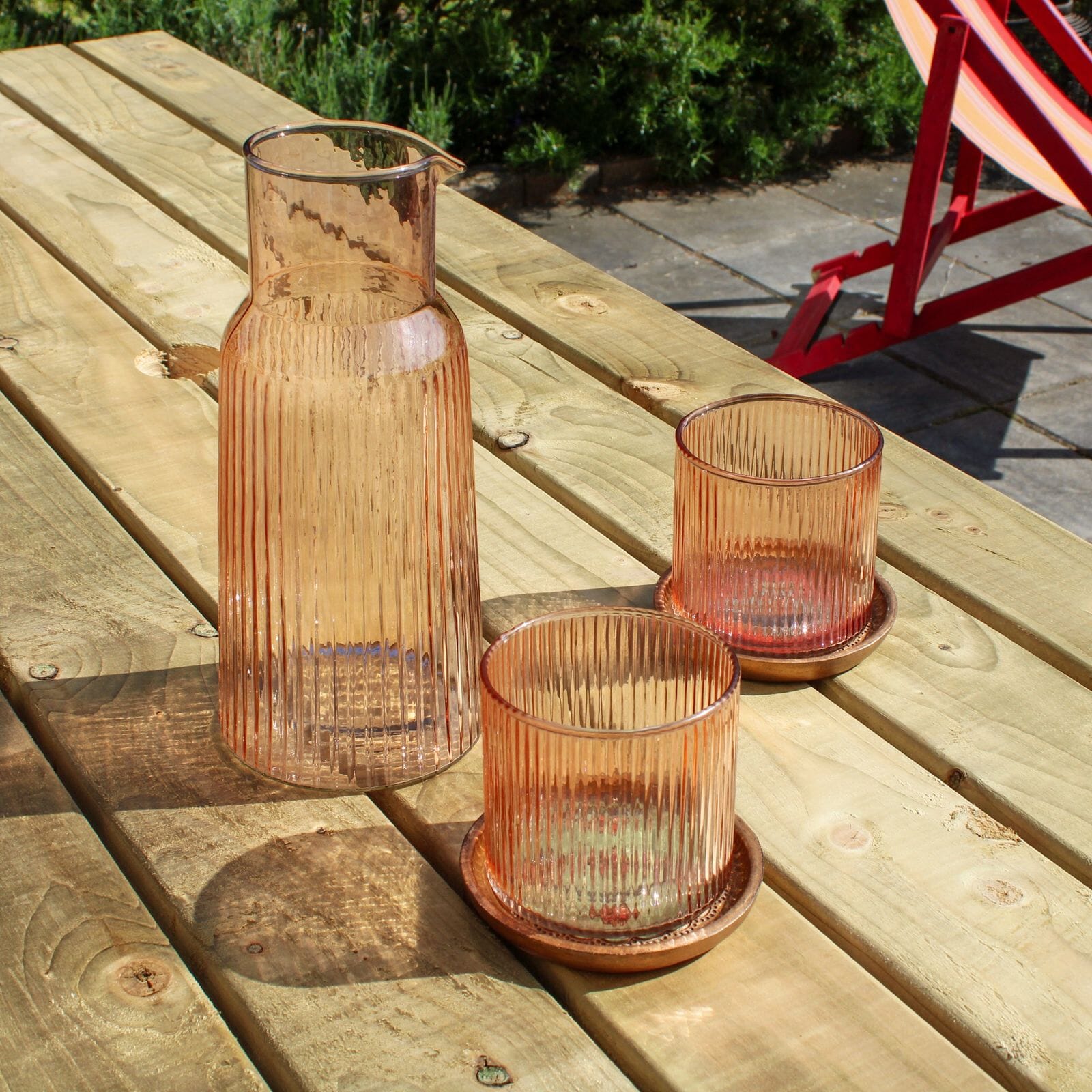 Parfaite pour servir des boissons estivales rafraîchissantes, notre carafe en verre nervuré est dotée d'un charmant verre aux tons pêche qui sera le complément parfait à votre table d'été. Avec sa forme ergonomique et sa capacité de 1 litre, cette jolie carafe sera un moyen confortable et élégant de transporter votre limonade préférée, votre eau ou même de délicieux cocktails d'été à vos invités assoiffés cet été ! Associez-le au gobelet en verre nervuré de l’ensemble, ce qui ferait le cadeau parfait pour les hôtes d’une garden-party !