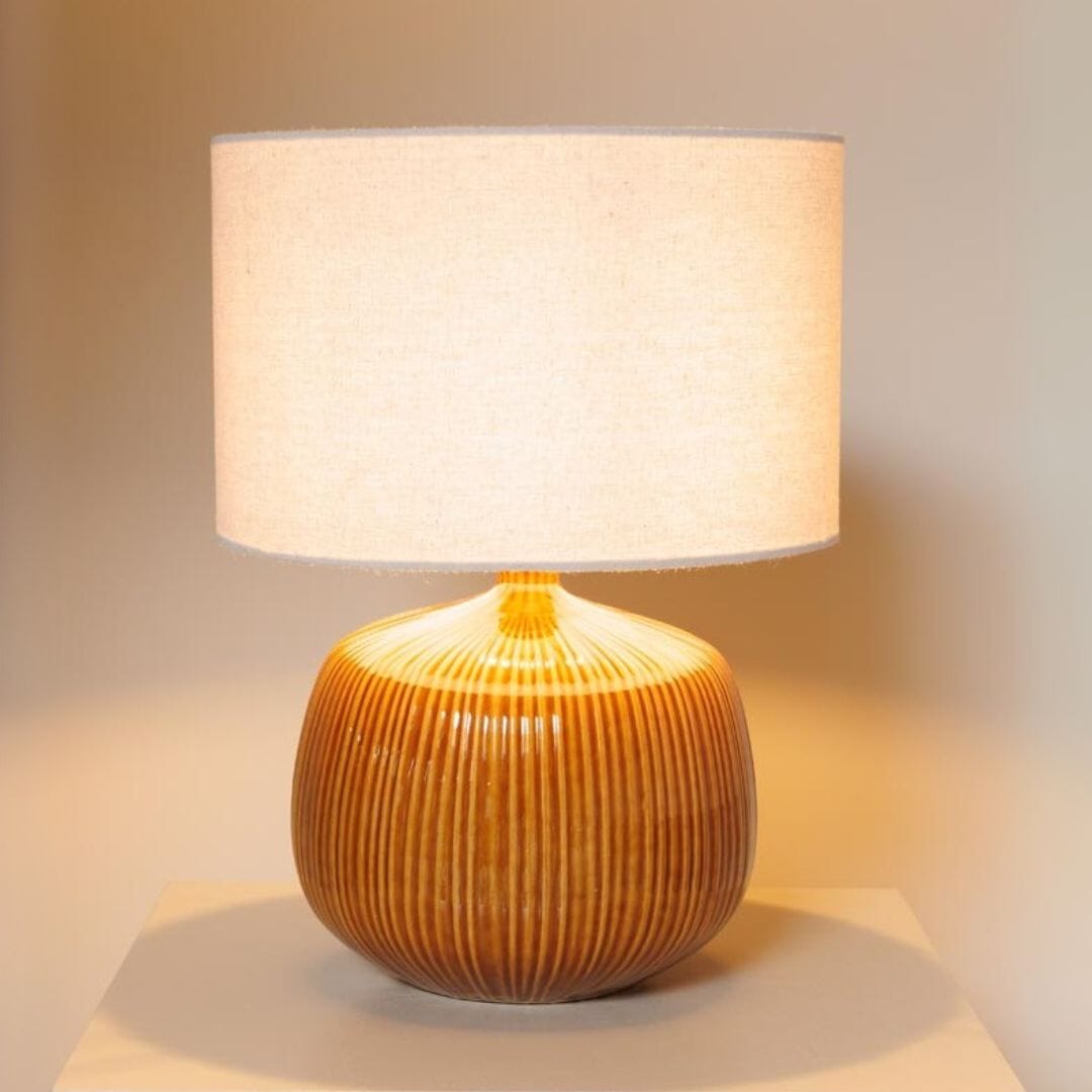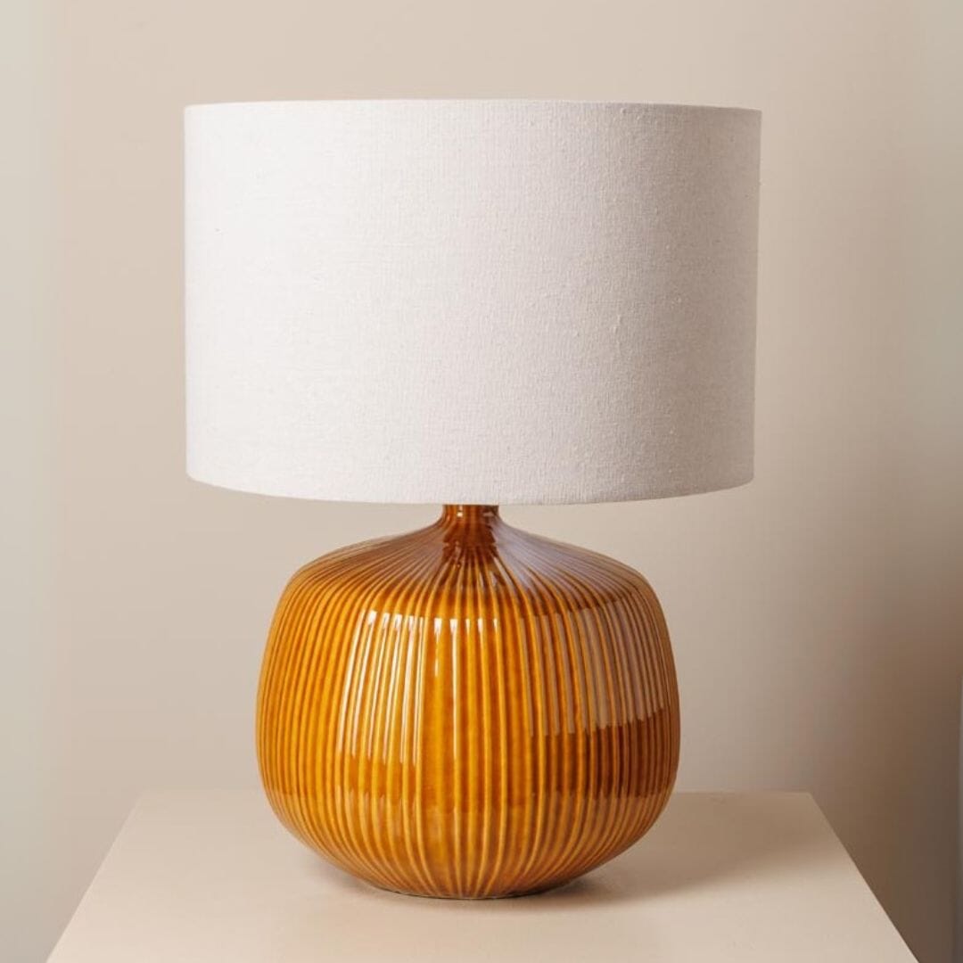 This gorgeous table lamp has us swooning. The sandstone base is a ridged squoval shape which is tactile to the touch and fabulously created in a warm and cosy ochre colour. Topped with a neutral off white linen shade that diffuses light beautifully into your room, this tidy lamp is sure to be a winning addition to your space. Try it out as a bedside, in a living room or even on a kitchen counter for a warm glow.